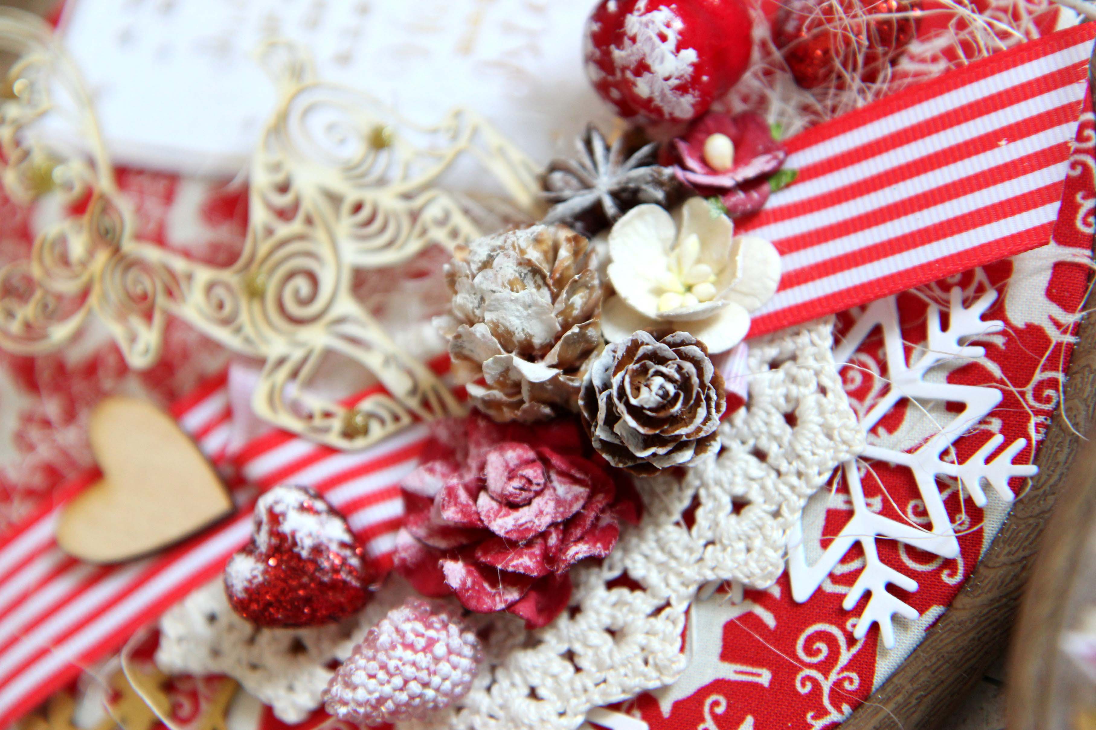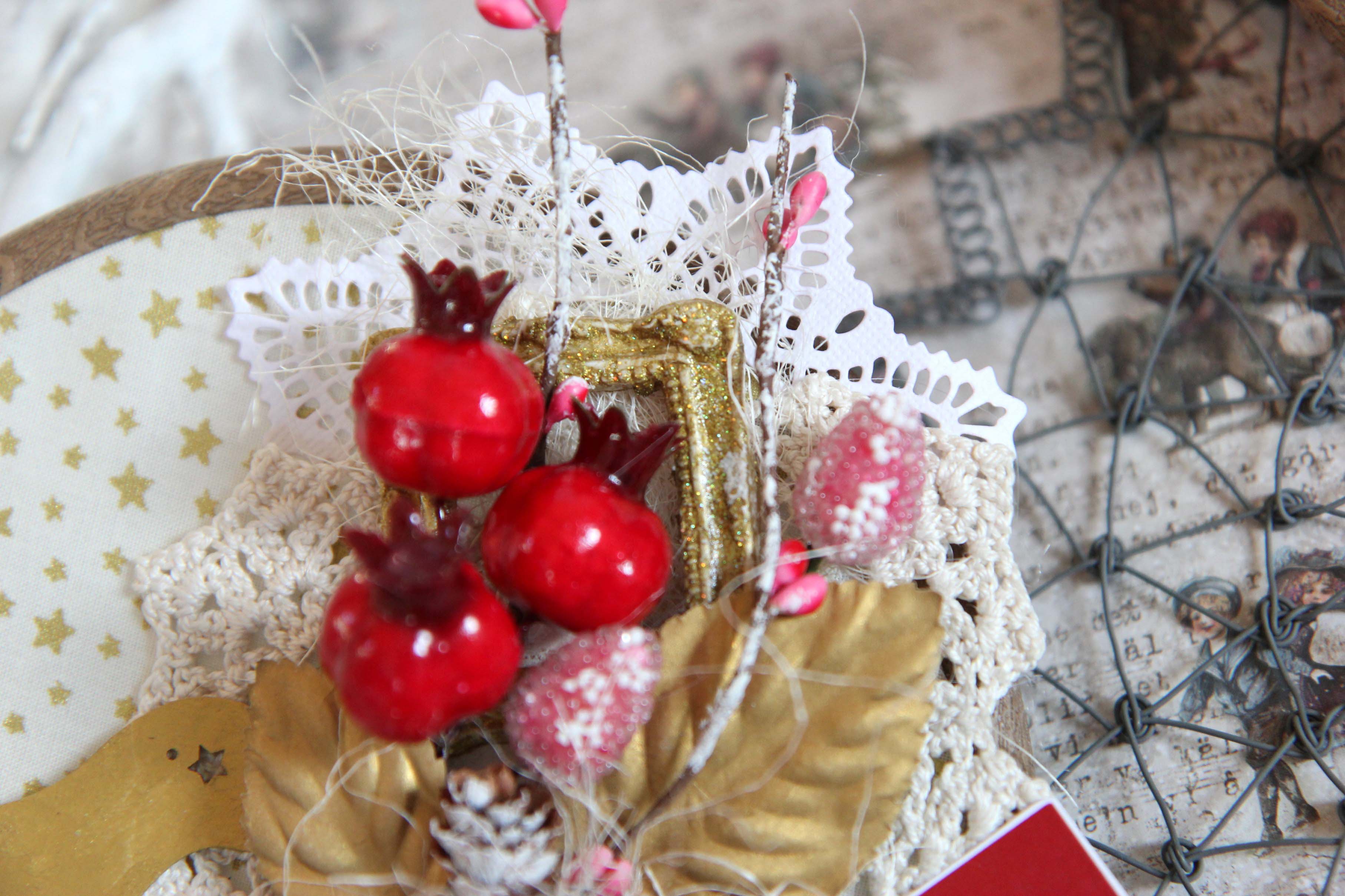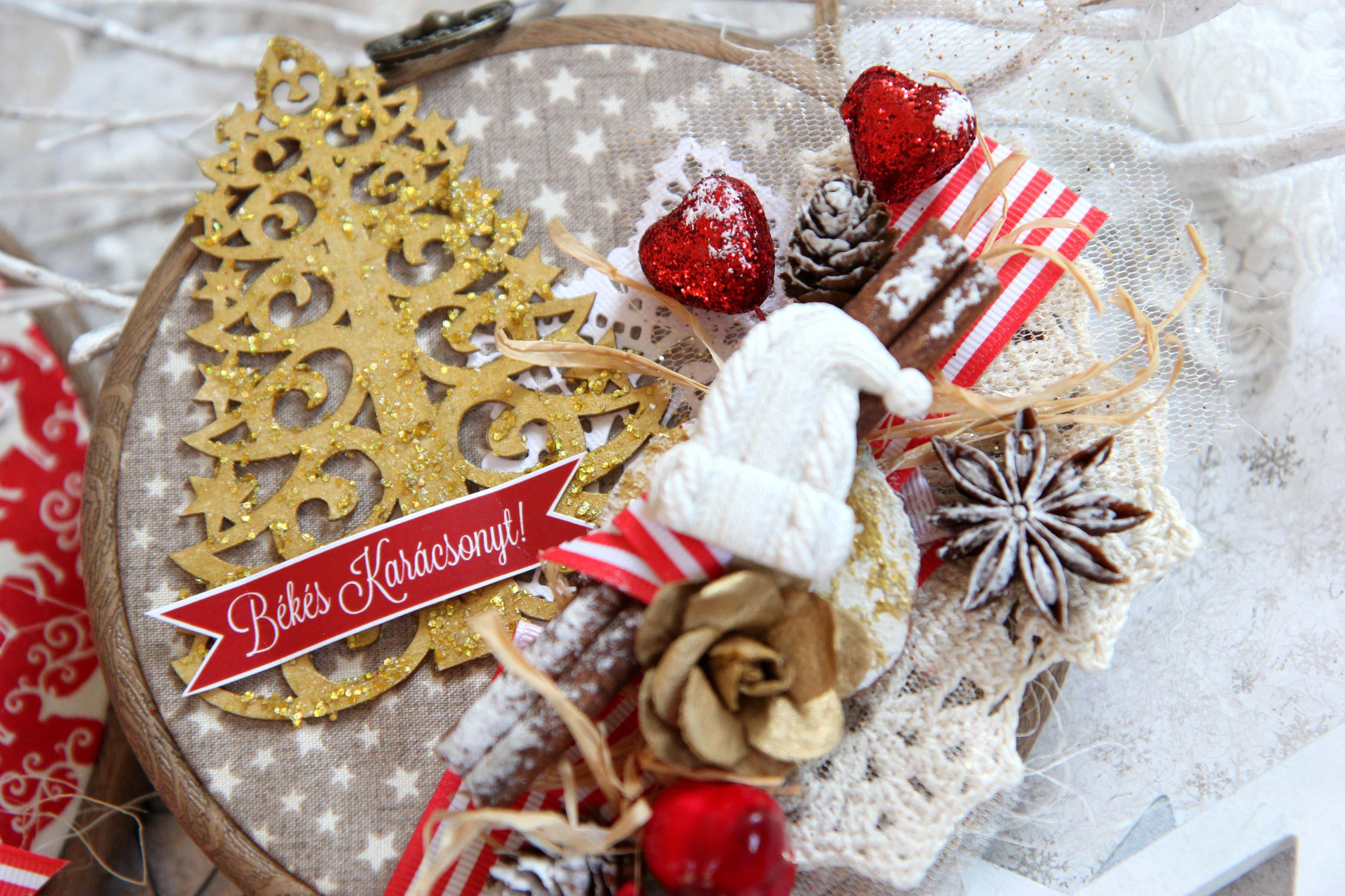 Én használtam sok különböző NCsD csipit, szizált, műanyag bogyot, NCsD címkét, szalagot, kivágott motivumot, tortacsipkét. Majdnem az összes díszt ragasztópisztollyal ragaszattam össze. És a végén száraz ecsettel és fehér akril festékkel kicsit kifestettem a bogyokat és a tobozokat.