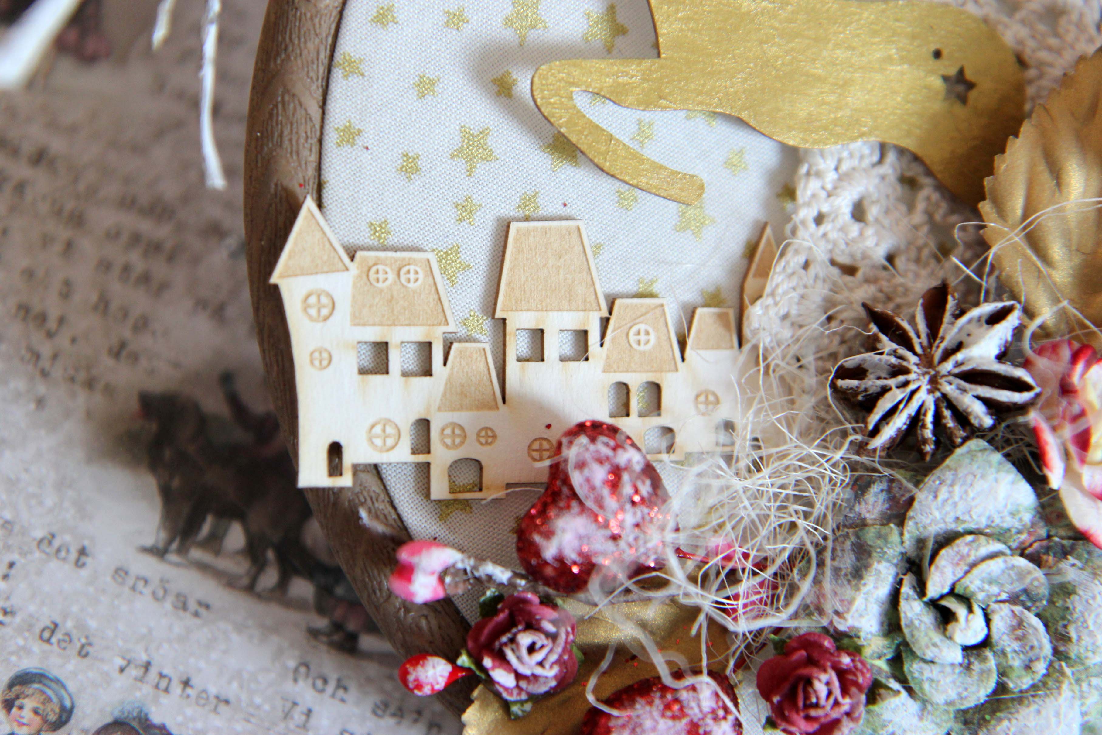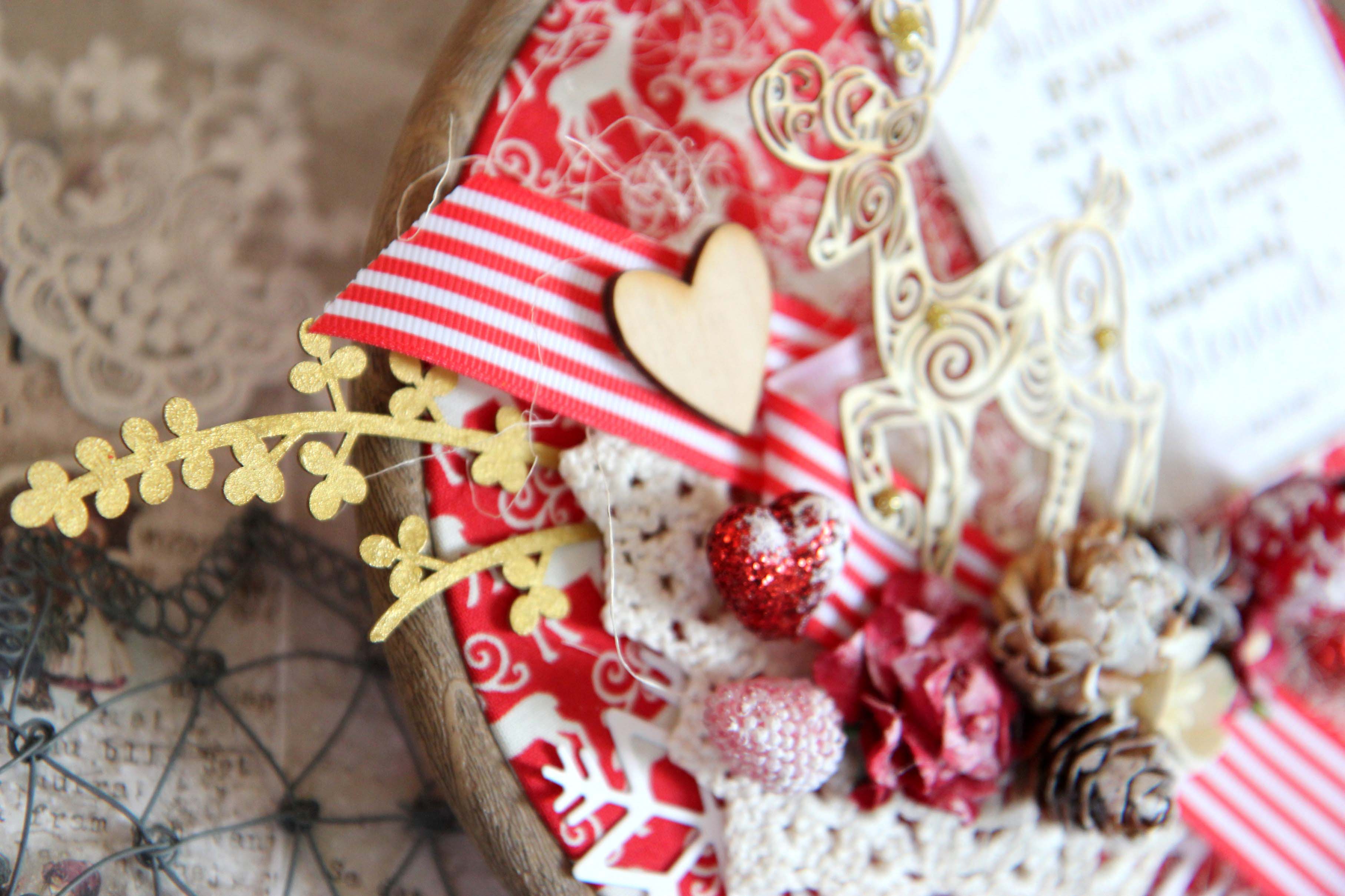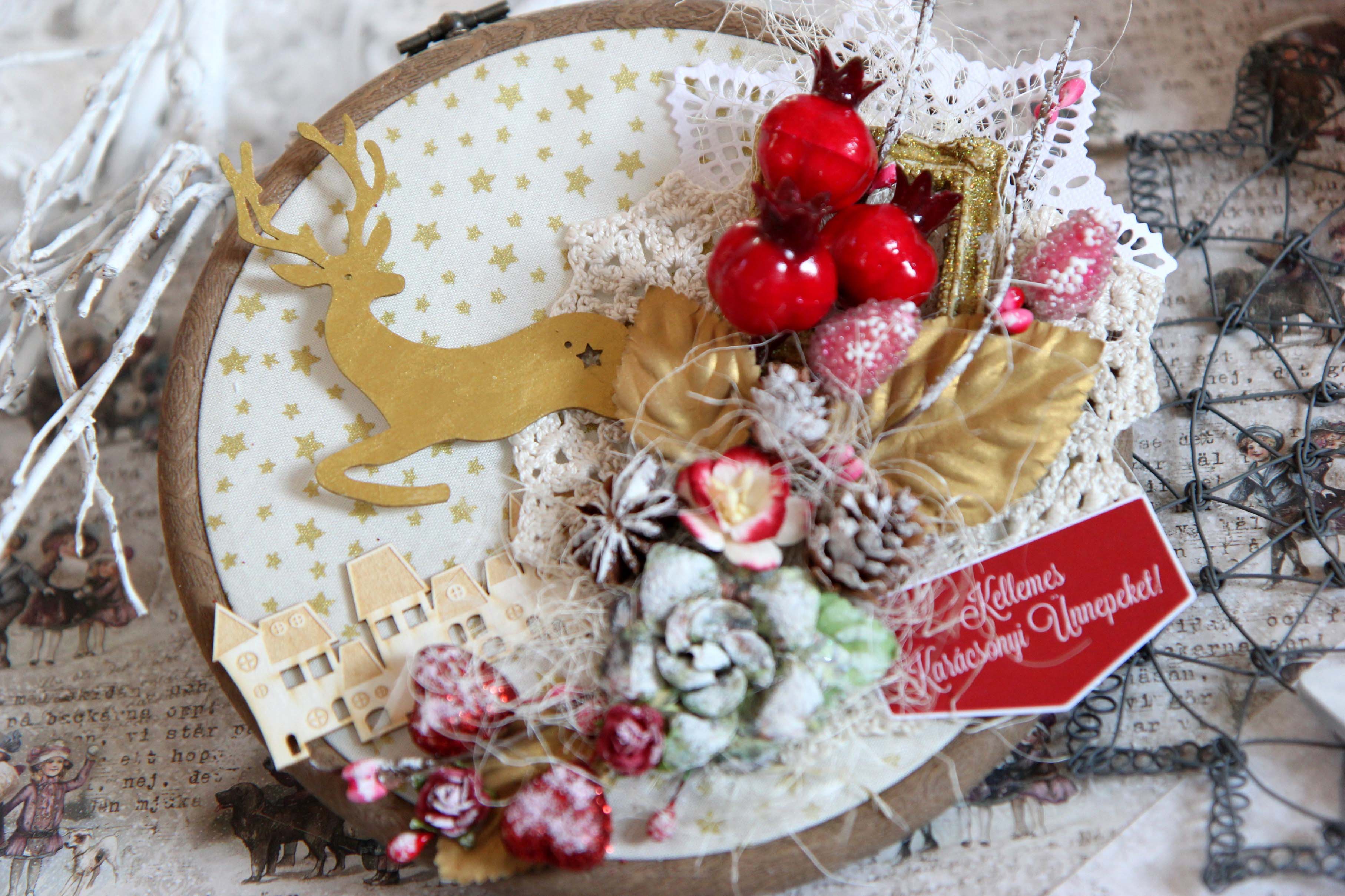 Én használtam sok különböző NCsD csipit, szizált, műanyag bogyot, NCsD címkét, szalagot, kivágott motivumot, tortacsipkét. Majdnem az összes díszt ragasztópisztollyal ragaszattam össze. És a végén száraz ecsettel és fehér akril festékkel kicsit kifestettem a bogyokat és a tobozokat.