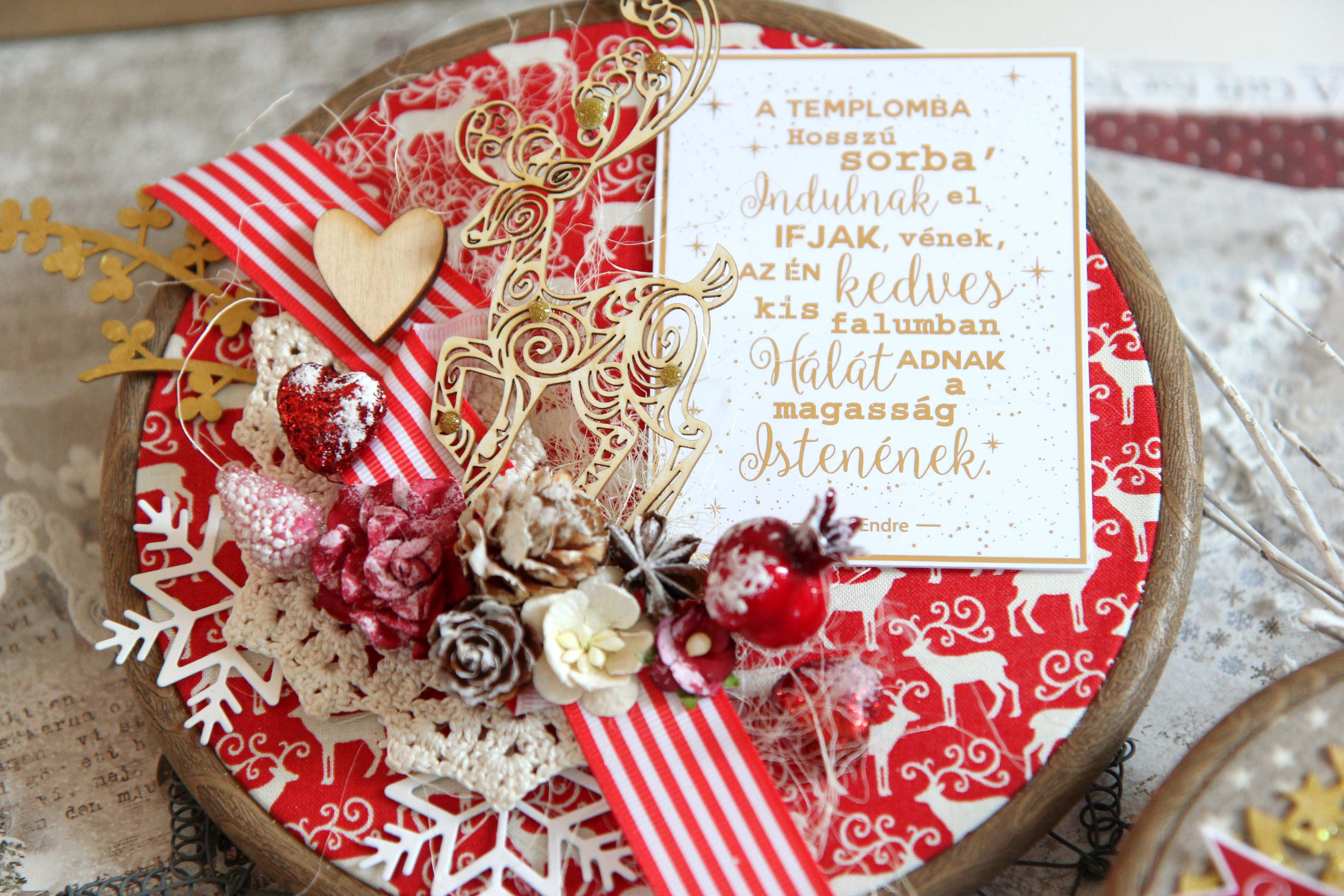 A hímzőrámába bele raktam karácsonyi textil anyagot (de nem muszáj csak karácsonyi textilt berakni, hanem bármit amit úgy gondolsz jól passzol a kiválasztott díszhez).