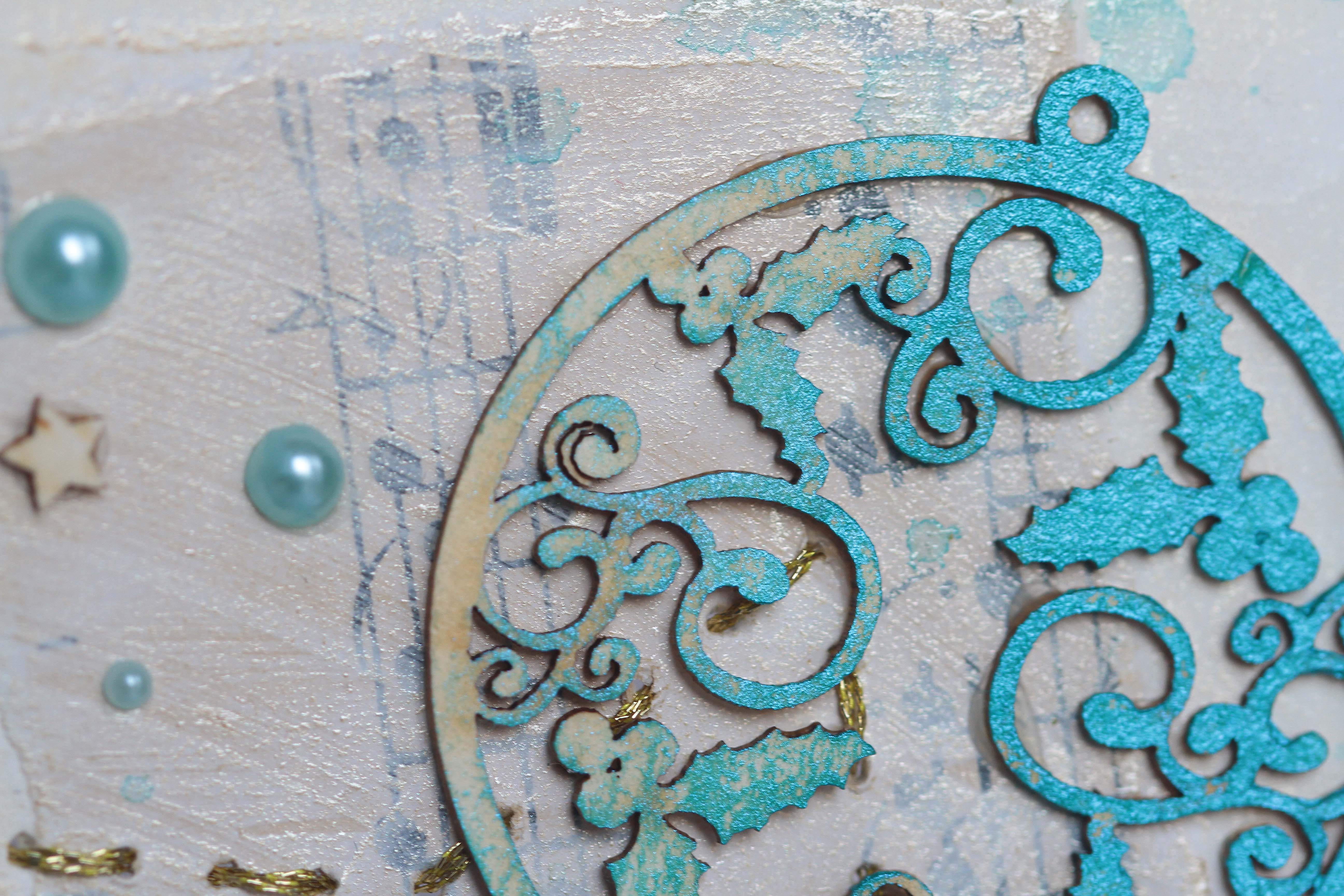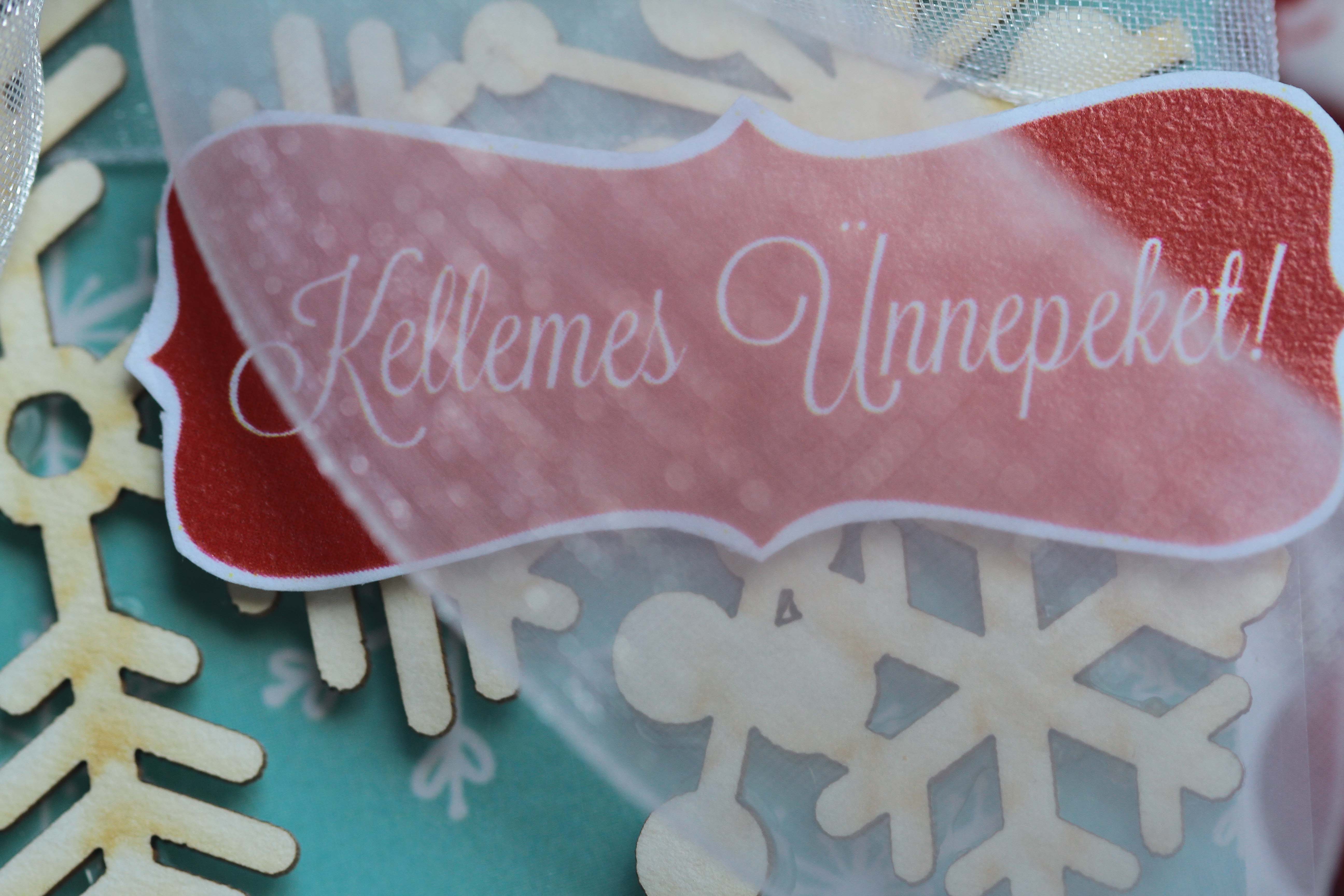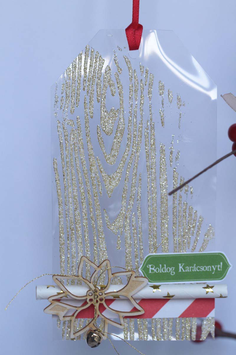 A következő három tag-nél a vastag fólia lett az alapom. Valamelyiket lekentem átlátszó gesso-val, ami kicsit opálosra száradt, de nem bántam. Mist-et használtam hozzá, majd díszítettem. A következőnél domborító pasztát használtam, a harmadiknál pedig karácsonyi mintás papírt tettem a fólia mögé.