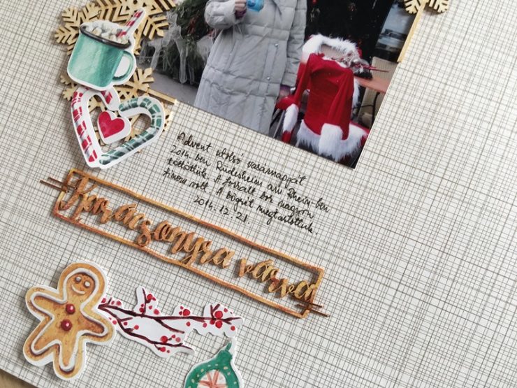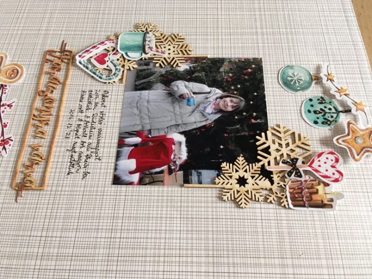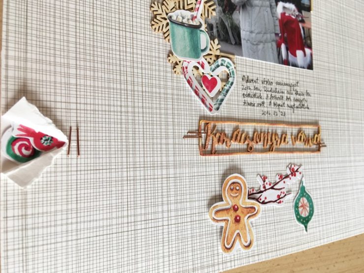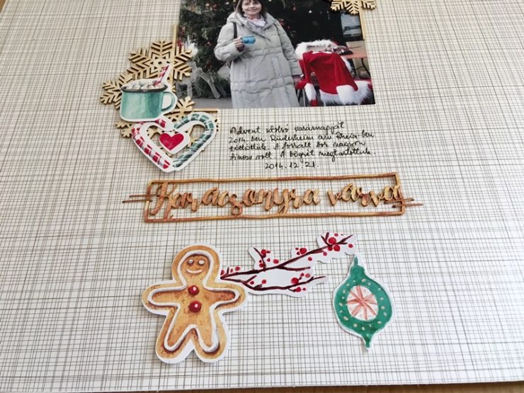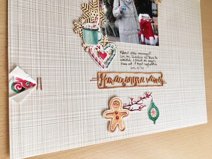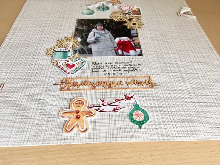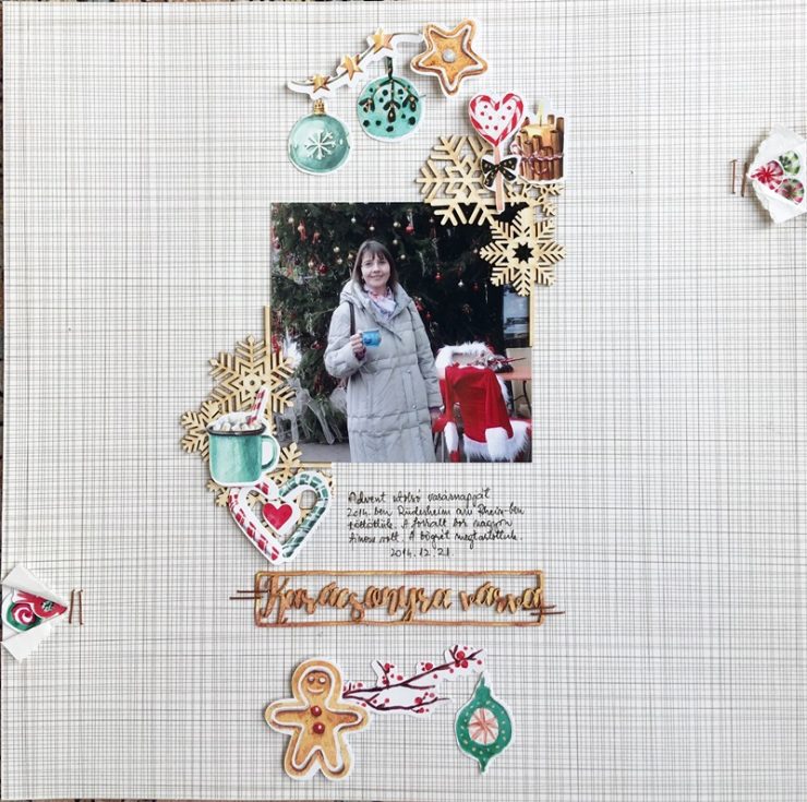 De vissza a lényegre: az oldal nagyon egyszerü, csak chipboardot és a nagyon szuper klasszikus karácsonyi kivágatokat használtam. Az Instán irogatva Judittal (Asztalos Judit) egyetértettünk, hogy mindkettönk nagy kedvence ez a kivágat csomag és hogy mindenképp akarunk valamit késziteni velük/ belölük. Ö egy adventi naptárt, én ezt az oldalt készitettem. A hókristály chipboard keretet nem, de a cimszót picit festettem és tüzögéppel fogattam a papirhoz. Néhány kivágatot 3D ragasztóval megemeltem, egy párat ide-oda beszuszakoltam.