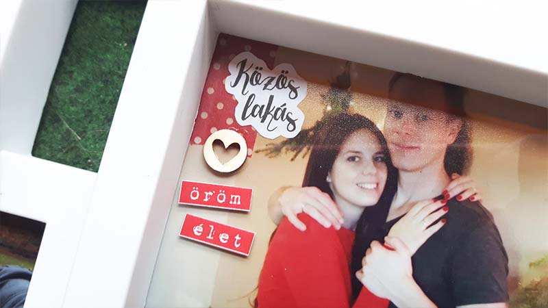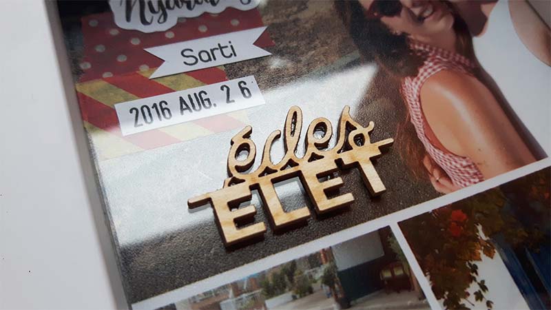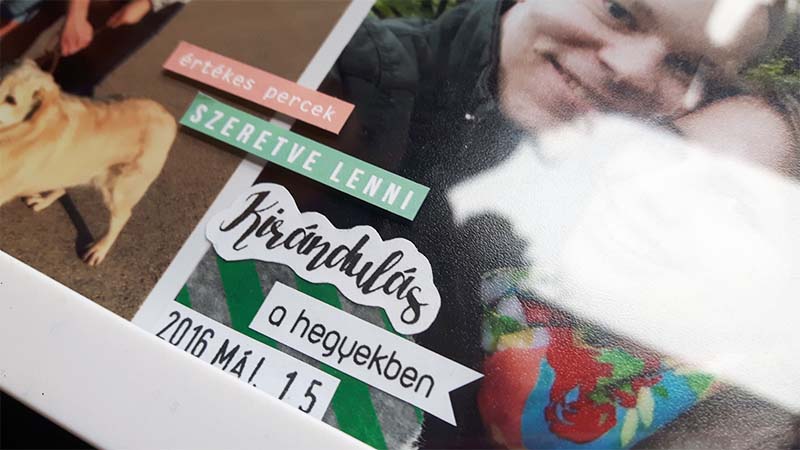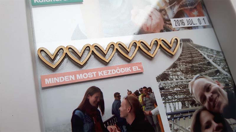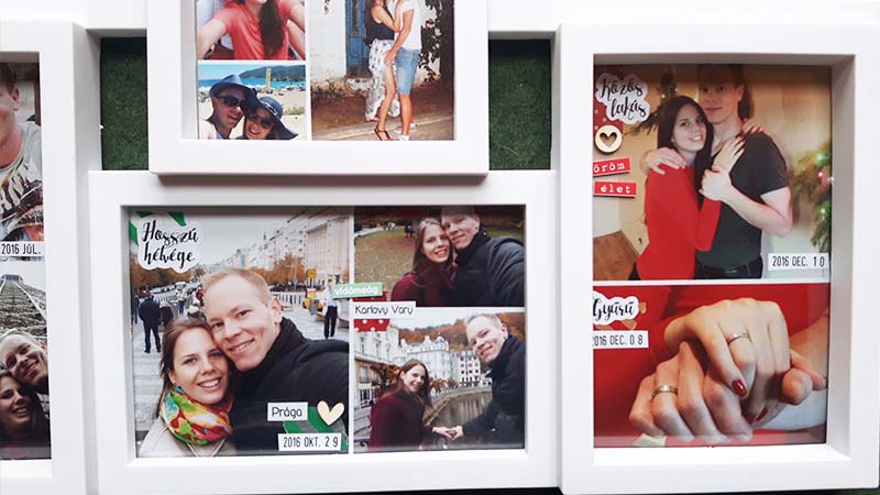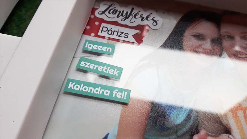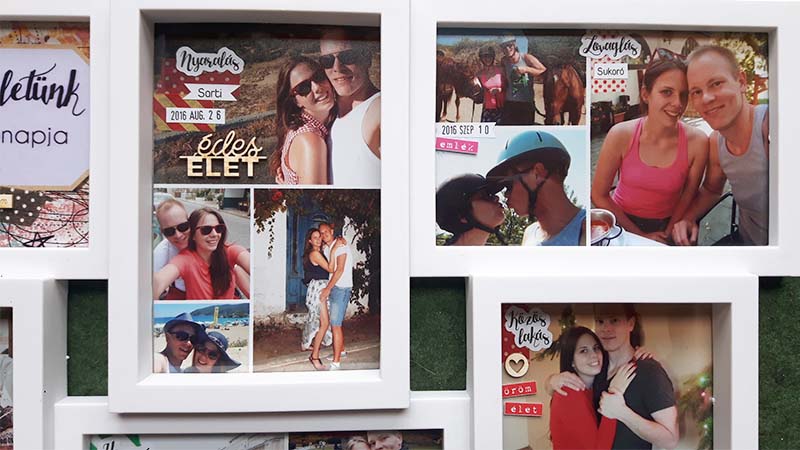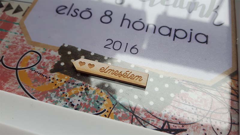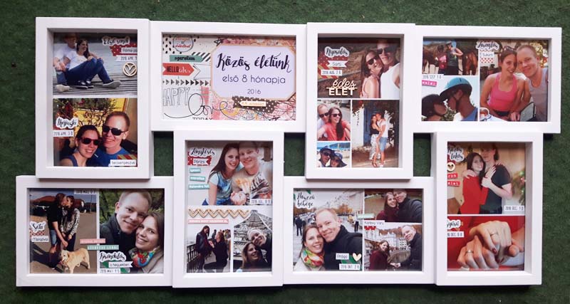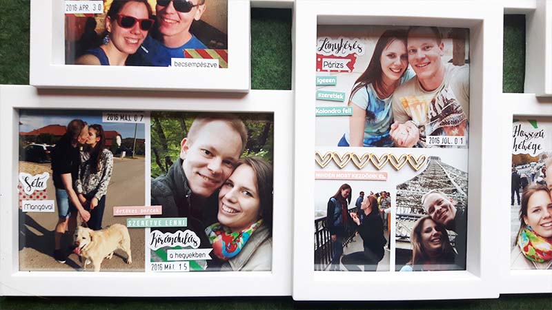 A címfeliratos képet digiben készítettem el, úgy hívattam elő. Sokat gondolkoztam rajta, hogy a többi képre is rá digiscrappelem a dátumokat meg a feliratokat, el is kezdtem megcsinálni, de valahogy nem állt össze, nem tetszett. Végül nyers képekkel dolgoztam, és utólag kerültek rá a washi tapek, illetve minden egyéb információ. Ezeket közvetlenül a fotóra ragasztottam. Majd elkezdtem kicsit felturbózni és összedolgozni az egész képkeretet. Az üvegre matricákat ragasztottam, illetve néhány chipboardot.