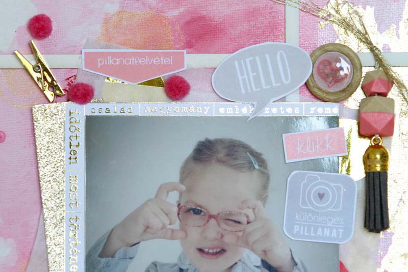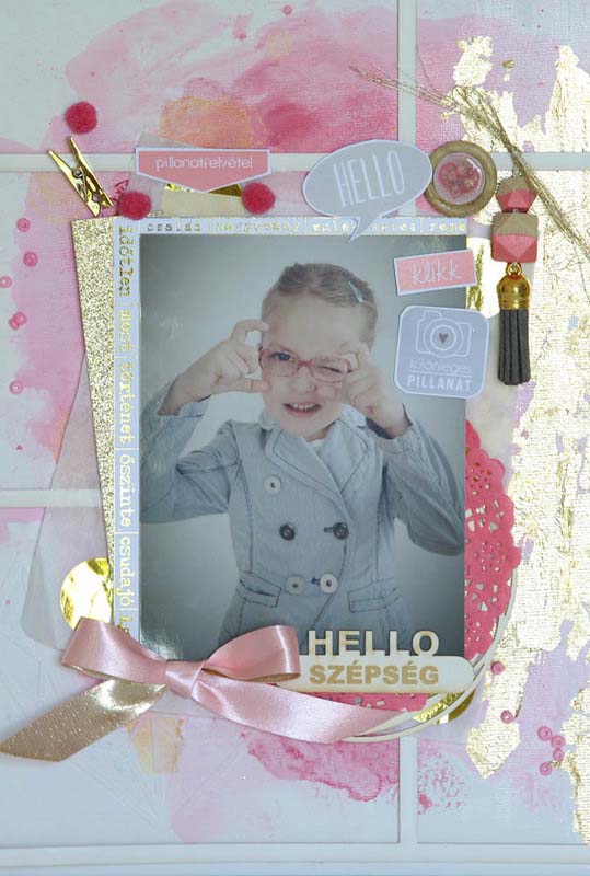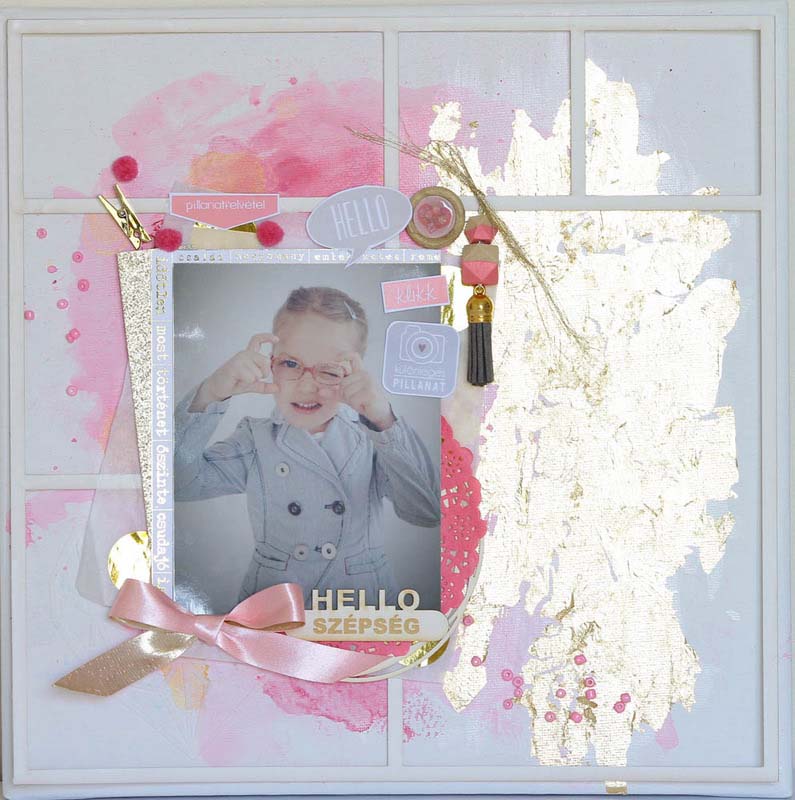Az osztott keretekkel már egy ideje szemezek, most azonban tudtam, hogy hogyan fogom felhasználni az egyik ilyen kincset. Nem a funkciójának megfelelő felhasználási módot választottam…, ha lehet ilyet mondani, ugyanis nem fotókat és designer papírokat vágtam méretre, hanem egészen egyszerűen a fotóm mögé, „rétegnek” használtam. Így nem is rögzítettem, csak egy ponton, a vászon közepén a fotó alatt. Szeretem, ahogy a széleken elválik a keret a vászontól.