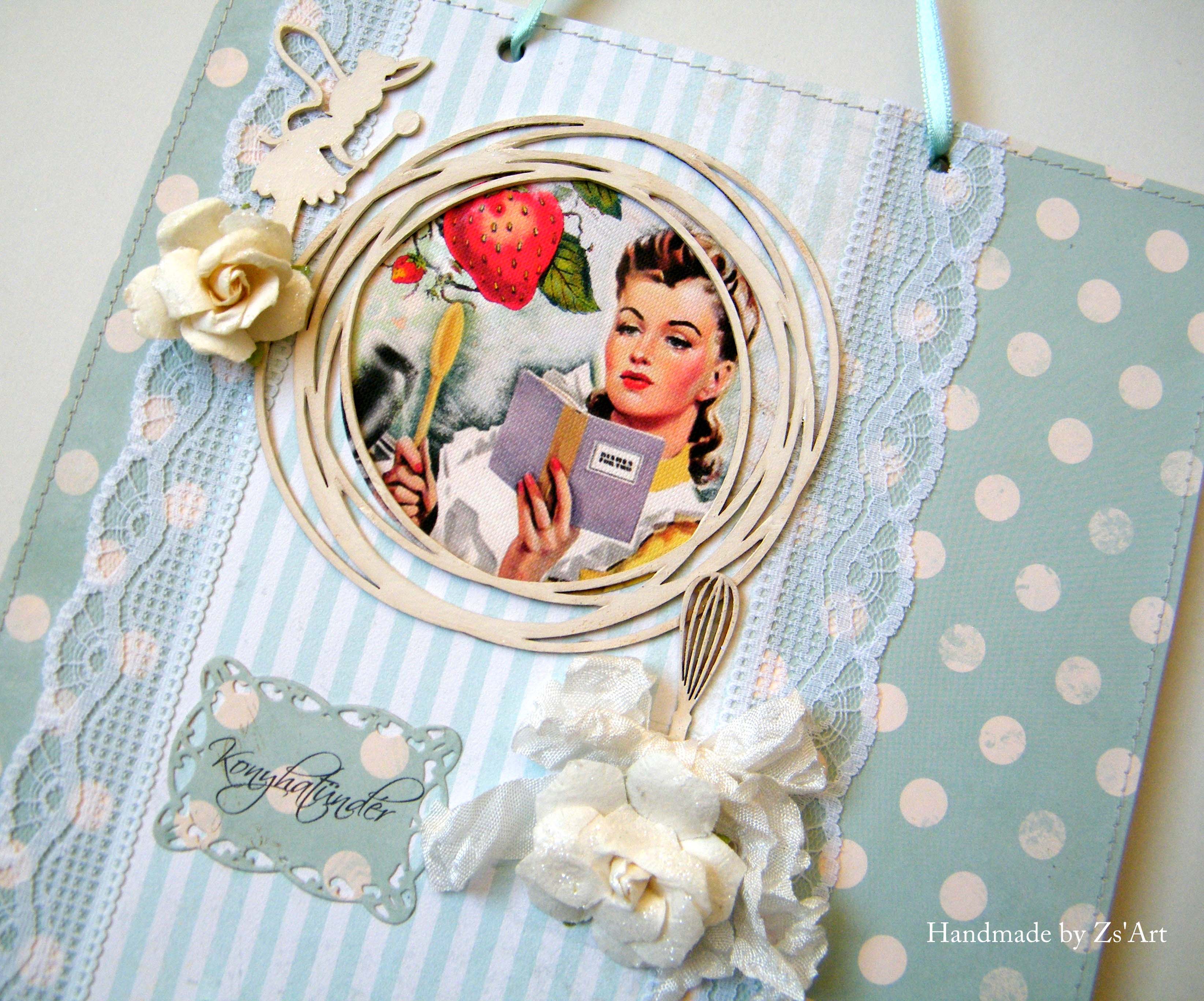 Ugyanígy jártam el a konyhai chipikkel is. Ezután a papírt választottam ki, a főzőcskézős nőci kiáltott a kék-fehér pöttyökért. Került rá egy sor csipke, gyűrt szalag, és szintén csillámporral teleszórt Prima virágok. A feliratot szerkesztettem, nyomtattam, és Sizzix-el vágtam formára.