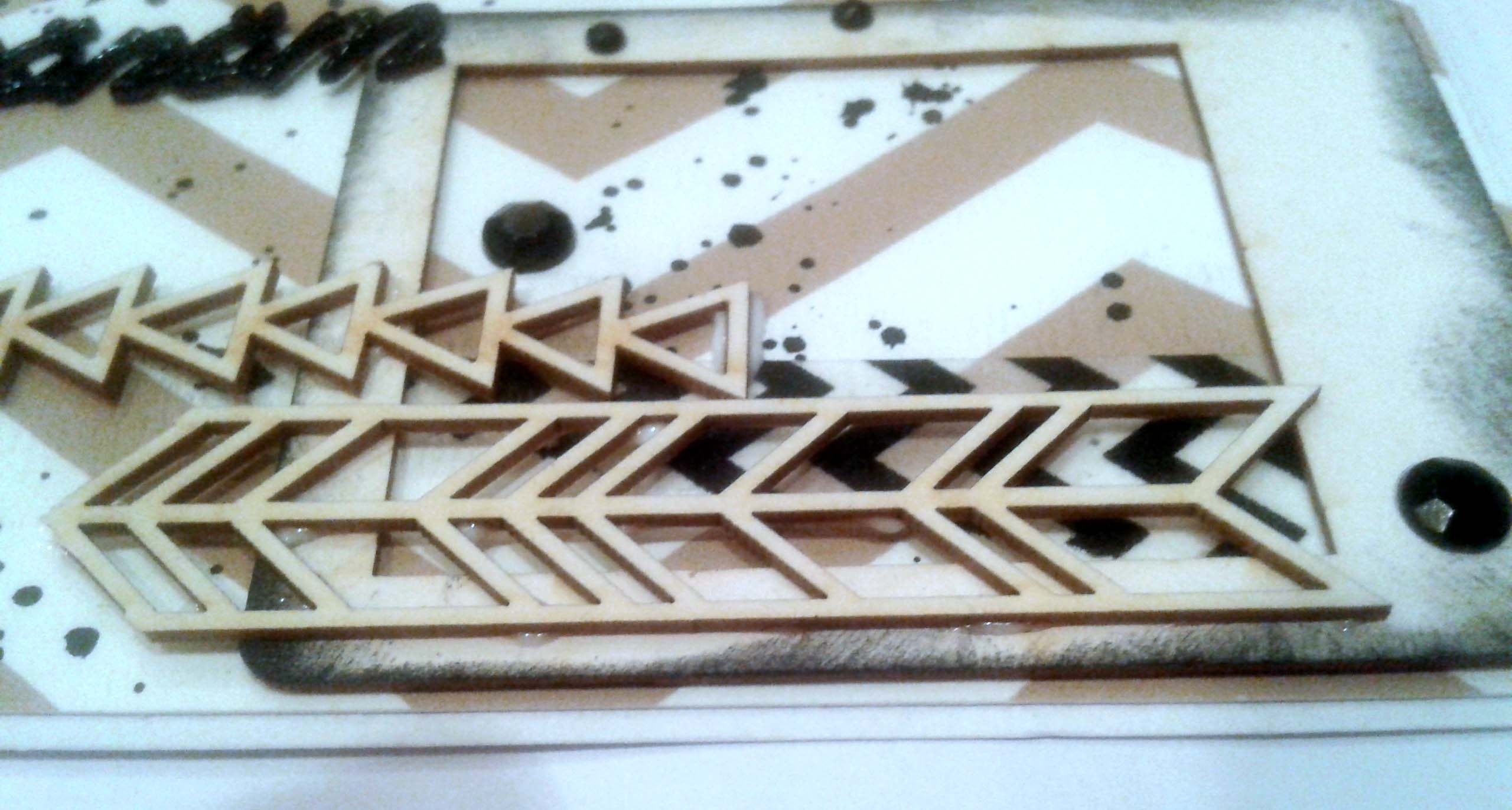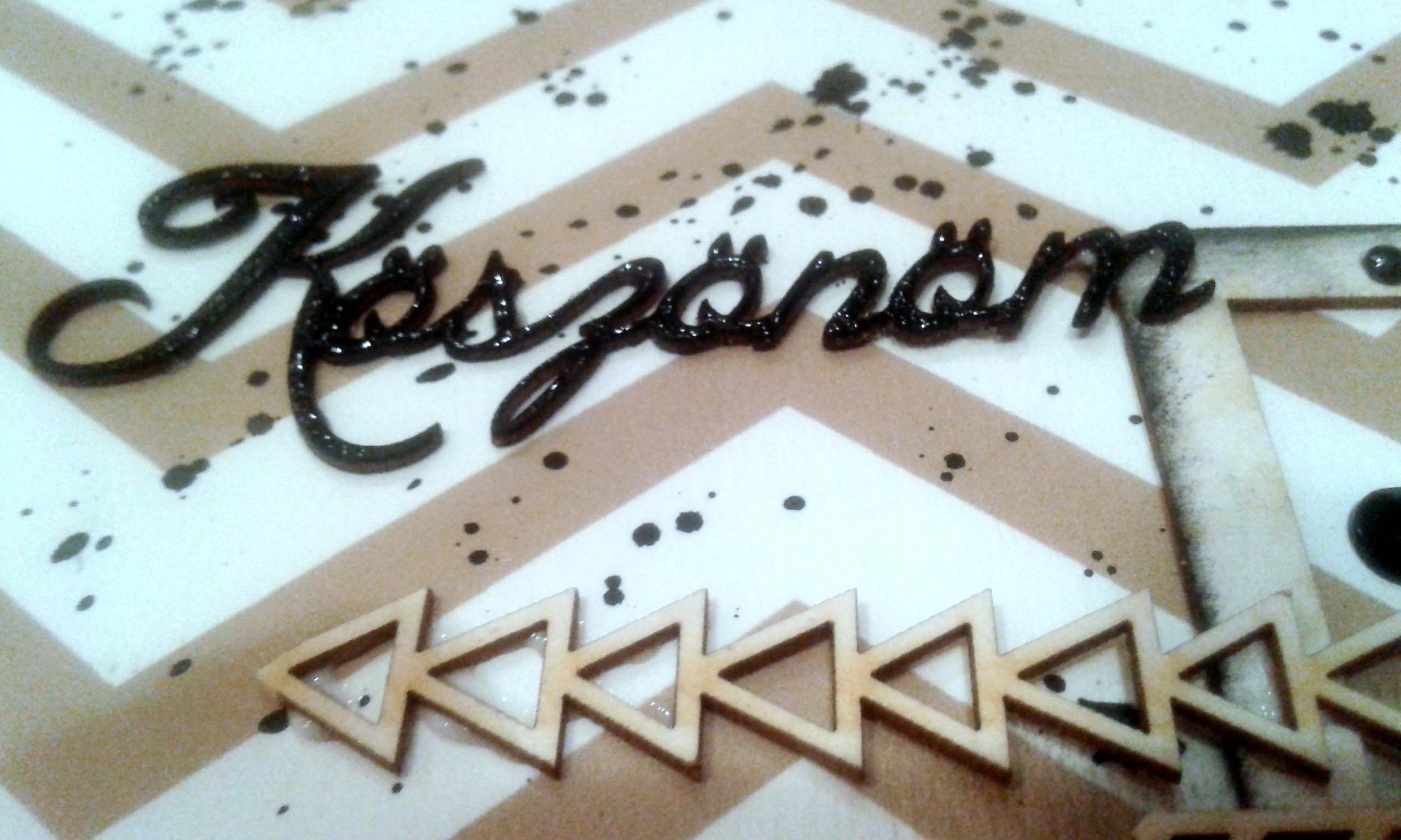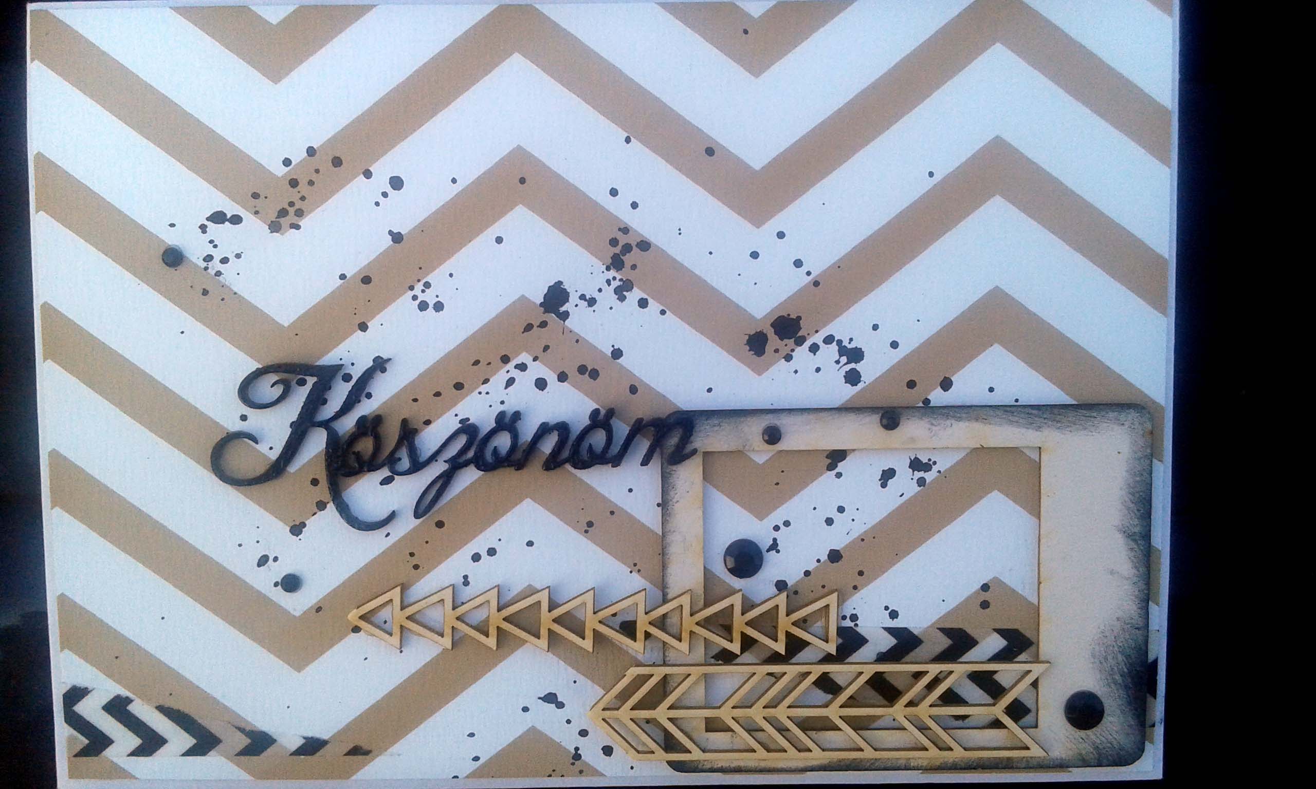 Nem volt időm borítékot vagdosni, hajtogatni, így elővettem egy kész borítékot és ez a shevron mintás papír pont az asztalomon volt. Kivágtam a borítéknál 2 mm-rel kisebbre fröccsöltem rá egy kis festéket, betintáztam a „köszönöm” feliratot feketére, rászórtam domborító port. Miközben a hőlégfúvóval szárítottam a festéket és a feliratot, gyorsan kiválogattam egy-két NCSD-s chipboardot, rádobtam néhány félgyöngyöt és ez lett belőle!