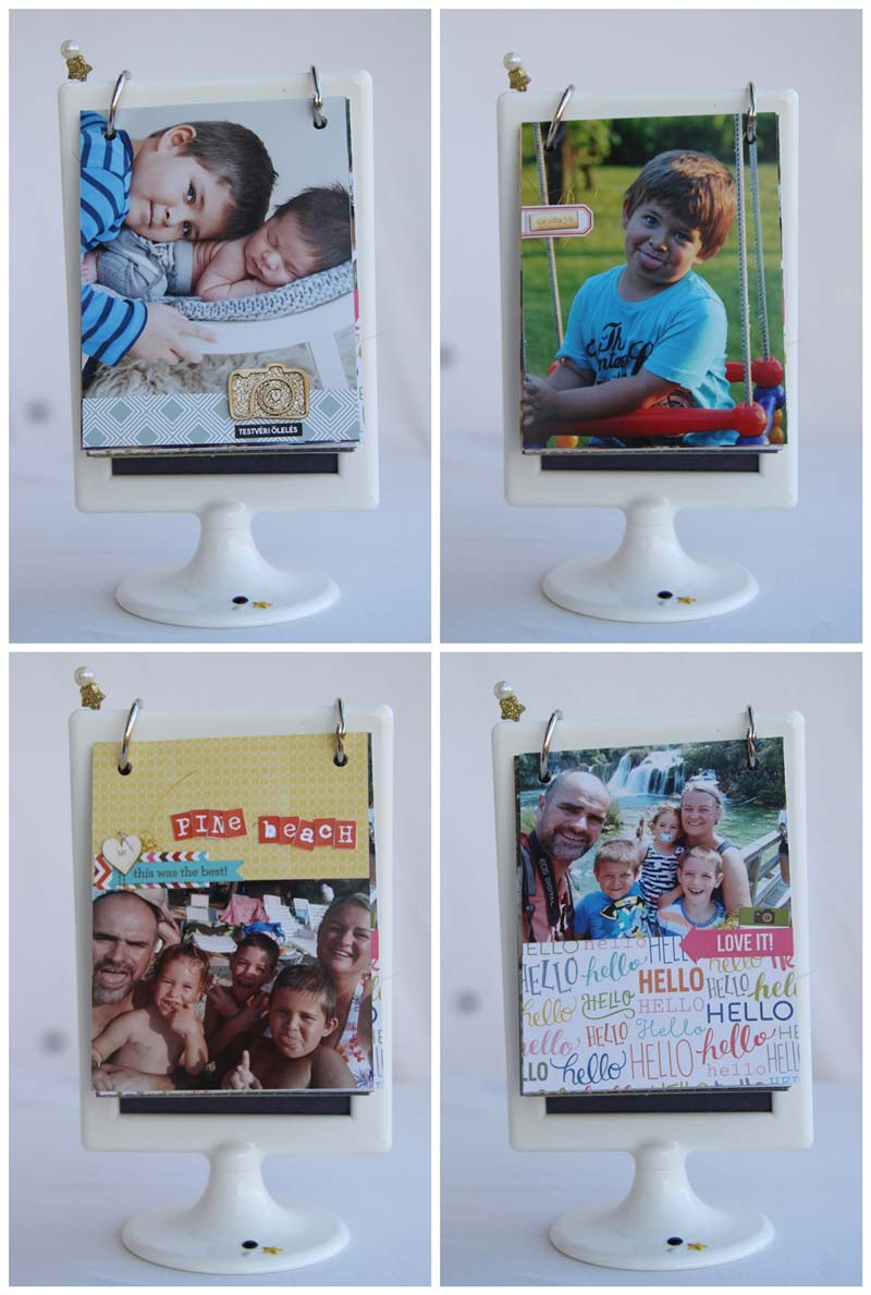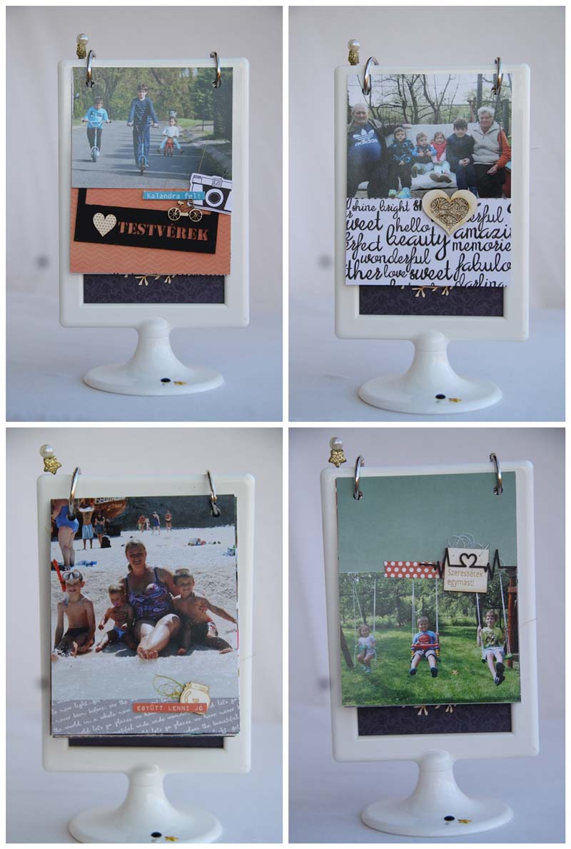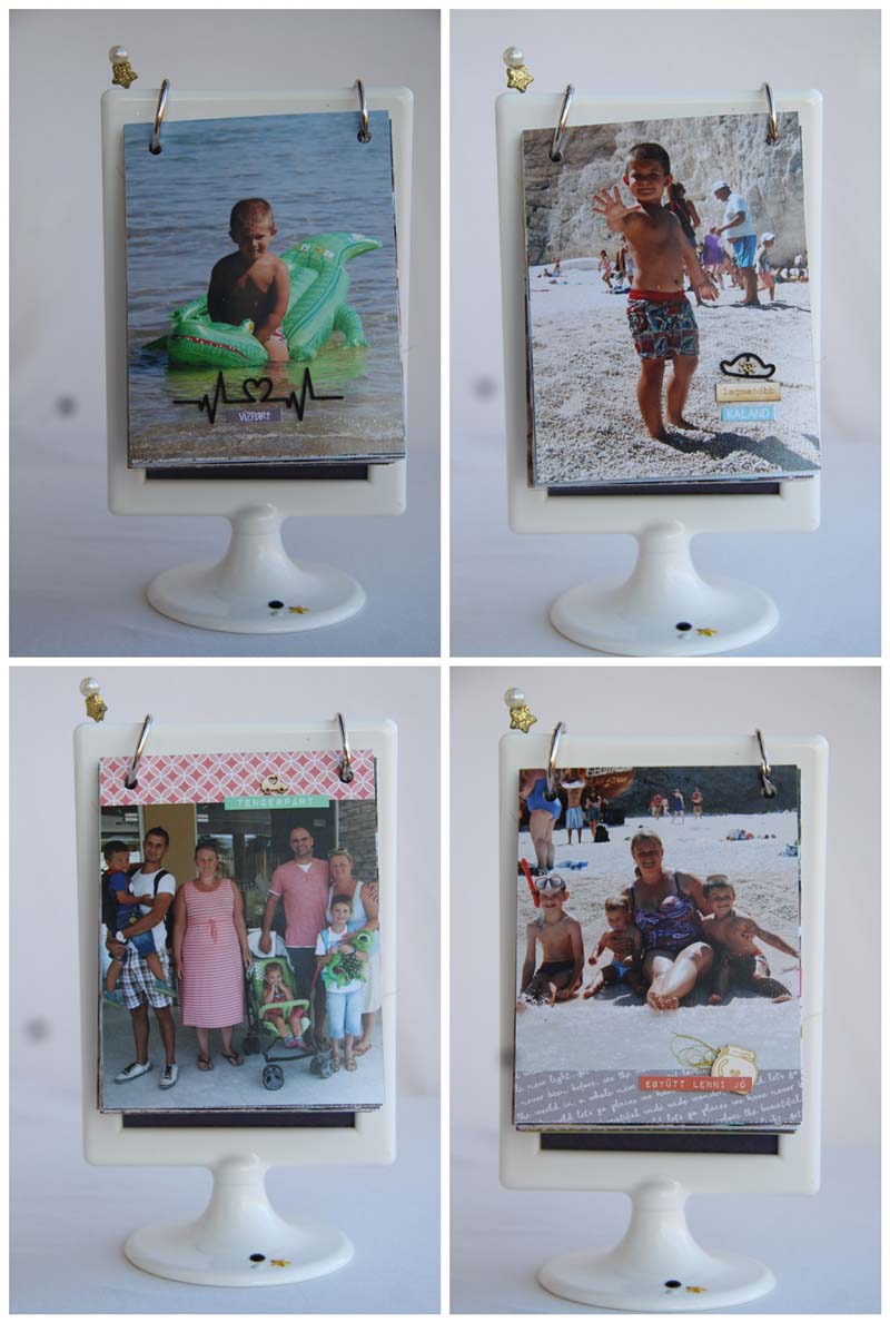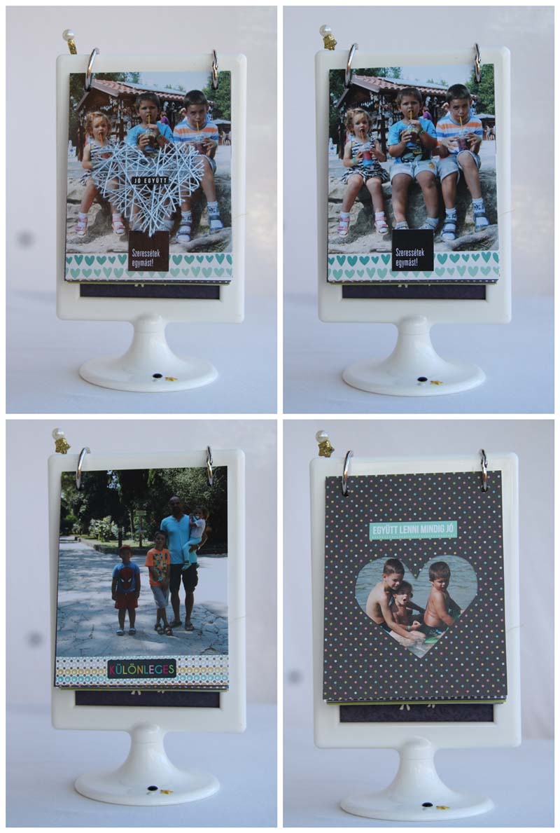 Az albumban három fotó méretet használtam: 10×15, 10×12 (PhotoScapeben így sikerült megszerkesztenem ) és 10×7,5. Miután a fotókhoz kiválogattam a papírokat, felragasztottam őket és kicsit díszítettem. Emőkétől vett ötlet alapján: a fiam hama gyöngyökből kirakott és szépen levasalt egy fényképezőgépet, amit egy fóliára ragasztottunk. Illetve én egy másik fóliára még egy szívecskét varrtam.