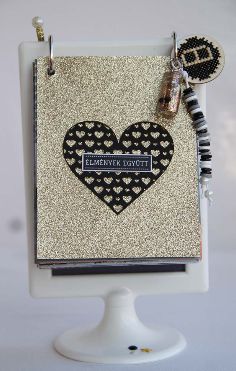 Nagyon egyszerű kis album lett, viszonylag sok fotóval. Minimális díszítésre törekedtem, mert bizony későn kezdtem hozzá. A borítóra egy csillogó arany papírt használtam, rá feketére festett szívecskével és a felirattal. Mivel imádok keresztszemezni, kivarrtam feketével egy kör alakú csipit, és belehímeztem még keresztfiam monogramját. Az üvegcsébe aranypor került és egy átlátszó szívmatrica. Kitaláljátok, hogy a lelógó füzér, miből és hogyan készült? … Oké, elárulom. Mivel a fiam imád hama gyöngyözni, van egy csomó itthon. Fekete fehéret és szürkét egy tányérra tettünk, mindet egyesével állítva és a mikrohullámú sütőben „megsütöttük”. Türelemjáték mindenképp.  Amikor ilyen szépen összezsugorodtak, felfűztük, gyöngyöt tettünk a végére és a karikára akasztottuk. A karika mellé került még egy gombostűre felfűzött arany csillag dísznek.