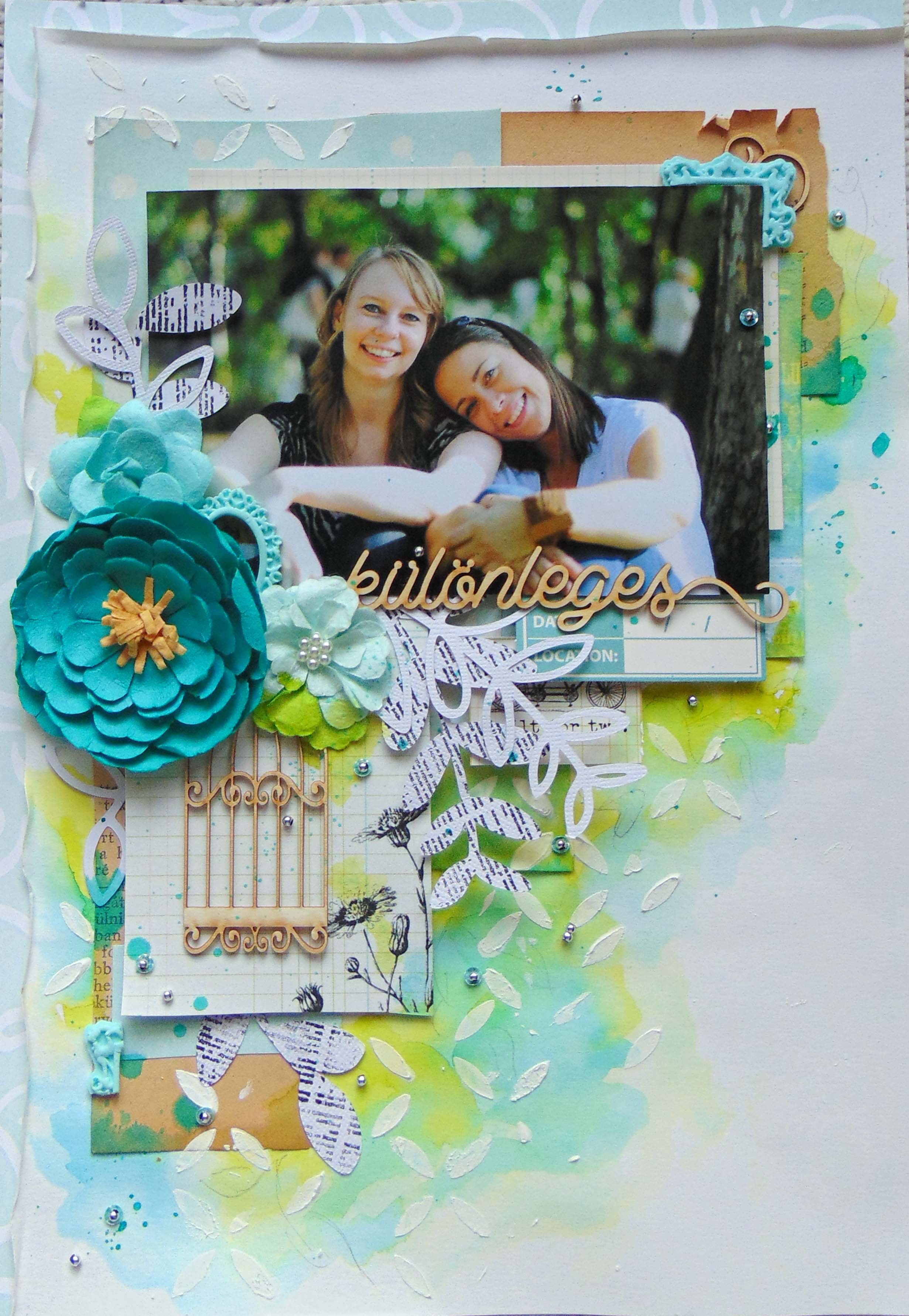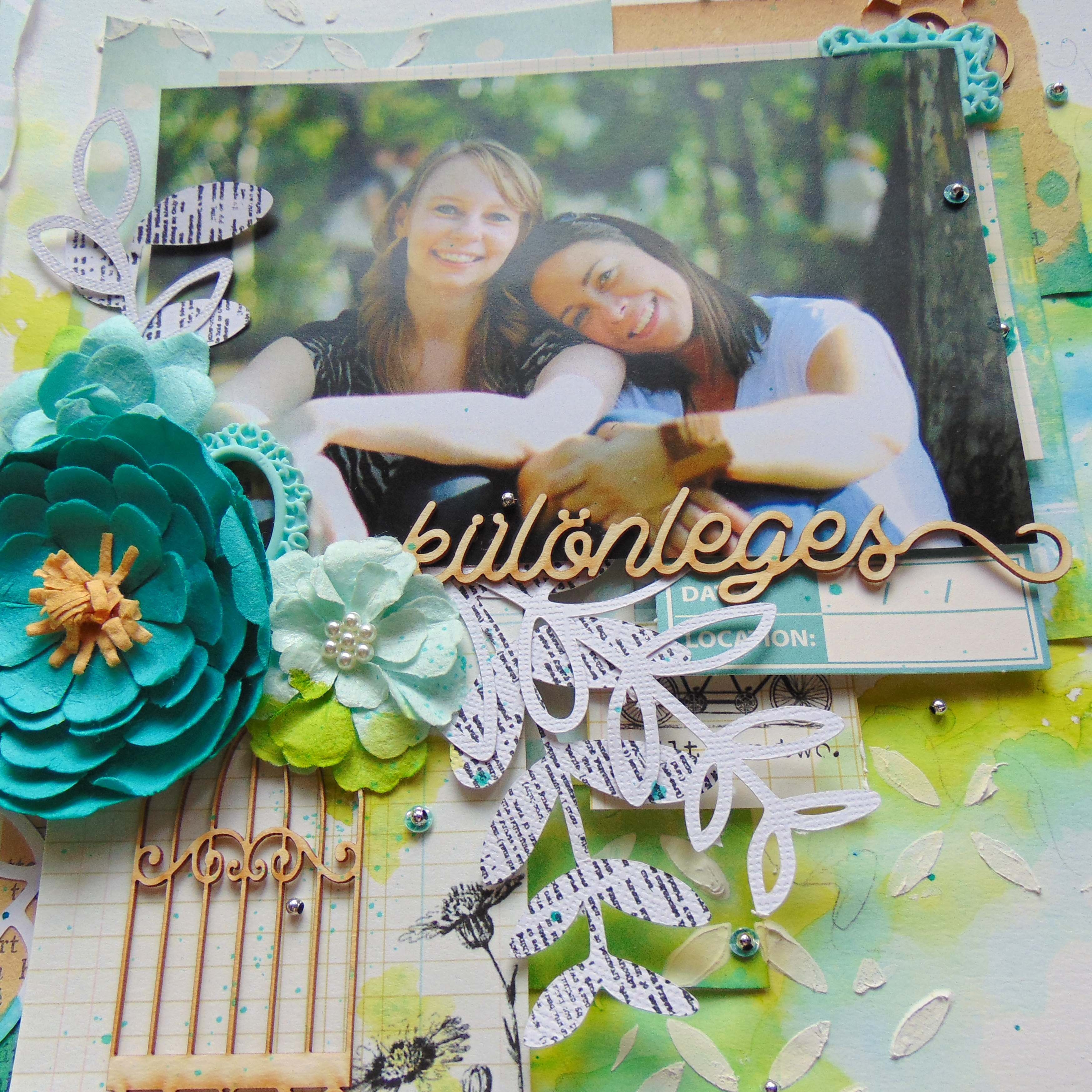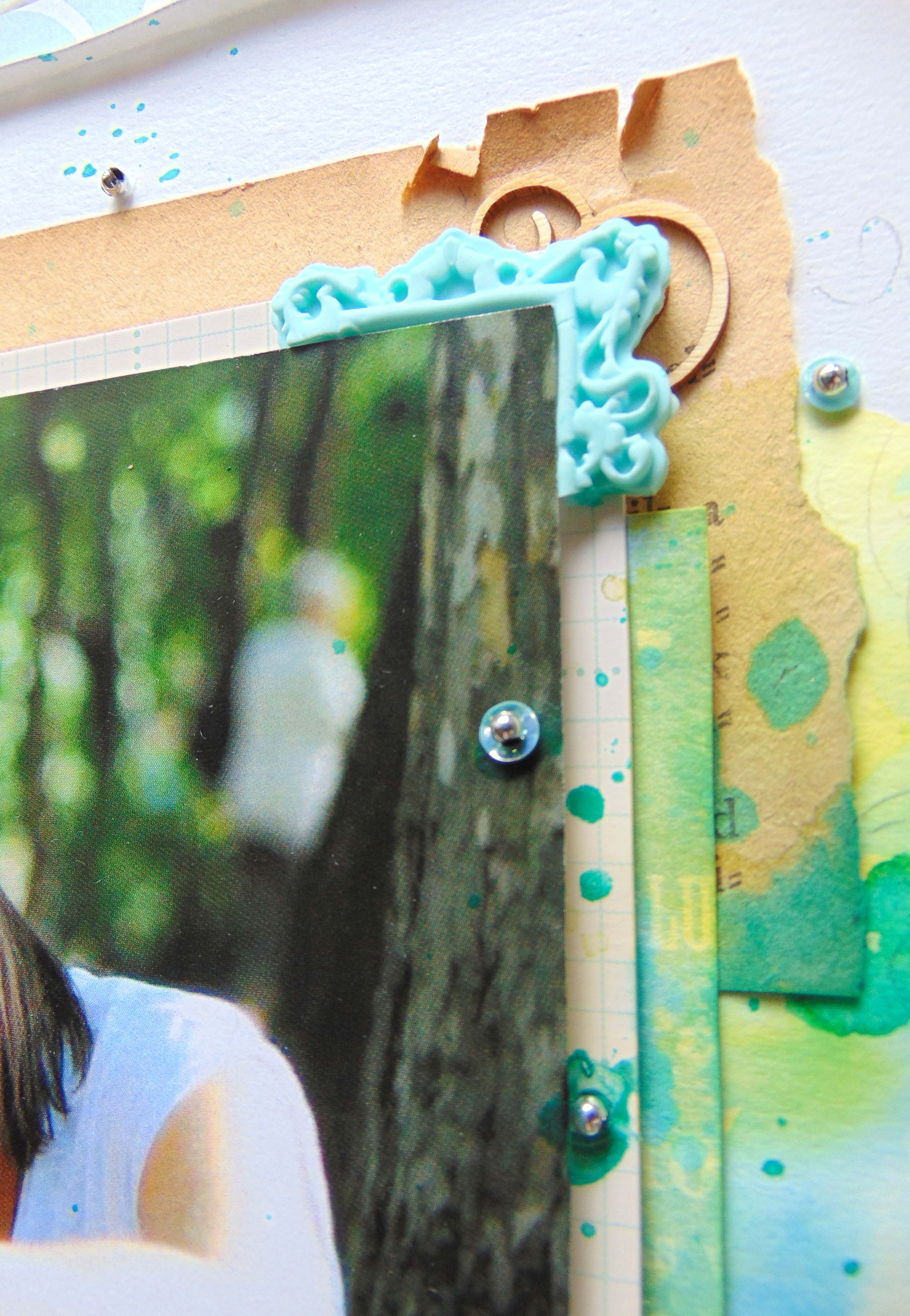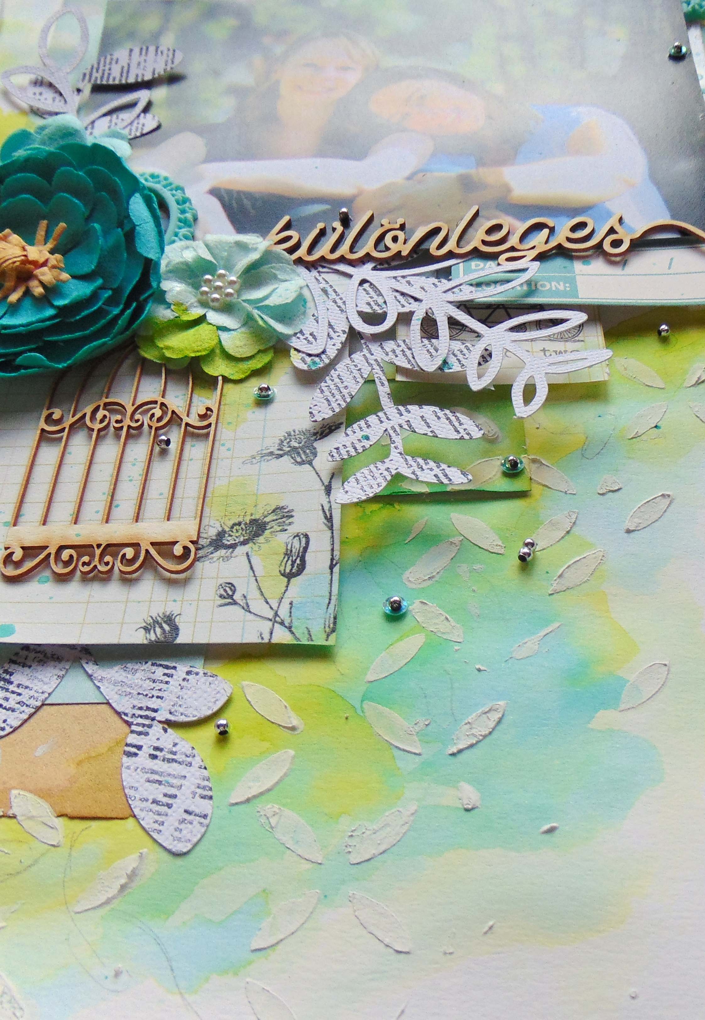 "Mikor megkaptam Beus fényképét, egyből az jutott eszembe, hogy a természetet kell "folytatni", a fák zöldjét, a leveleket kéne megidézni. De megragadtak a kép lágy fényei is, ezért választottam a romantikus kiegészítőket. Kevés színt használtam, és ezeket igyekeztem a fotóból meríteni. Ha találok még itthon egy két kiegészítőt ami színben illik a fotóhoz biztos azokat is rápakolom az oldalra…"