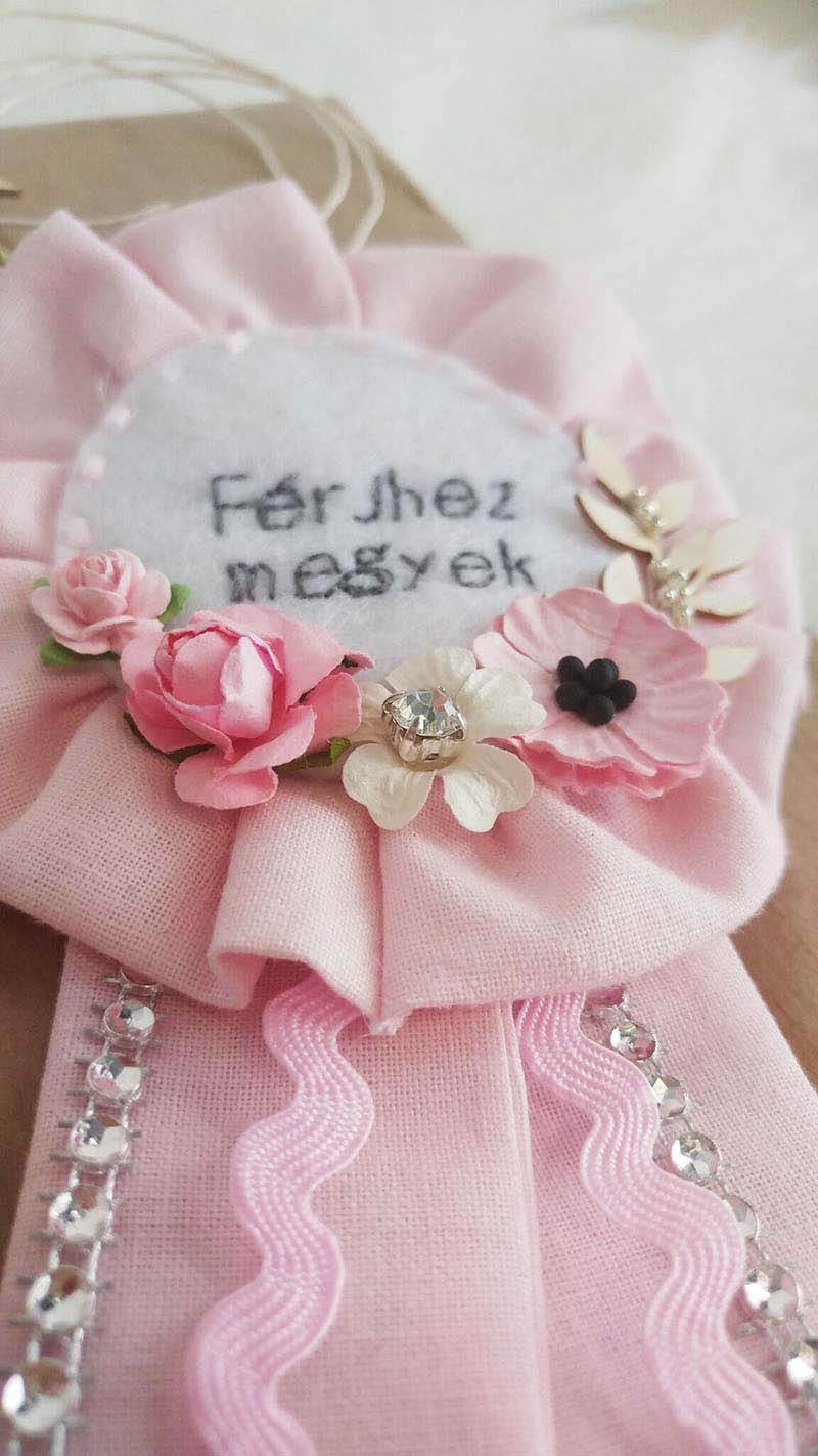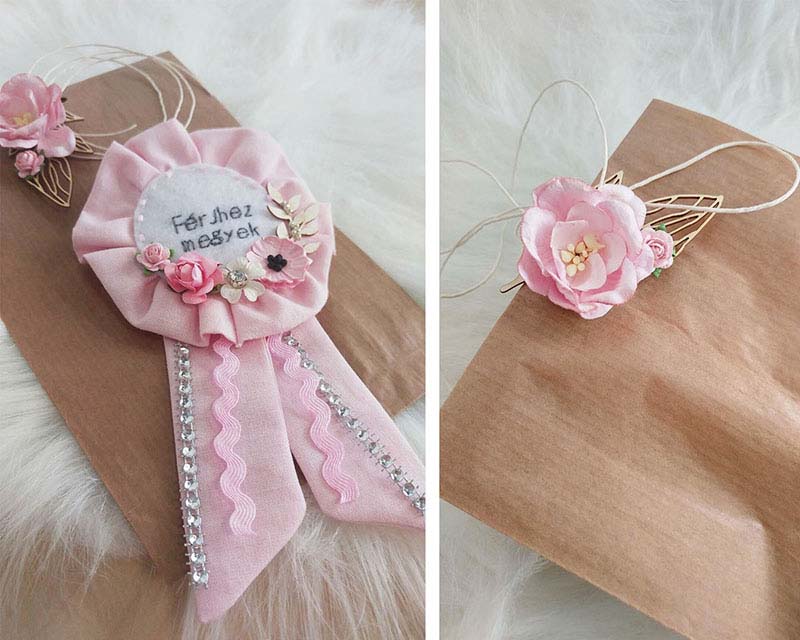 A lányok kitűzőjét papírból, a menyasszonyét textilből készítettem. A papír kitűzők a már bemutatott Pedagógus érdemrendek szerint készültek. Azért is nagyon szeretem a NőiCsizma kiegészítőket, mert hihetetlen mód univerzálisak és nagyon jól lehet őket mixelni különböző textúrákkal. Így a menyasszony kitűzője is kapott egy ágas csipit és papír virágokat.