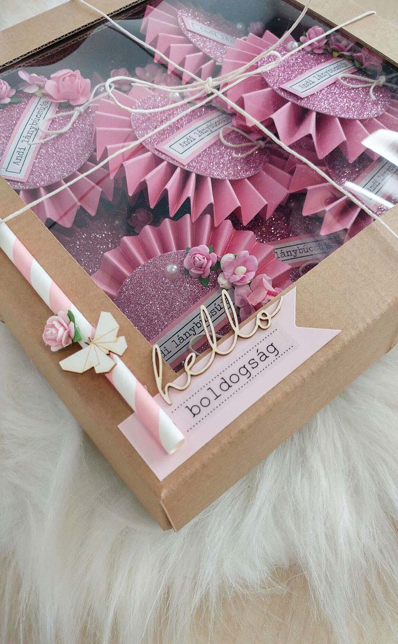 A díszítésre is nagy hangsúlyt fektettem. A papírzacskót, amibe a textil kitűzőt tettem, kis levéllel és a rá ragasztott rózsákkal dobtam fel. A papírdobozra, amibe a többi kitűzőt tettem, papír szívószál, origami csipi és a „hello boldogság” felirat került.