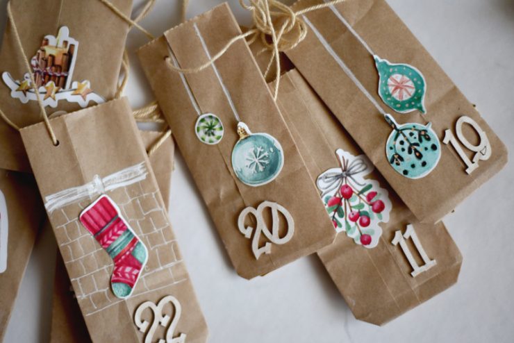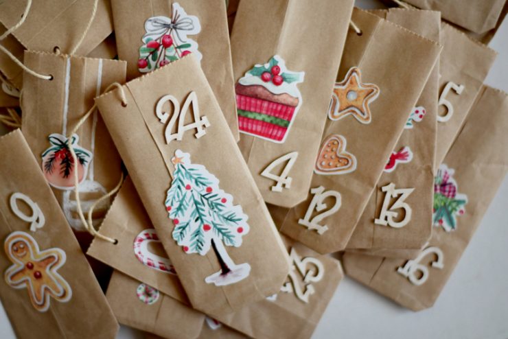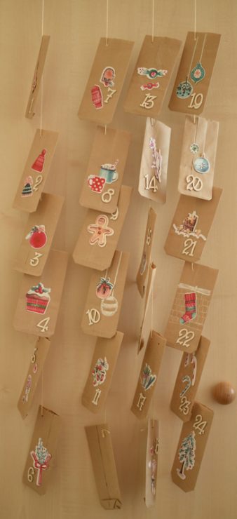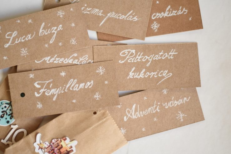 A megtöltésükön nem kellett sokat gondolkozni, mert évek óta bevált lista van az adventi készülődés lépésiről a gyerekszoba ajtajának dekorálásától kezdve, a mézeskalács sütésen és a csizmapucoláson át, a szenteste meggyújtható csillagszórókig. A tasakok többségébe ilyen dolgok kerülnek, de lesz néhány családi program ( például fényvillamos, vagy kürtős kalács az adventi vásárban) és egy-két tasak apró meglepit (kisautót, diafilmet) rejt majd.