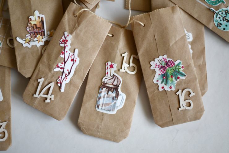Van egy állandó adventi naptárunk, amit akkor készítettem, amikor a fiam másfél éves volt. Varrtam, hímeztem napokig a kis zsákokat, aztán használtuk őket évről-évre 🙂 Tavaly elcsábultam a könyv alakú NCSD naptárra, idén pedig a klasszikus karácsonyi kivágatoknak nem tudtam ellenállni. Hozzátartozik a történethez, hogy nyáron többször rendeltem ebédet, aminek dobozát mindig egy papírzacskóban adták át. Sajnáltam kidobni, jó scrapperként elraktam, majd jó lesz valamire alapon. Úgyhogy amikor megláttam a kivágatokat már tudtam is, hogy eljött a szatyrok újrahasznosításának ideje 🙂