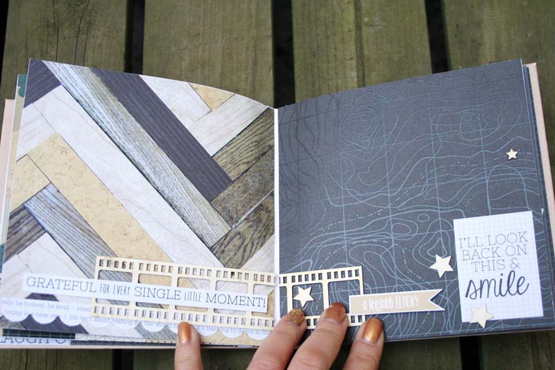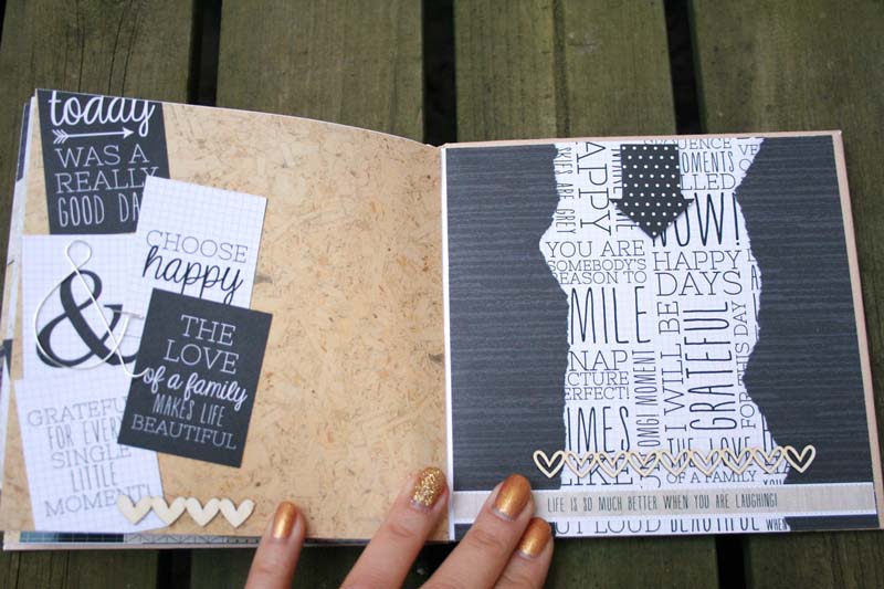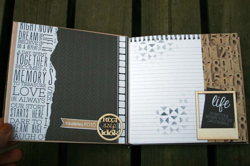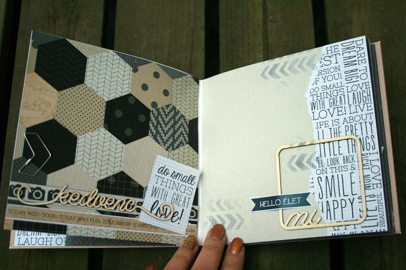 A szerencsés pasas kedvese töltötte meg fényképekkel gyerekkorról, együtt zenélésről és szerelmes pillanatokról. Nem csak azért volt jó dolgozni a Kaisercraft – Hello today papírkészletével, mert kőkeményen férfias színei és mintái vannak, hanem mert a 6,5 x 6,5 es papírkészletében is vannak perforált díszítőelemek, amikkel könnyedén és gyorsan lehetett dolgozni. Tökéletesen passzoltak a NCsD csipikkel!