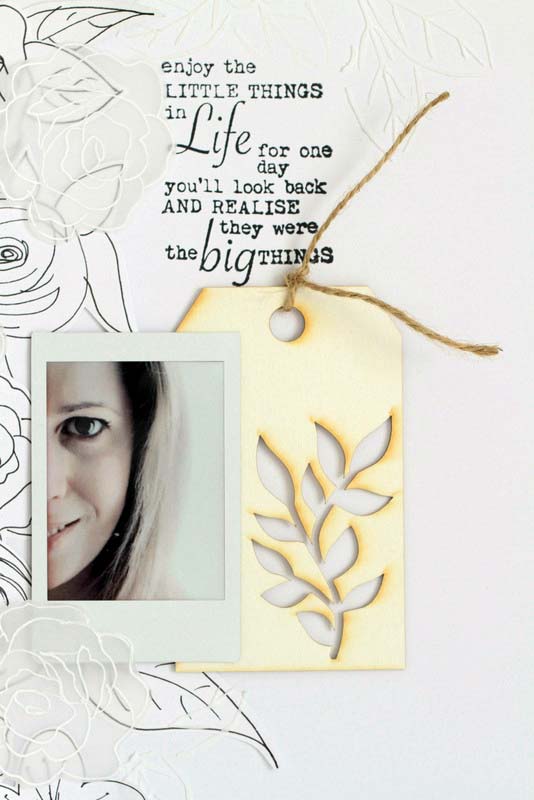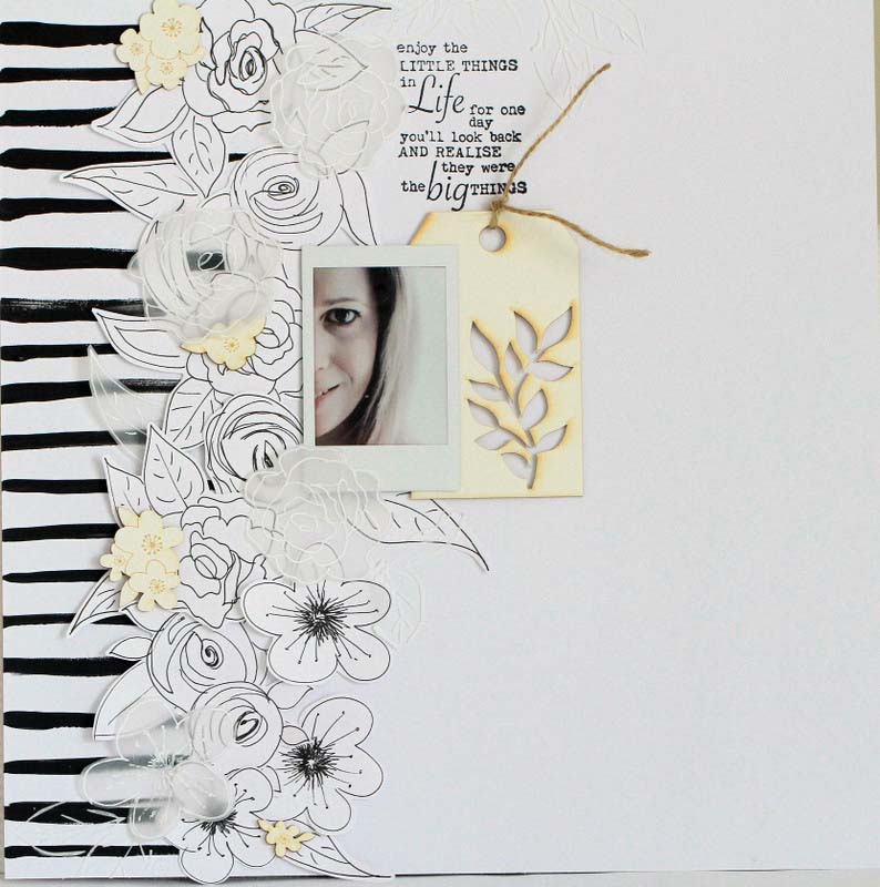 Az alapkartonon a fekete csíkokat már előtte megfestettem. Ahogy pakolgattam a virágokat, egyre jobban tetszett az oldal egyszerűsége, sőt, ahogy sorra kerültek rá az NCsD csipik, teljesen oda voltam, hogy mennyire kiemeli azokat a monokróm alap.