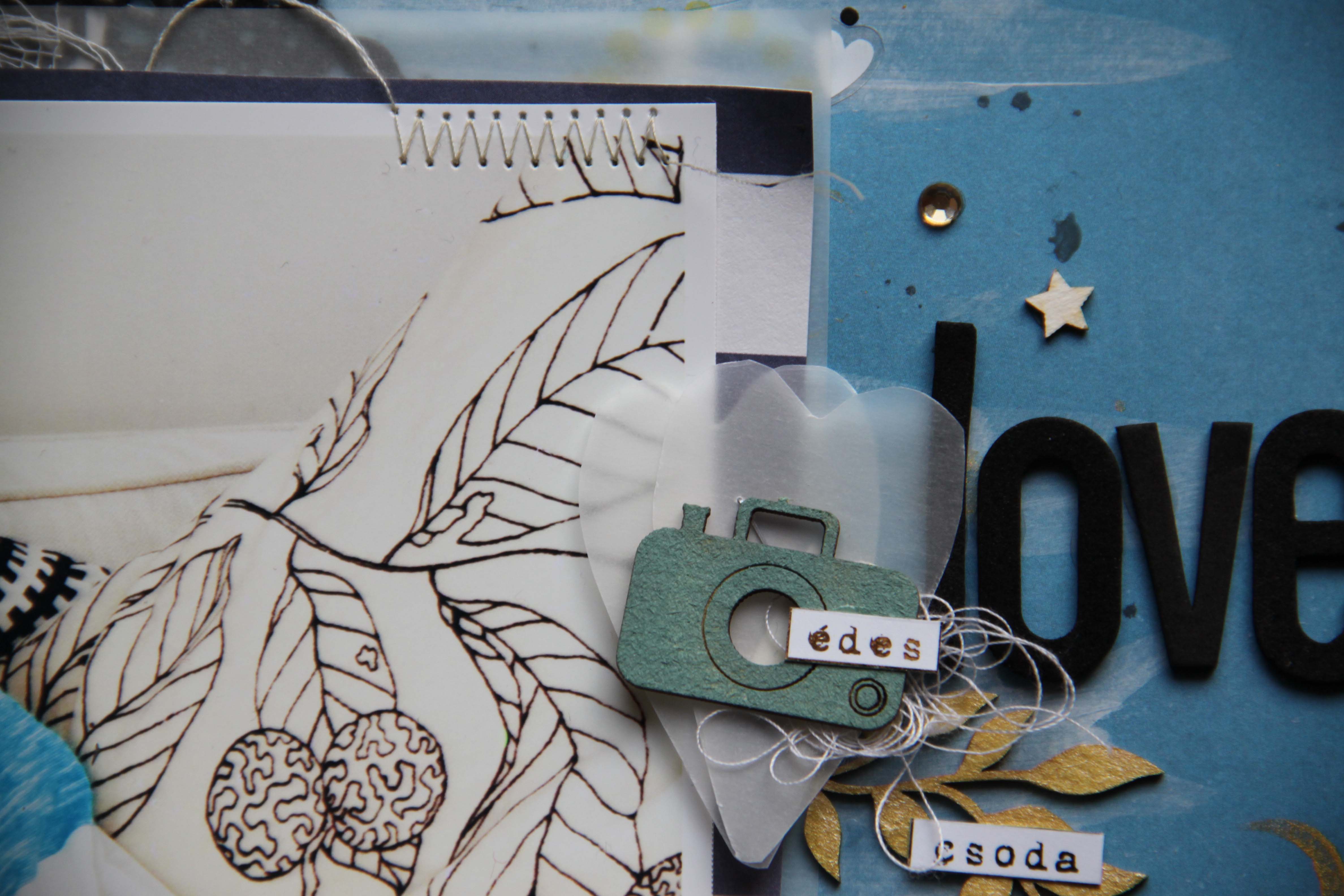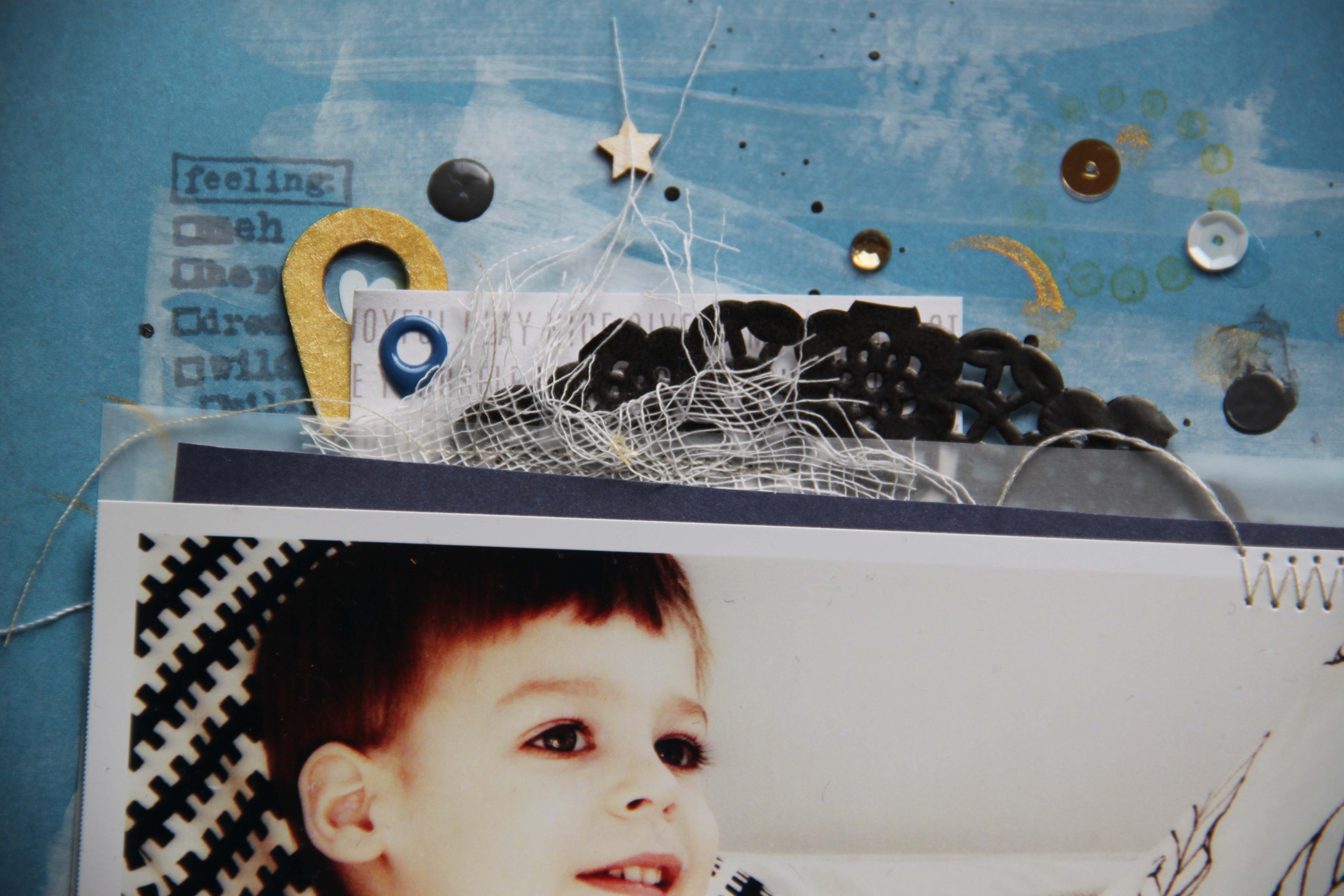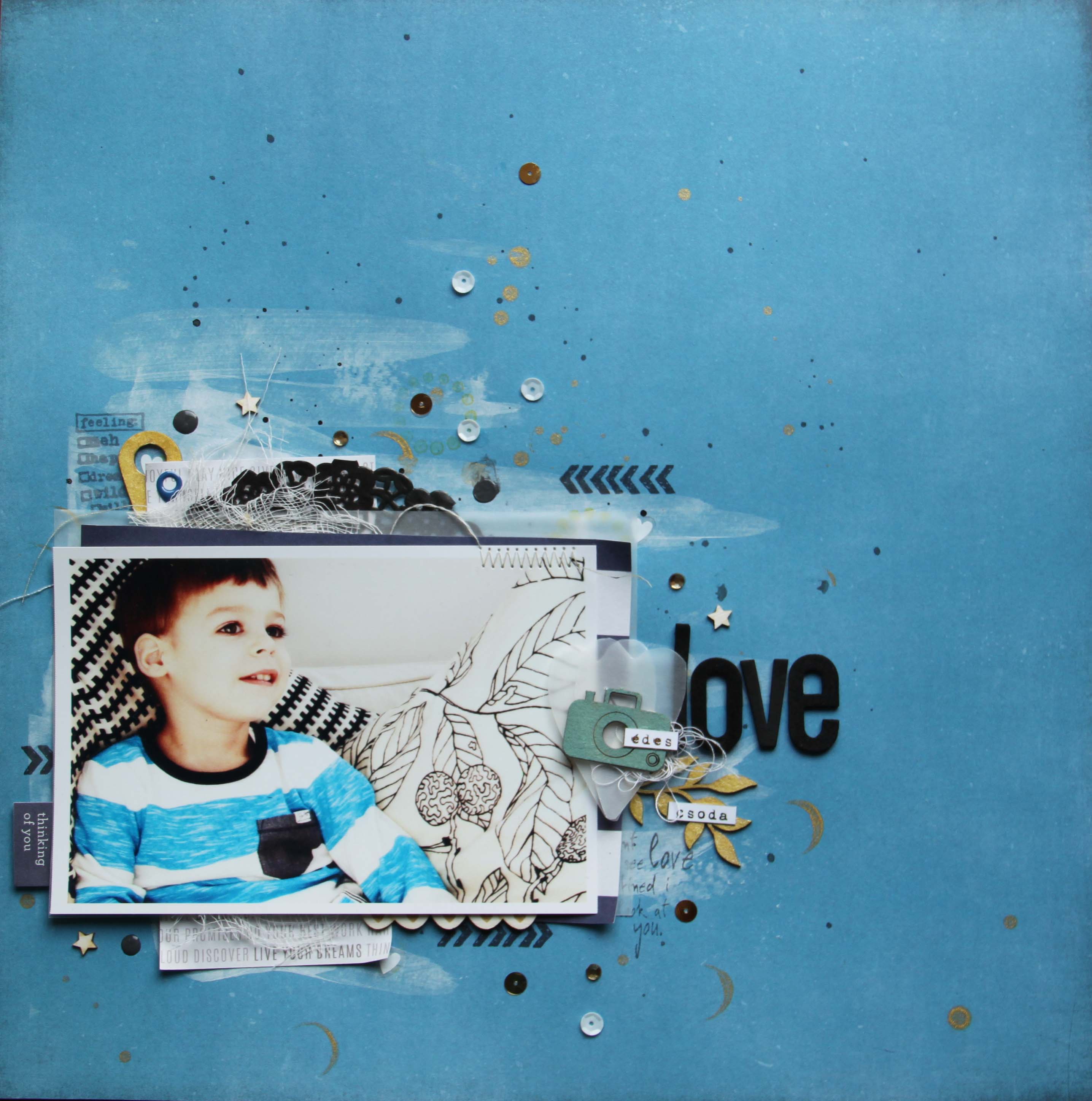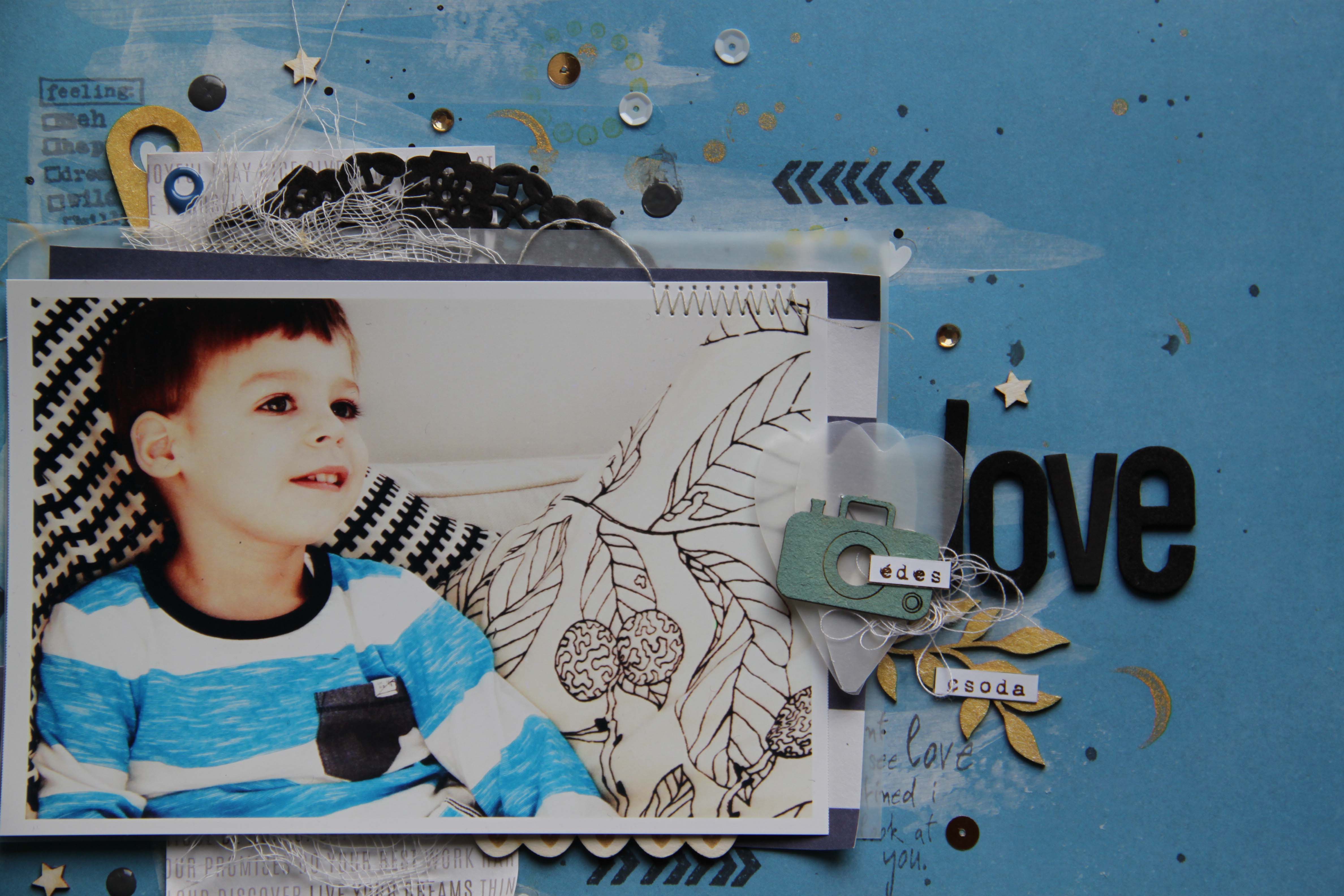 Én egy nagyon jó képet kaptam. Nemcsak azért tetszett, mert olyan nagyon cuki ez a mosoly, hanem azért is, mert nagyon jók a színek és mert megszólított. Rögtön tudtam, hogy ezen az oldalon a színvilág, fekete fehér kék lesz, amit majd egy kis arannyal is megbolondítok még. Maszatoltam az alapkartonon egy kicsit fehér akrilestékkel, pacáztam fekete mist-tel és pecsételtem fekete tintával és arany media inkkel. A fotó alá rétegeztem papírt, pauszt, tortacsipkét, gézt. Varrtam egy keveset. Pauszpapírból szíveket vágtam ki, erre került egy kamera és címkék. Leveleket mindenképp akartam az oldalra, hogy a párna mintája visszaköszönjön. Flitter, csillag, texture spray pöttyös, félgyöngy és tulajdonképp kész is az oldalam.