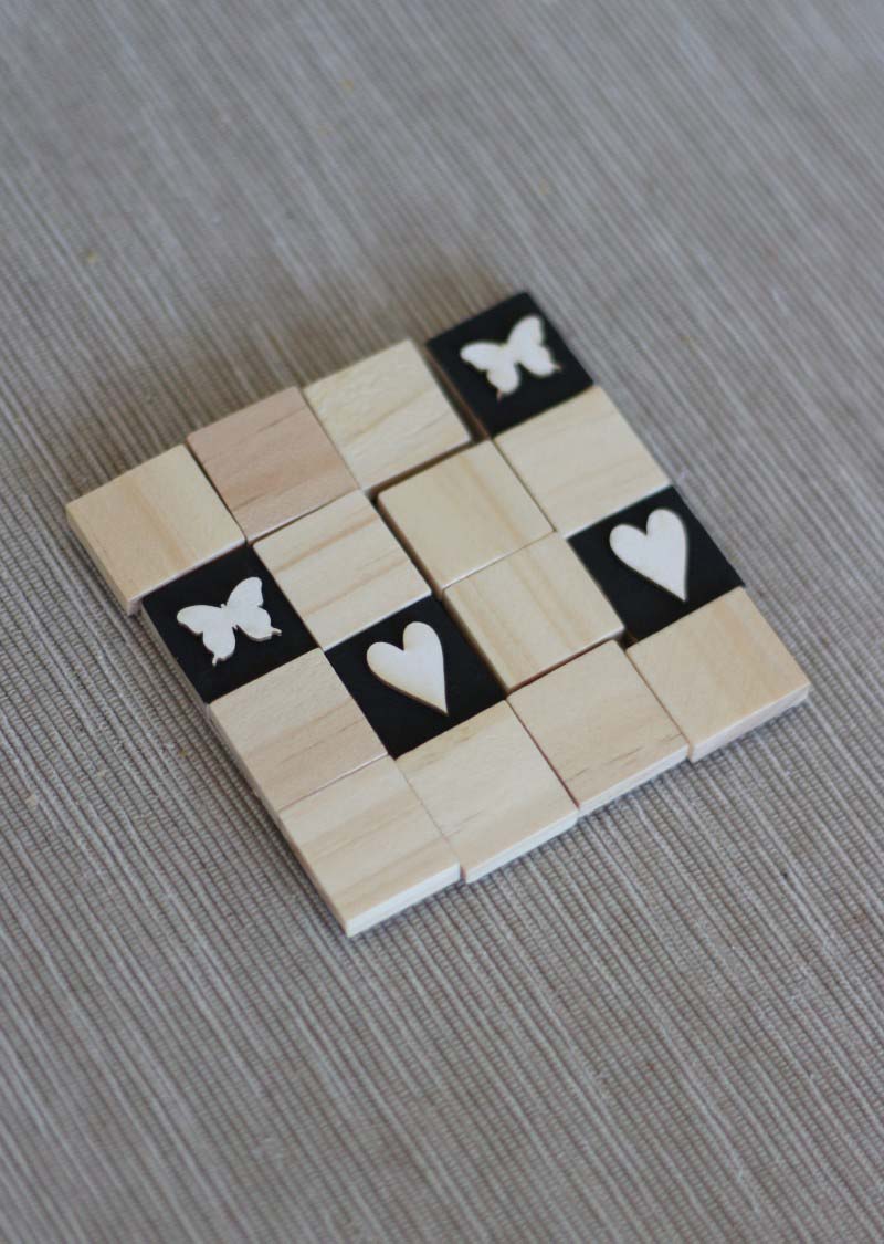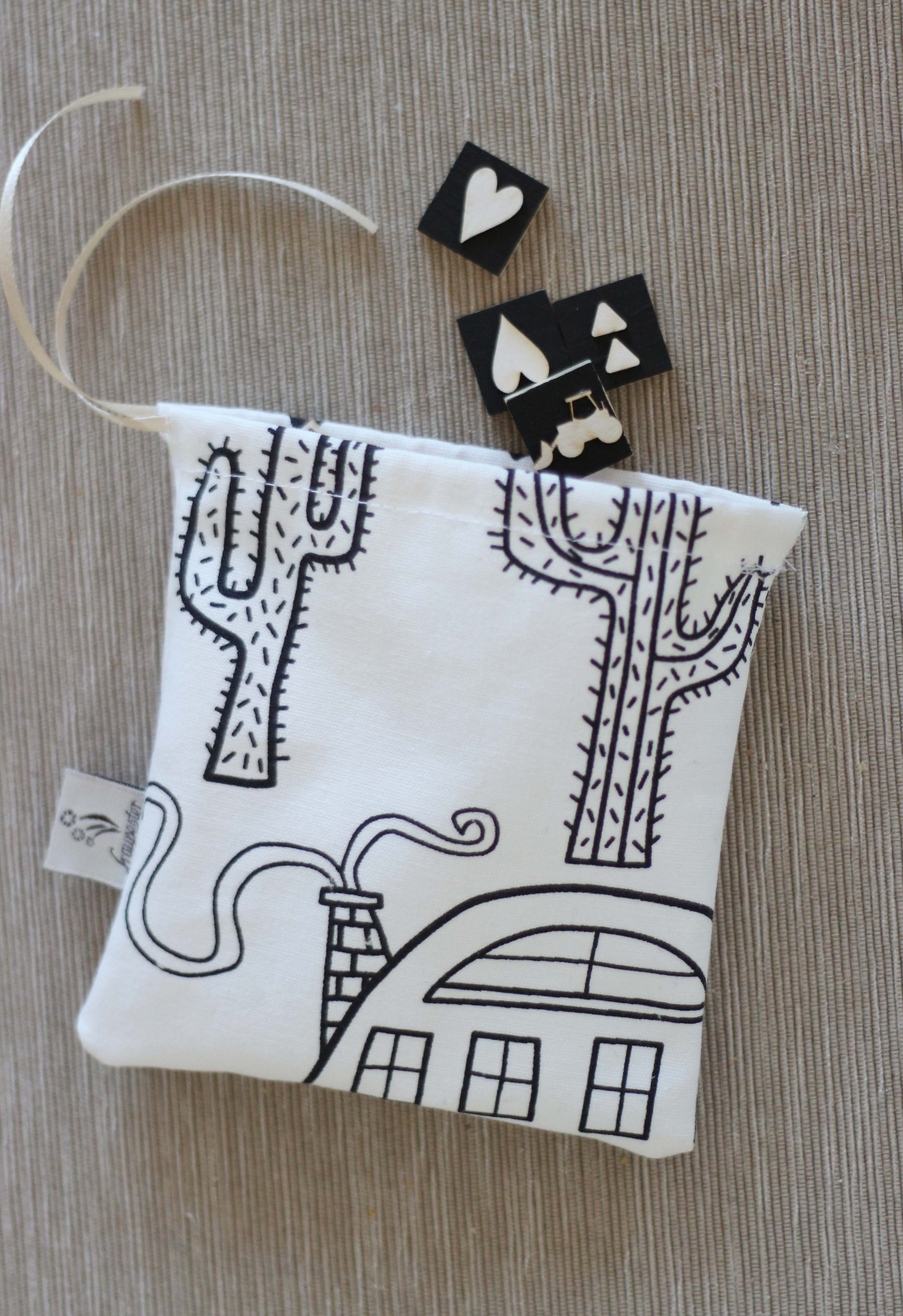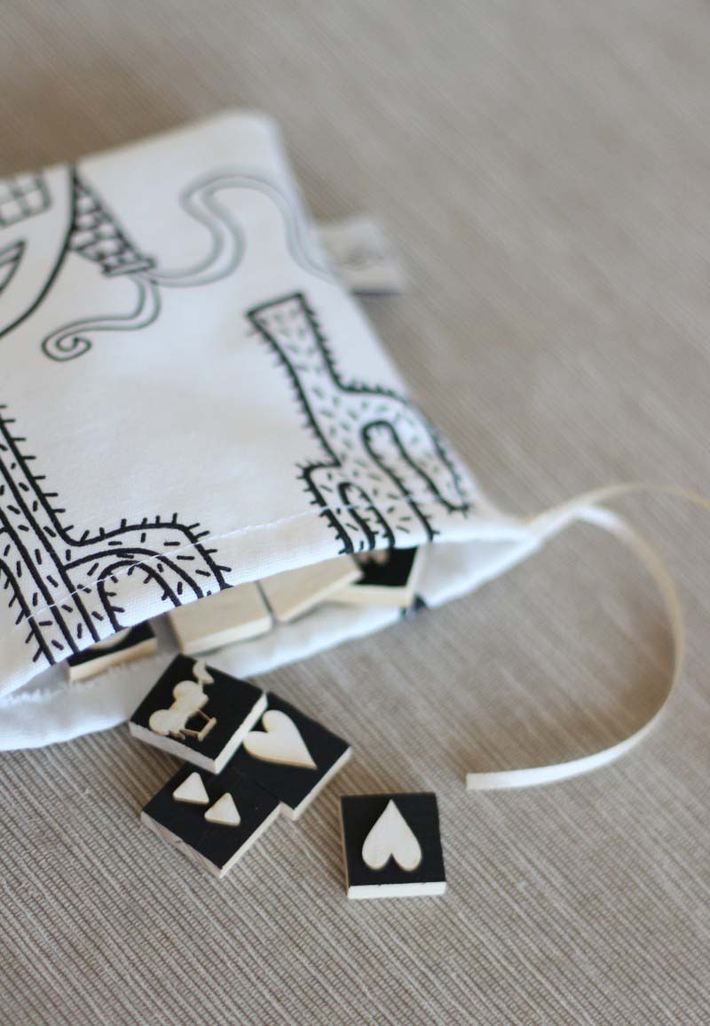 Volt itthon pár használaton kívüli scrabble betűm, amit legfőképp dekorációs célra használtam korábban. Lefestettem a betűs oldalukat és mini chipboard párokat ragasztottam fel rájuk. (Természetesen scrabble betűk hiányában vastagabb kartonlapra is elkészíthető.) Majd varrtam egy kis zsákot hozzá, hogy könnyen tárolhassuk, anélkül, hogy elkeverednének.