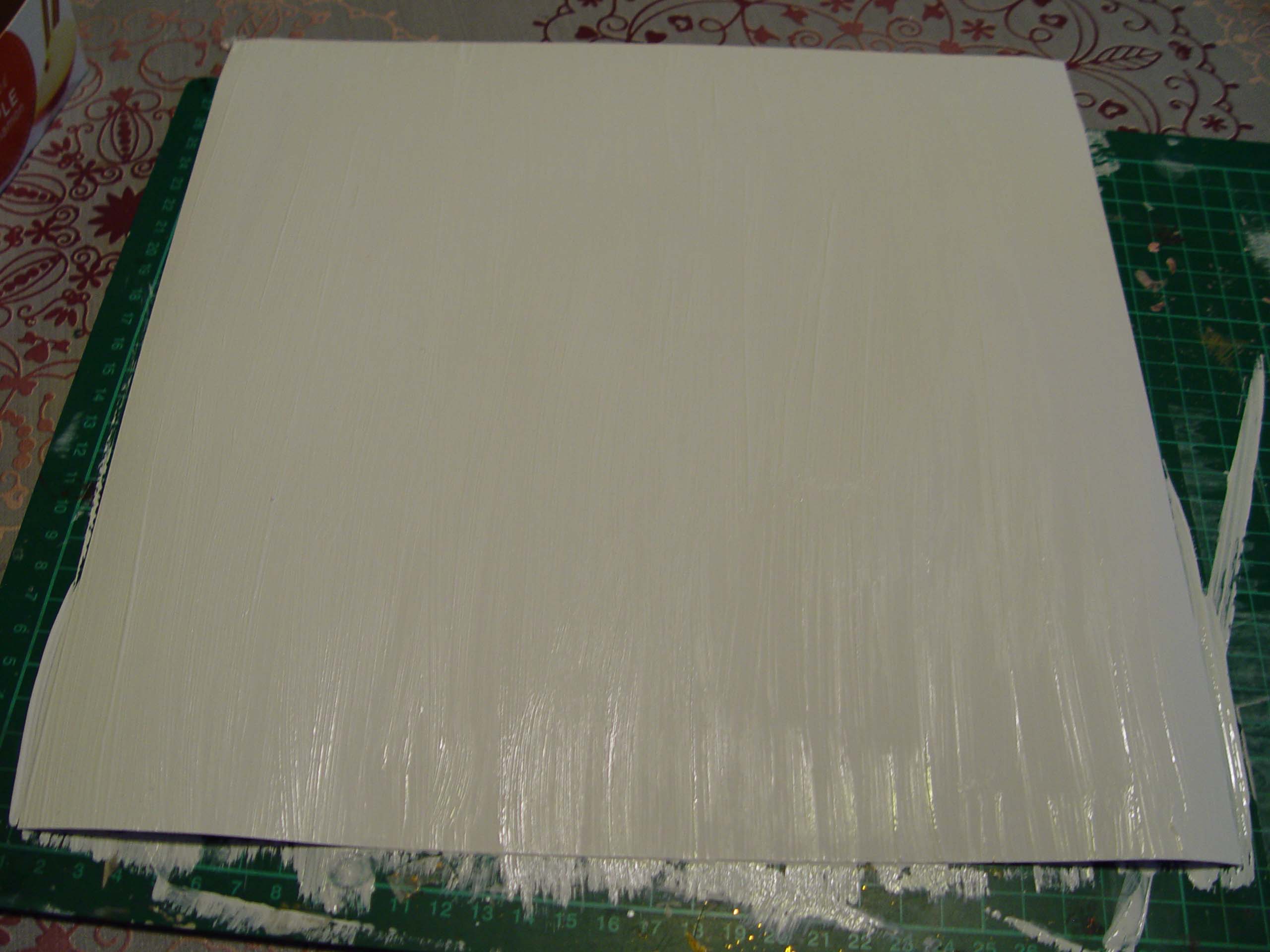 1. A fehér alapkartont lefestjük a gessoval vagy a fehér akrilfestékkel. Ügyeljünk rá, hogy mindenhova jusson, akár kétszer is lekenhetjük.