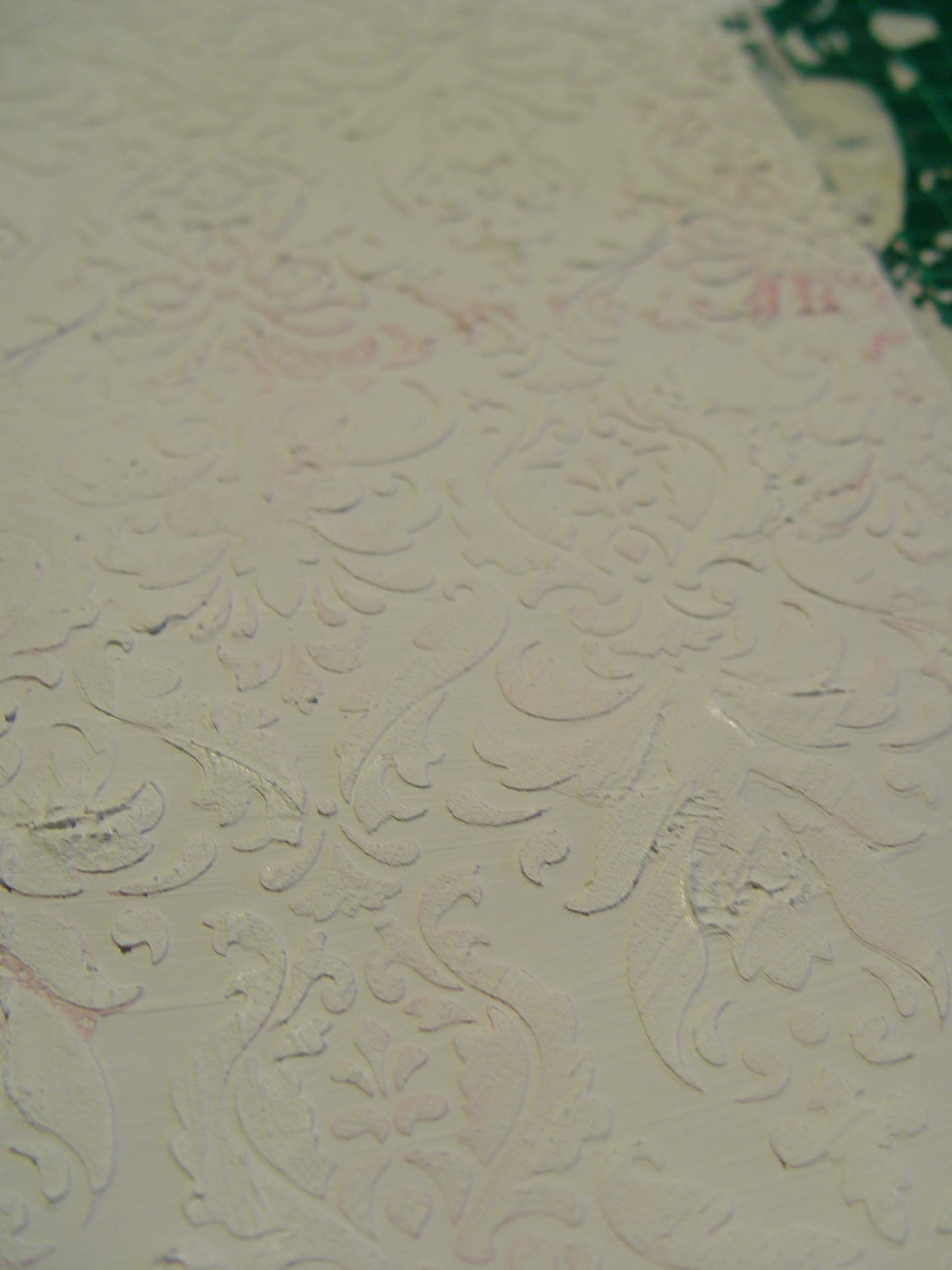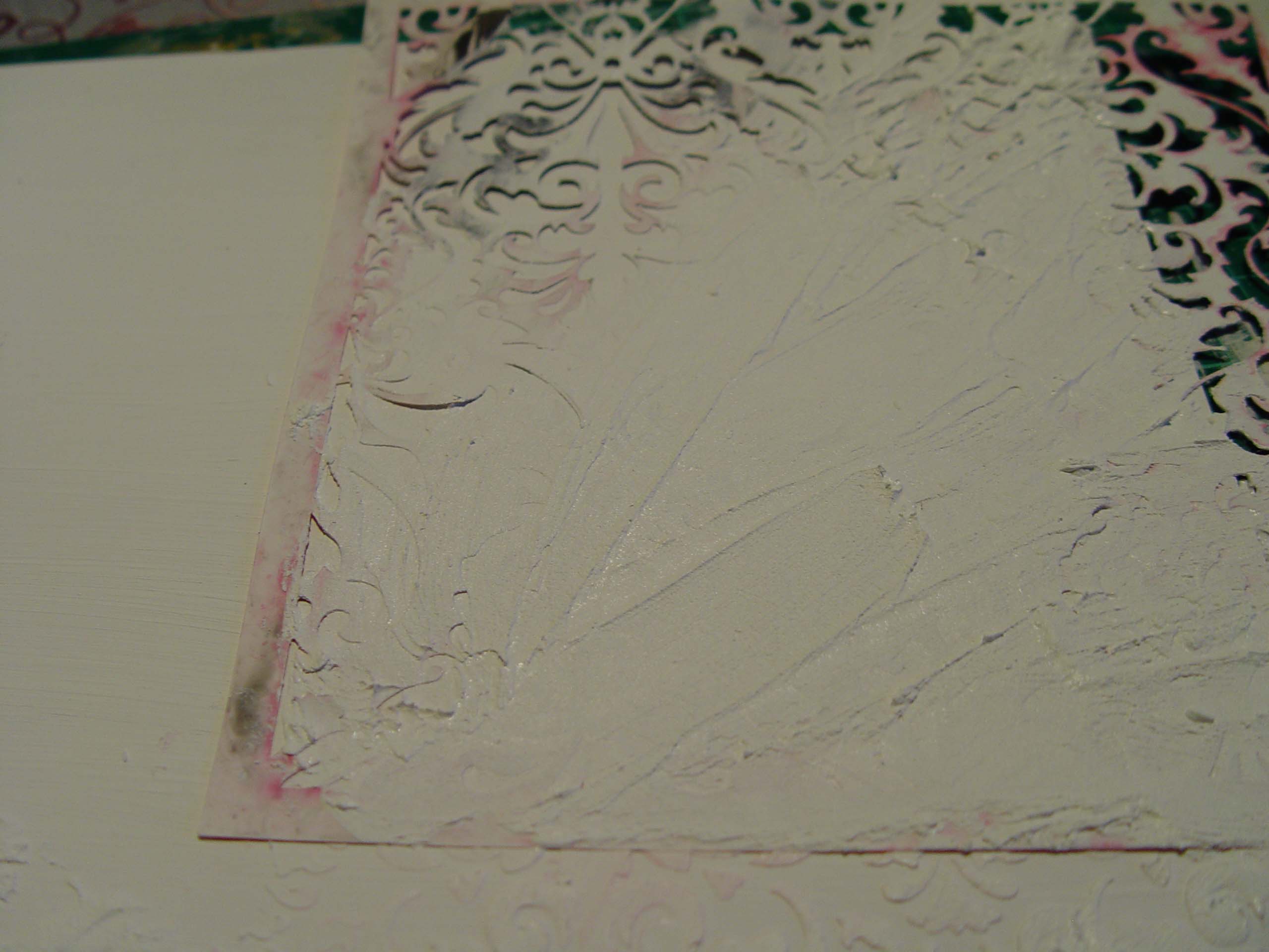 2. Stuktúrpaszta és stencil segítségével felviszünk egy tetszőleges mintát a kartonra. Lehetőleg jó sűrű mintát válasszunk! A papír fele elég egy teásdobozra, tehát az egyik felére mehet egy minta, a másikra meg másmilyen, így két teásdobozra elegendő papírt kapunk.