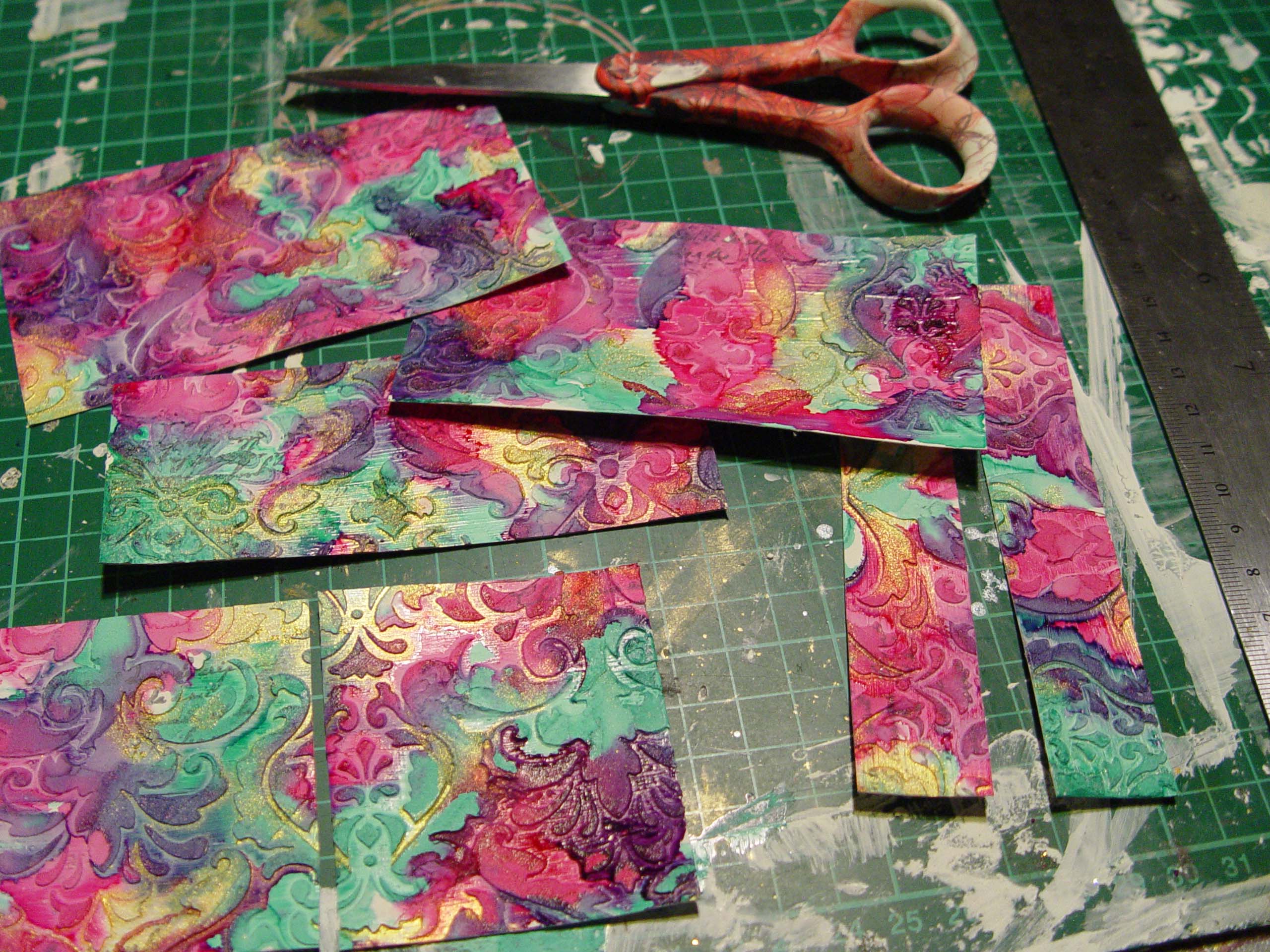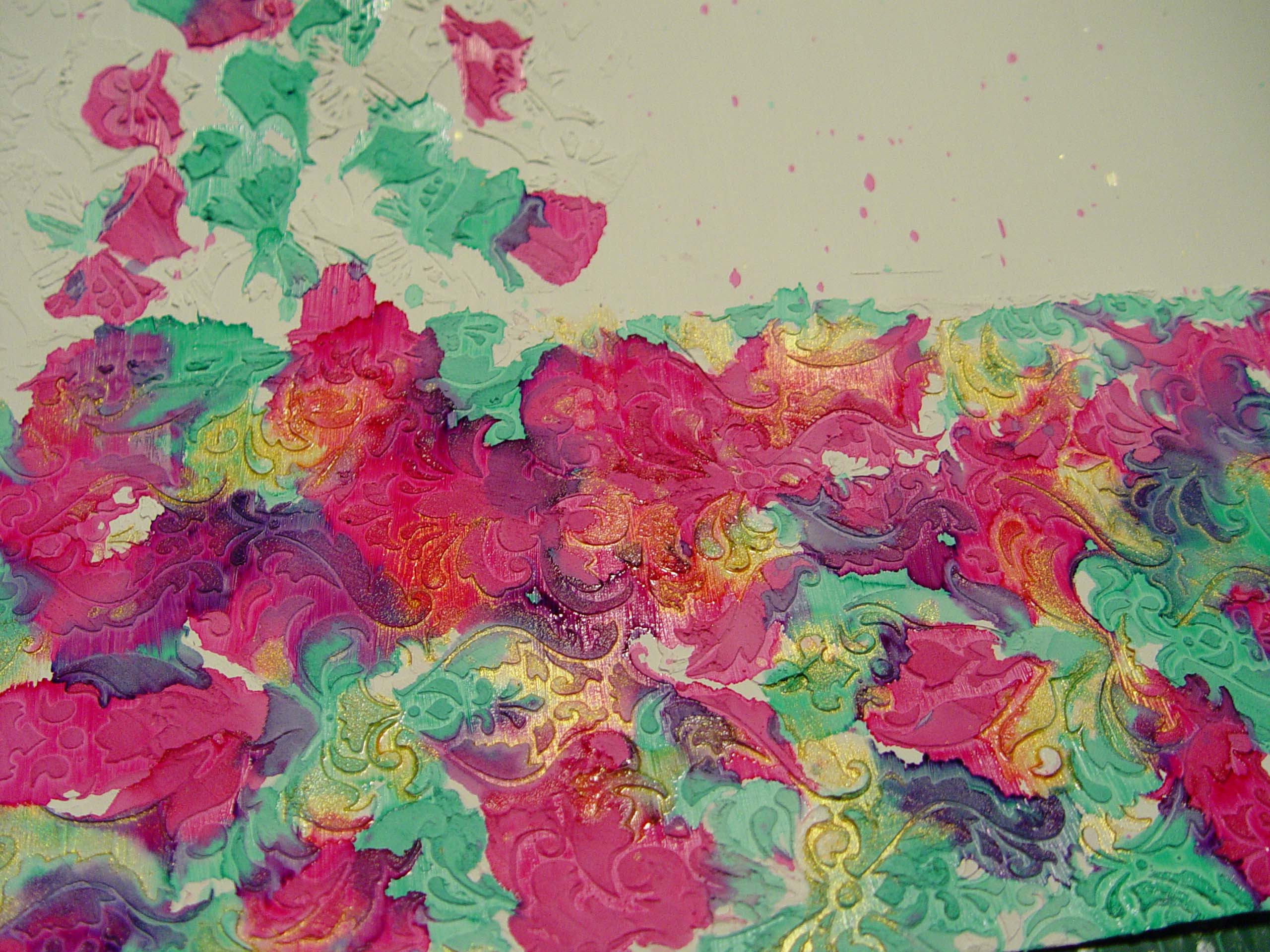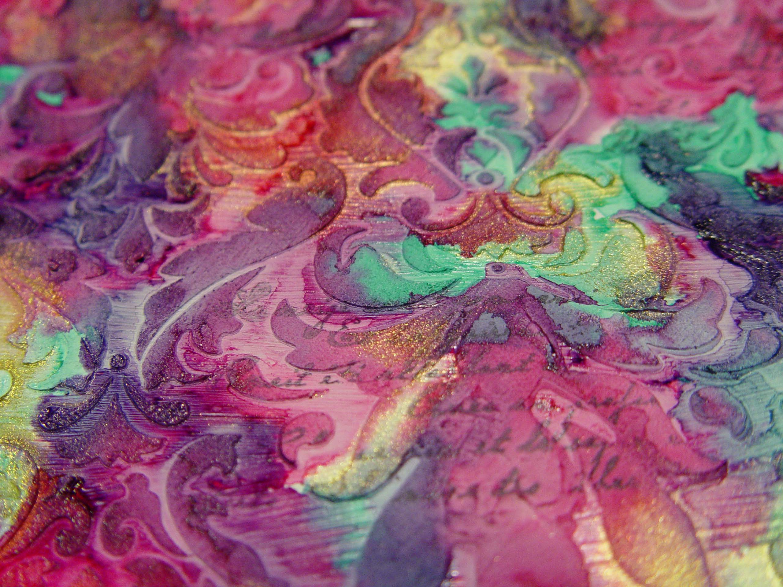 3. Ha TELJESEN megszáradt a stuktúrpaszta, akkor mehet rá a media ink, tetszőleges színekben. Csepegtethetitek, folyathatjátok, ahogy tetszik! Én pinket, türkizt és aranyat használtam az enyémen. Ha megszárad a media ink, akkor alkoholos tintával és bélyegzővel bélyegezhetünk is rá itt-ott…én egy szöveges szilikon bélyegzőt és fekete StazOn-t használtam.