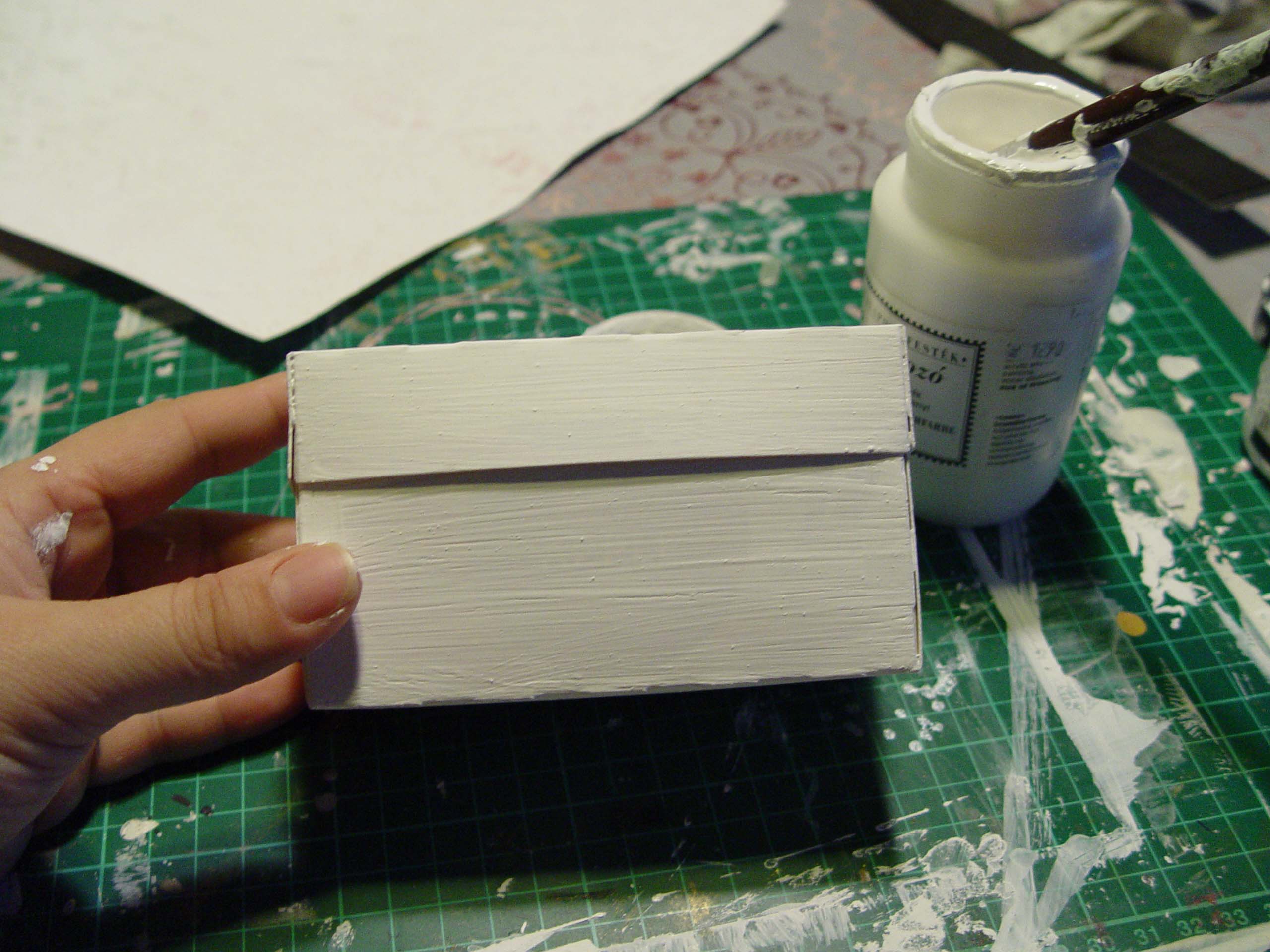 4. Lealapozzuk a dobozt is, fehér akril festékkel, vagy gessoval, két rétegben. Voltaképpen elég az éleket és a talpat lekenni, a többi nem látszik majd, de én inkább mindenhol lekentem, ez ugyanis egy kis tartást is ad a doboznak.