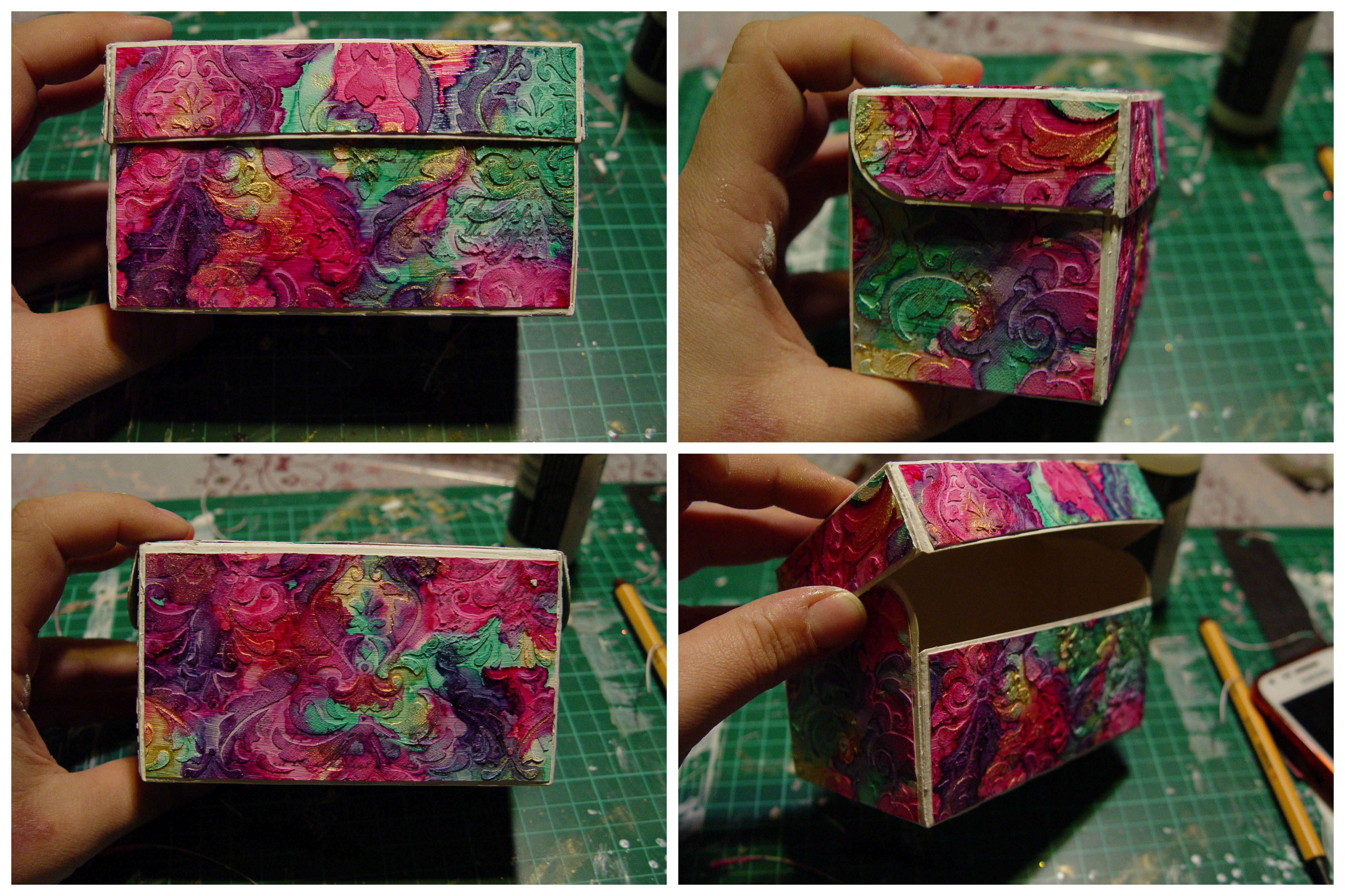 5. Ezzel kész a papír. A teásdobozunk alapján méretre vágjuk a papírt, úgy, hogy minden oldalra (kivéve az alja) jusson egy darabka, úgy, hogy hagyunk egy miliméternyi peremet körbe mindenhol.