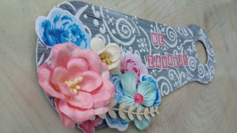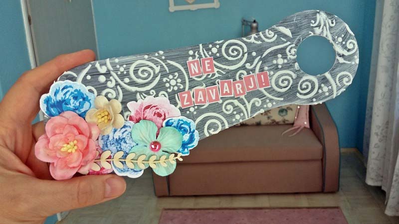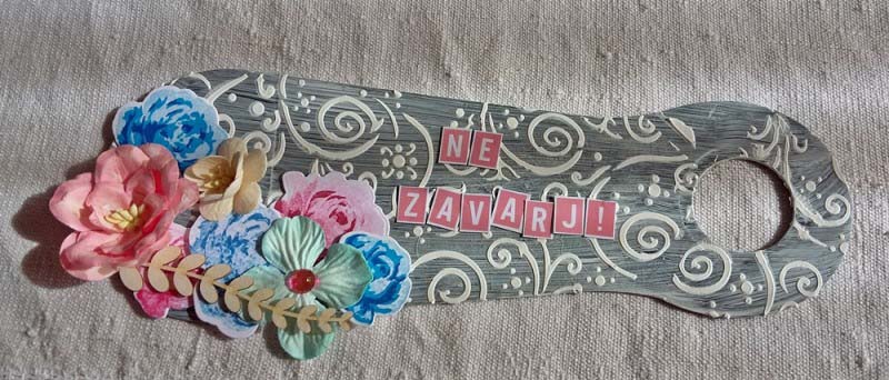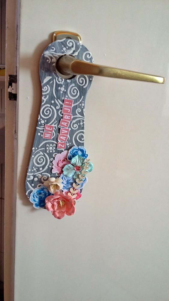 Először is lealapoztam a titokzokni merevítőt, csak úgy tessék-lássék, nem vittem túlzásba, majd gyorsan vágtam rá egy megfelelő méretű lyukat, amivel fel lehet akasztani a kilincsre. Stencileztem rá romantikus mintát, és már csak a felirat és a díszítés hiányzott.