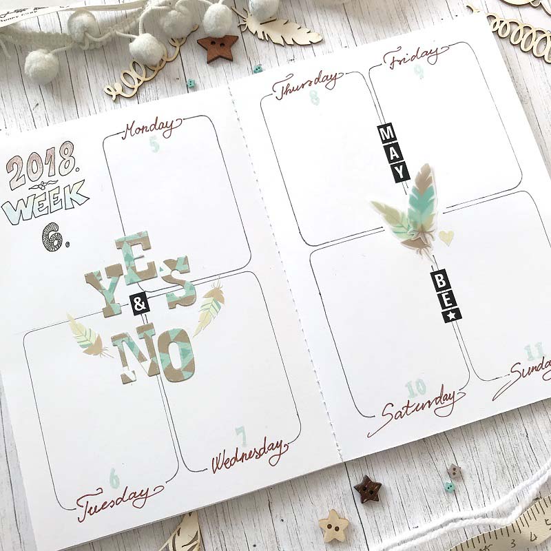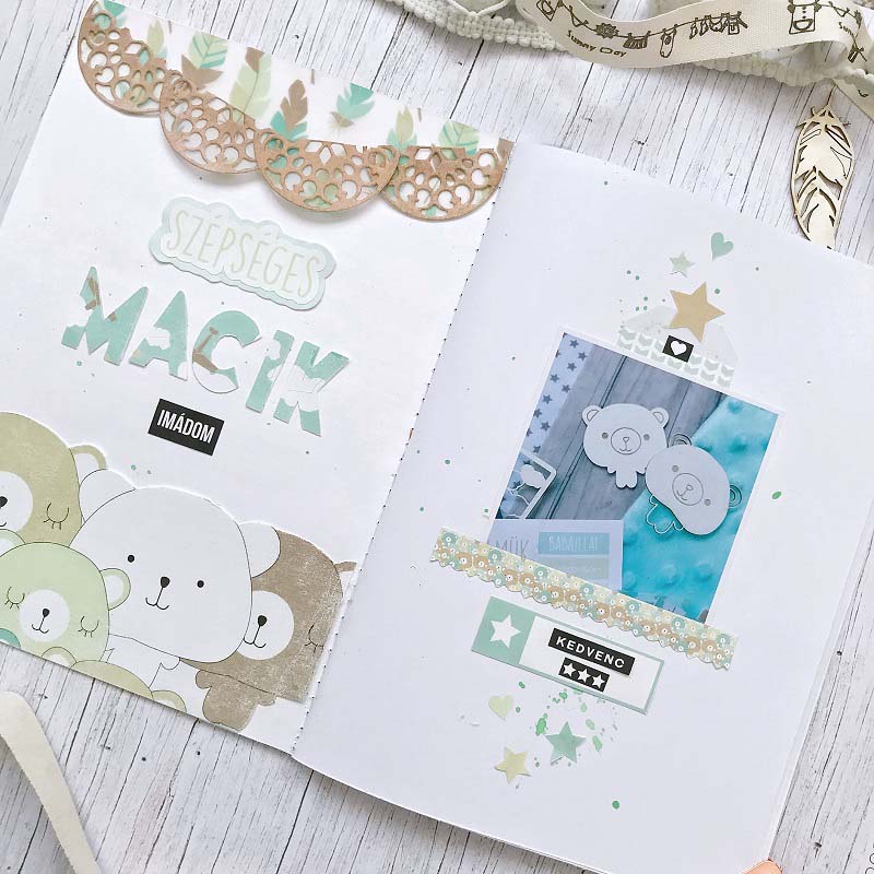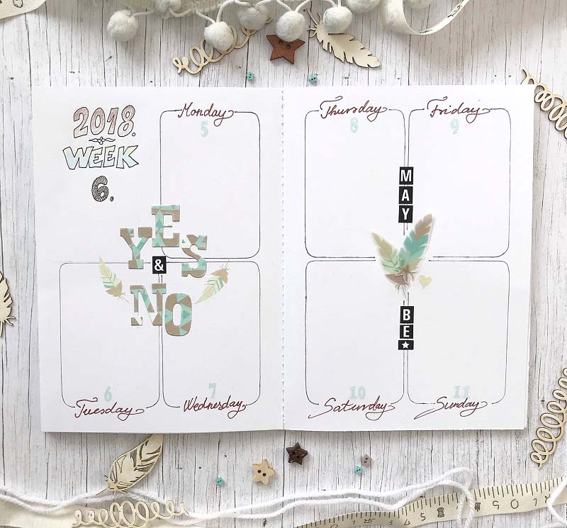 A füzetek B6-os méretűek, egy oldalpár egy hetet fed le, a következő oldalpárra pedig az adott hétnek egy emlékezetes pillanatának megörökítése kerül. Készítettem egy jegyzetelős, ötletelős, vázlatolós füzetet is, aminek az elejére egy kis inspiráló szöveg került.