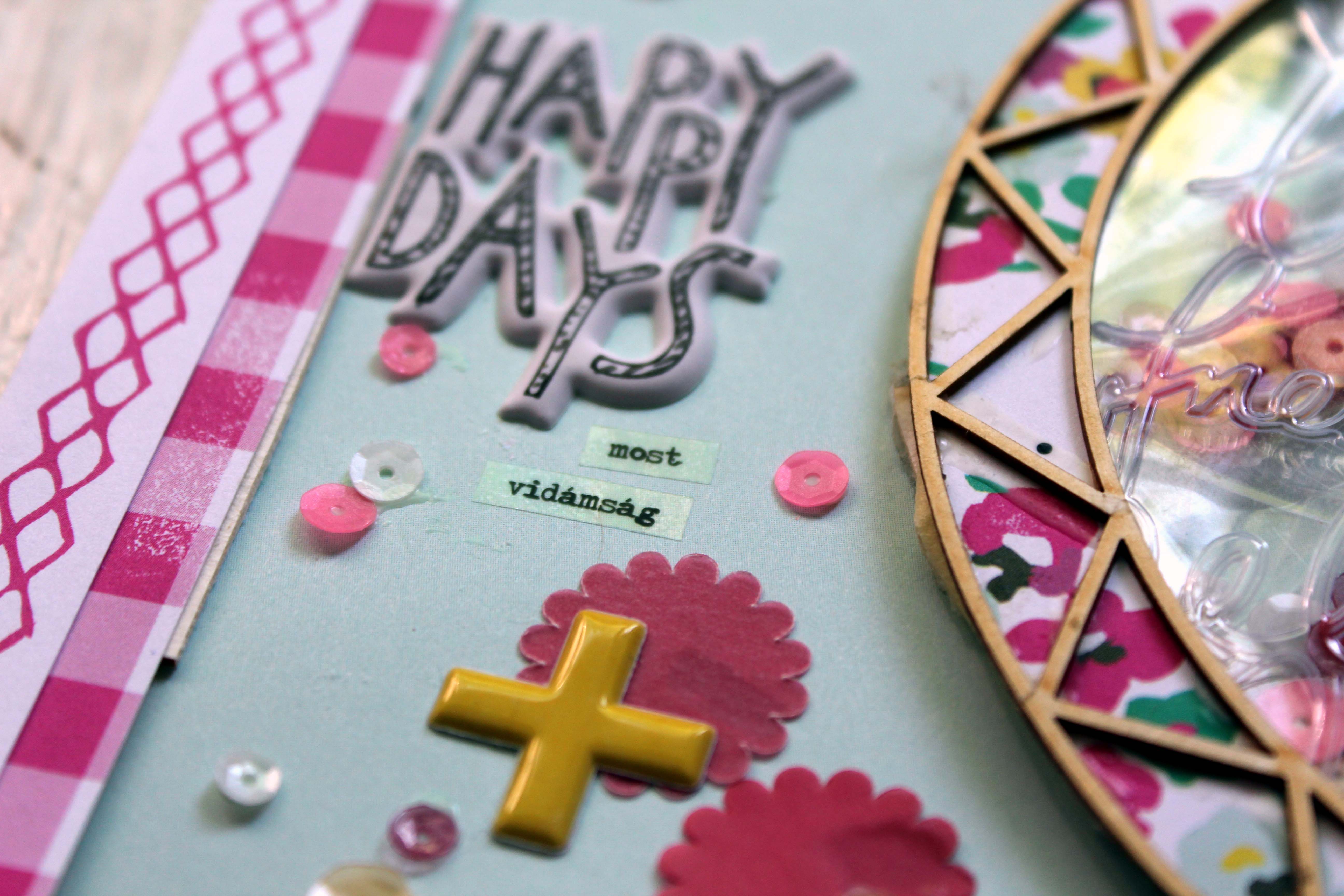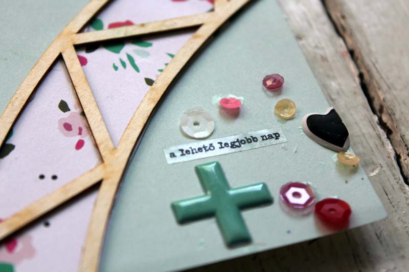 Tudom, tudom, hogy kezdek állati uncsi lenni a shaker box mániámmal, de mit tegyek, egyszerűen odáig vagyok értük… szűnni nem akaró rajongással viseltetek irányukba, hogy költőien fogalmazzak. 😀 ÍGy aztán a kisebbik körgyűrűre Sizzix-szel domborított fóliát tettem, majd alá egy zacsiba flittereket, végül az egészet felragasztottam 3D ragasztóval a papírra. Ezen kívül semmi ördöngősség nem történt, semmi festés, semmi rétegzés, csak némi flitter itt-ott, és slussz.