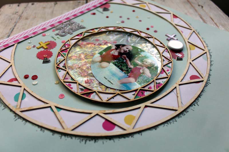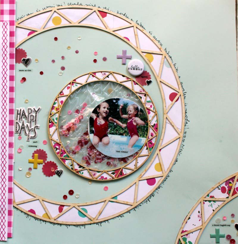 Na, azután, hoyg hosszasan sajnáltattam magam sanyarú gyerekkorom okán, térjünk rá az oldalra. Az úgy volt, hogy maradt két darab körgyűrű csipim, ugye. A kicsi, és a nagy. Gondolkodtam mihez kezdjek velük, ötletem az akadt jónéhány, de valahogy egyik sem volt olyan "naezleszaz!" típusú…míg nem eszembe jutott az a remek fotó, amit a lánykáimról lőttem medencézés közben, és mit tagadjam, egészen jól sikerült. Ahhoz képest is, hogy én csináltam, meg ahhoz képest is, hogy csak telóval lőttem. Mikor ez a kép eszembe ötlött, már nem volt megállás, özönlöttek a gondolatok a fejembe, és már készen is volt az oldal szinte.
