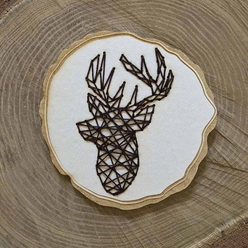 A szarvasra nagyon kíváncsi voltam. Tudtam, hogy ez ütős lesz. És az is lett! Itt „hagyományos” barna színű hímző cérnát használtam. Imádom ezt a színt és imádom, ahogy a világos chipboardon kirajzolódik a sötét szarvas minta.