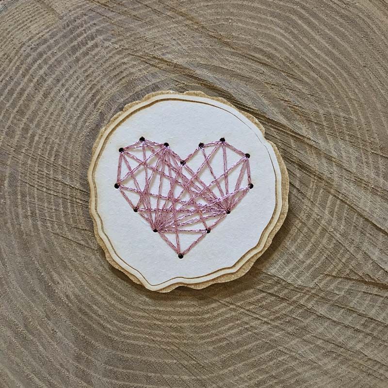A szívhez egy ezüst szálal kombinált rózsaszínű cérnát választottam, amivel először körbeöltöttem a szívet, majd választottam egy lyukat és abból kiindulva sugárszerűen öltögettem ki, előbb egy szállal, majd két szállal. Választottam még két másik lyukat és azt is hasonló tematikával öltögettem. Ennek az az érdekessége, hogy a hátulján is ugyan így néz ki, csak a tükörképe. J