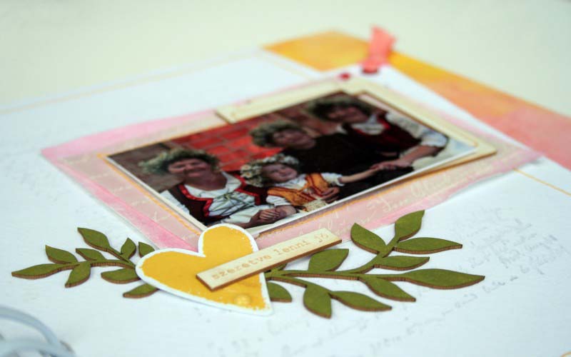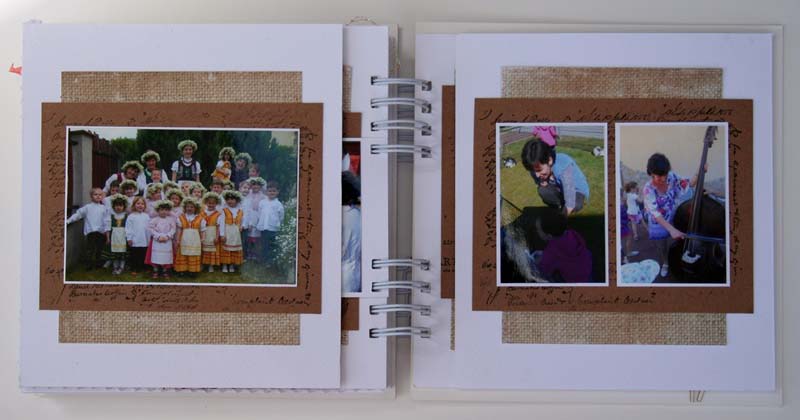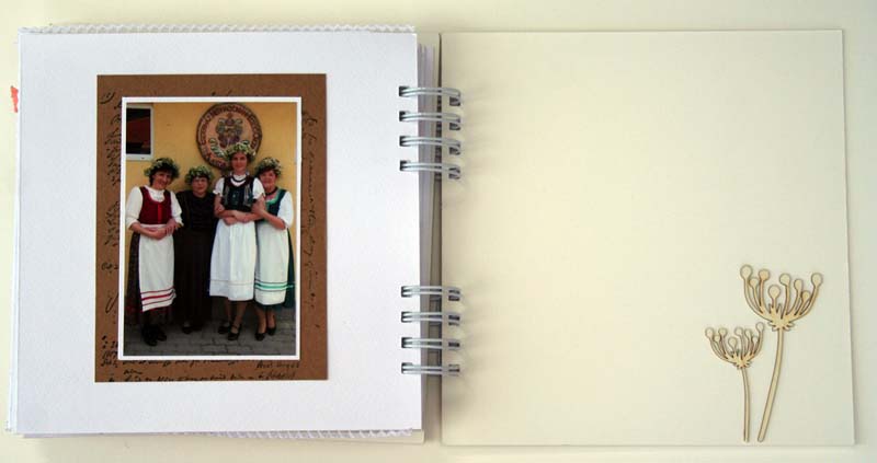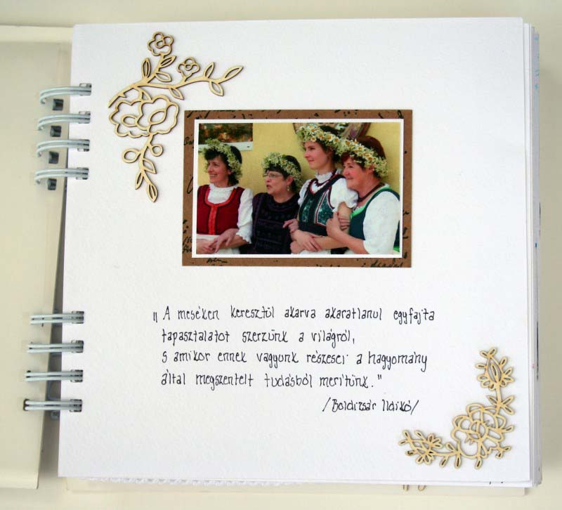 A borítóhoz Silhouette gép segítségével kraft kartonból népies motívumot vágtam, amit 3D ragasztóval kis eltartással ragasztottam a natúran hagyott múzeumkartonra. A belső oldalakon egy-két helyen sváb motívumos és pitypangos NCSD chipboardot használtam.