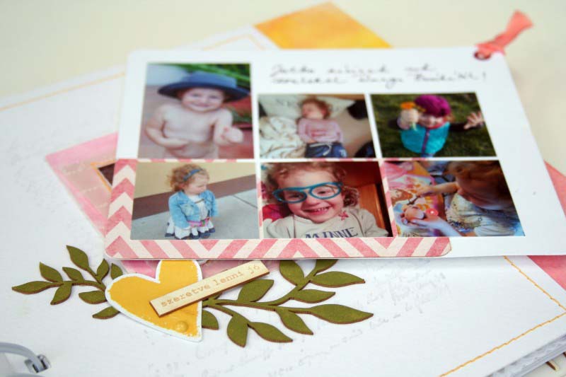 A saját oldalunk nagyon kalandosan készült, tekintve, hogy Borókámat egy pillanatra sem lehet egyedül hagyni: a gyönyörűen megrajzolt oldalait először összepecsételte, majd egy másik alkalommal szépen körbe vágta őket. Úgy mentettem, hogy a rajzokat kivágtam és újra felragasztottam. A másik oldalunkra egy kis zsebbe további képeket és egy kis üzenetet rejtettem el.