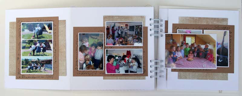 A fotókönyv ötletét egy olyan albumra cseréltük, amiben minden gyermeknek két oldalnyi alkotás jutott. A hozzávaló papírokat méretre vágattam a Pantonban, majd mindenki megkapta a 20*20 cm-es lapokat. A kicsik rajzolhattak, festhettek, hímezhettek, a szülők pedig képeket ragasztottak bele (tehát scrapbookoztak 😀 ). Az album utolsó oldalaira olyan fotók kerültek, amiket az ovis események fotóiből szemezgettem. Annyi fotó gyűlt össze, amit sajnáltam volna kihagyni, hogy végül kihajthatóra készítettem.