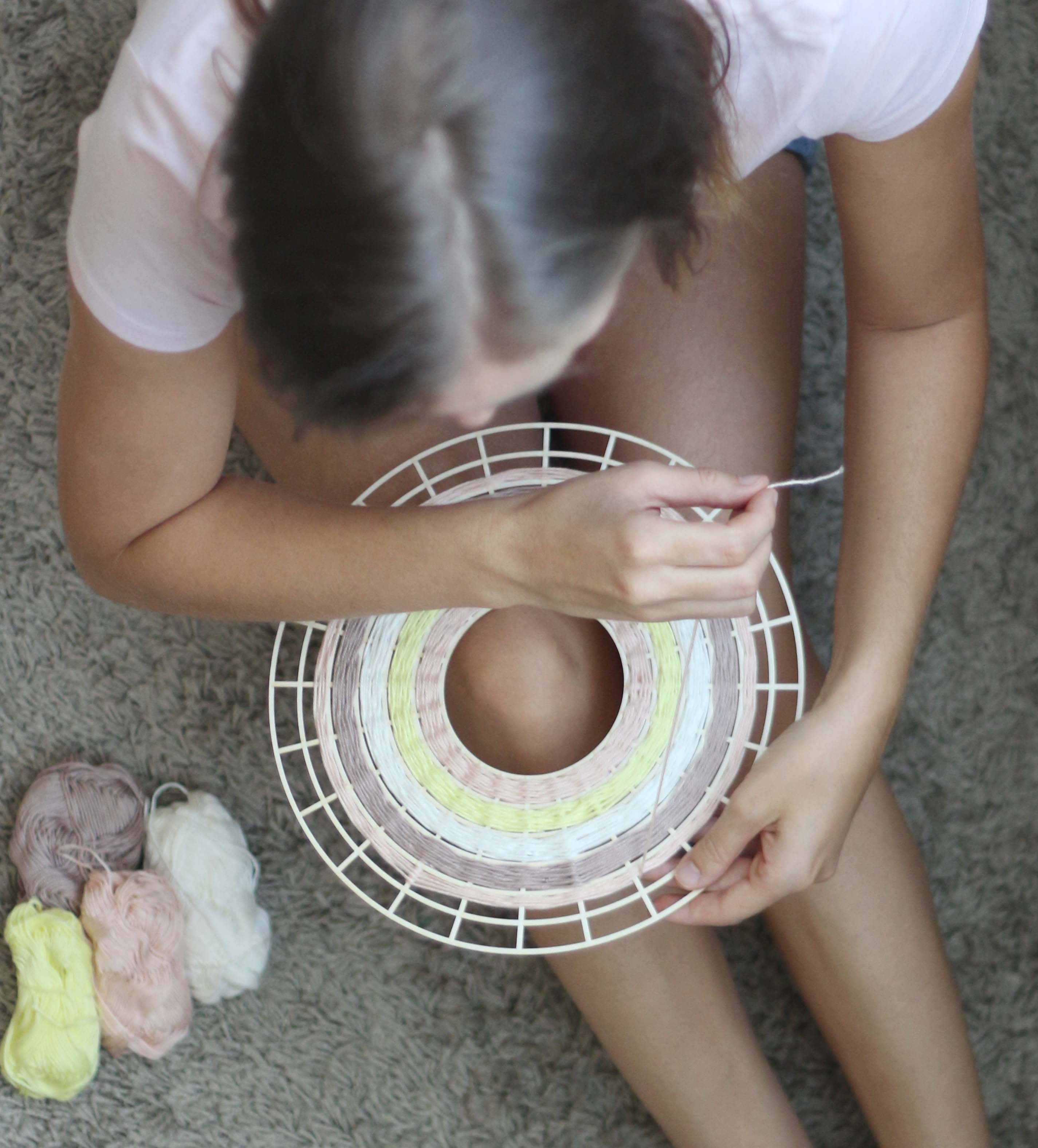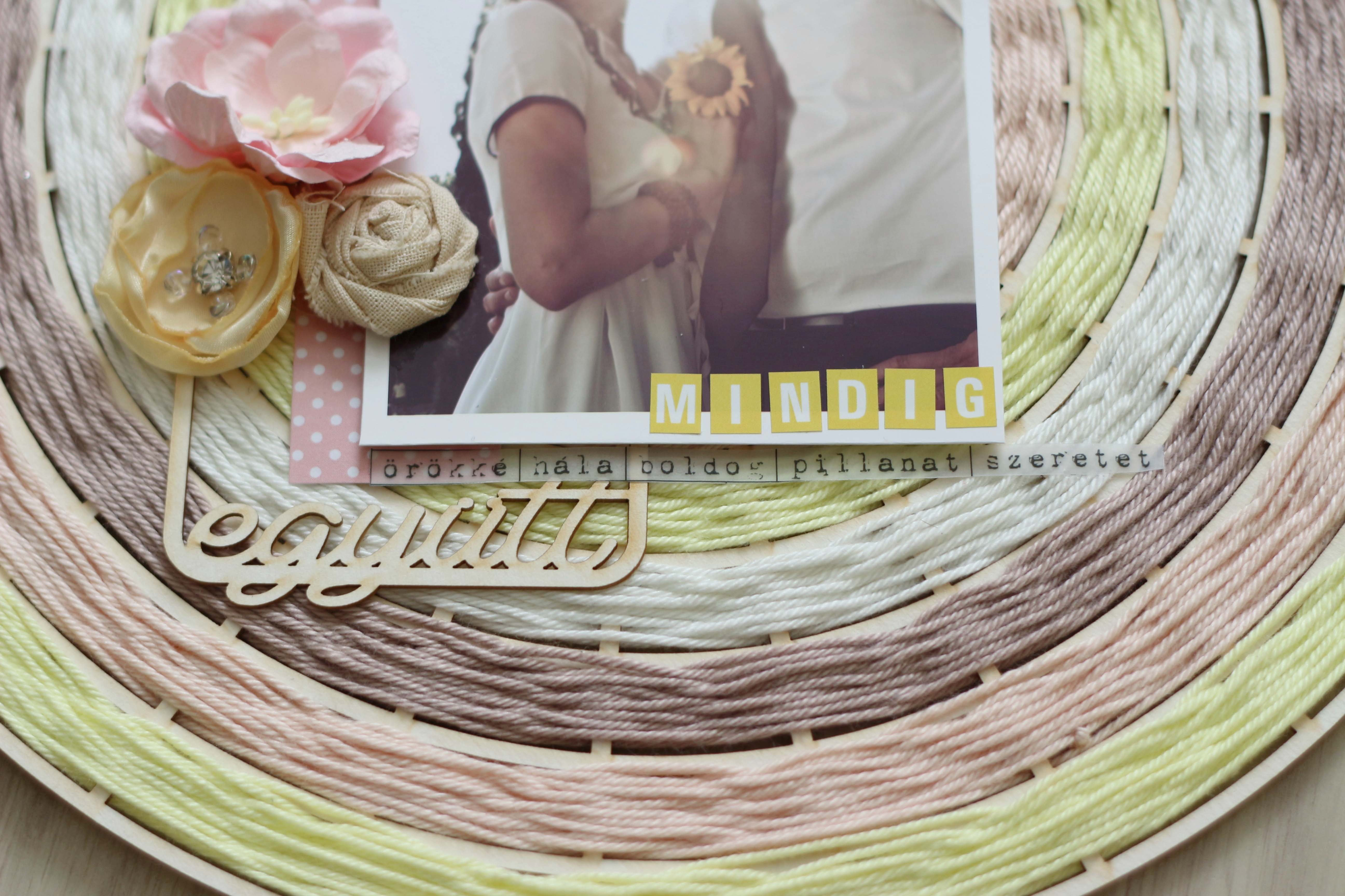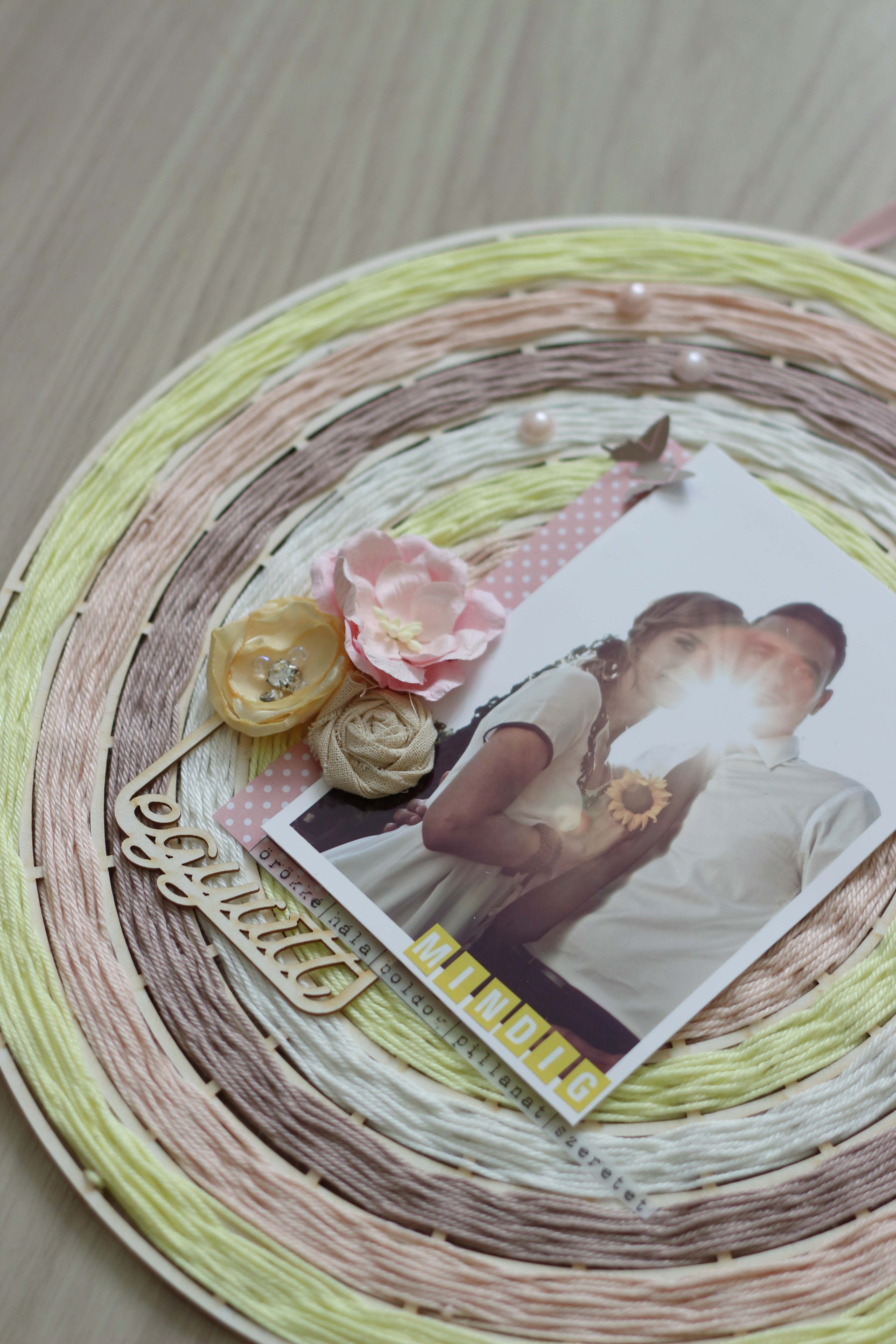 A fő színvilágot a pasztell színű fonalak adták, amiket belefűztem a keretbe. Nem mondom, hogy ez életem eddigi leggyorsabban elkészült inspirációja, de mindenképpen megérte a sok bíbelődés. Az alap szinte rámaként szolgált és a befűzött fonalak egy nagyon különleges textúrát adtak, amit utána hasonló színvilágú virágokkal és kiegészítőkkel díszítettem.