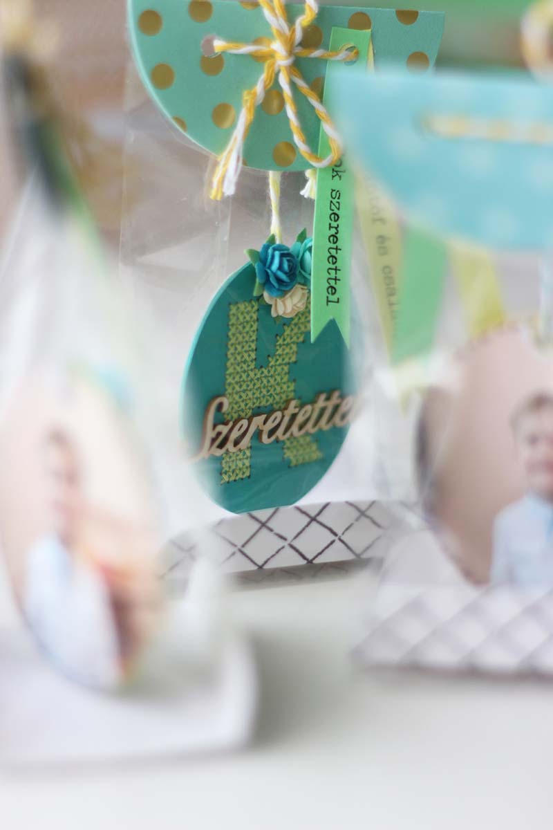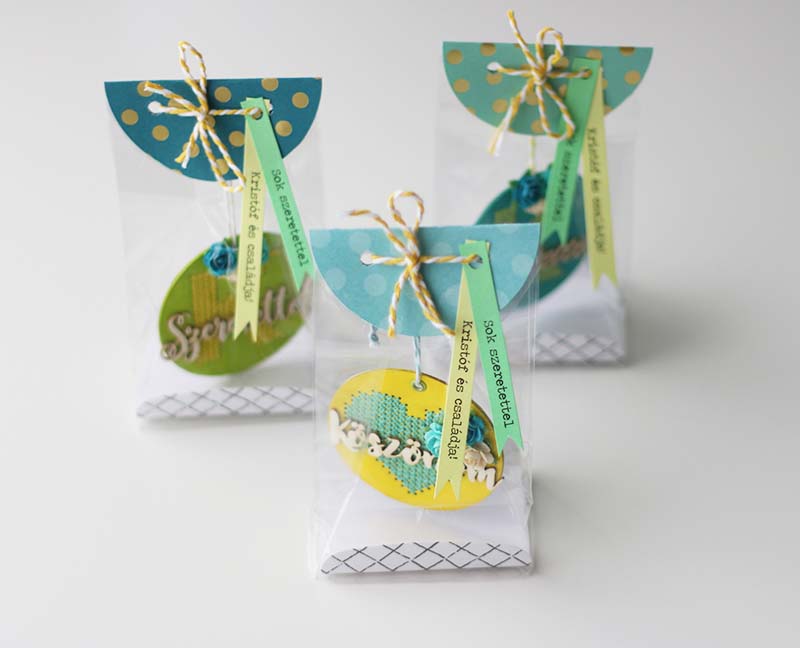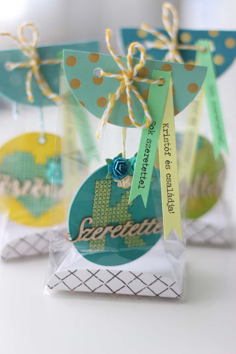 A csomagolást sem szerettem volna elaprózni, az Ikeában kapható GIVANE kis talpas zacskókba tettem, a tetejére pedig félkörívben rögzítettem a díszeket az akasztójuk által.