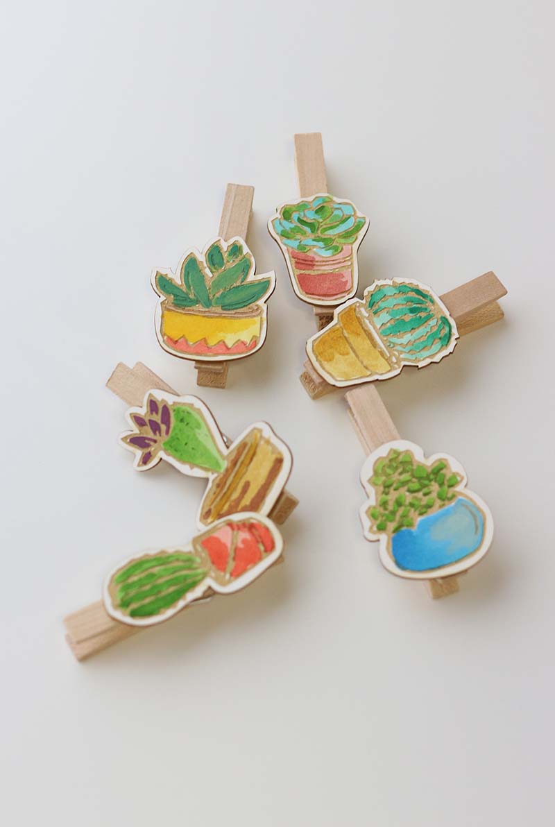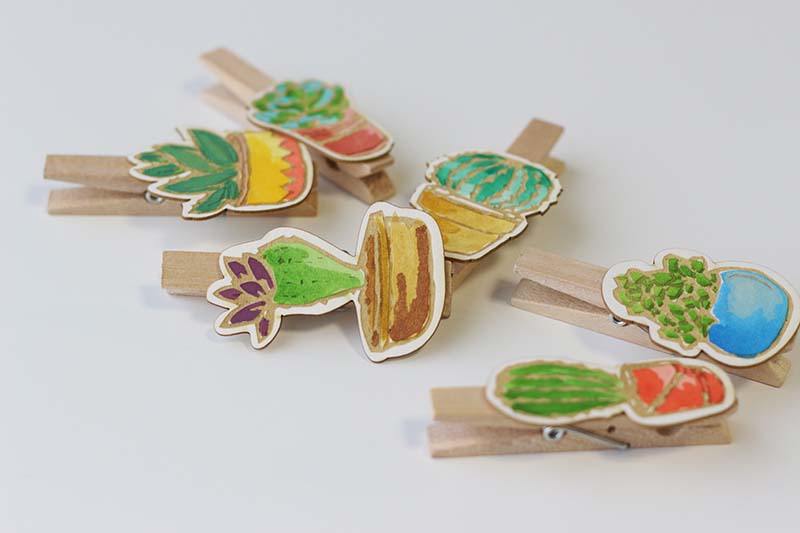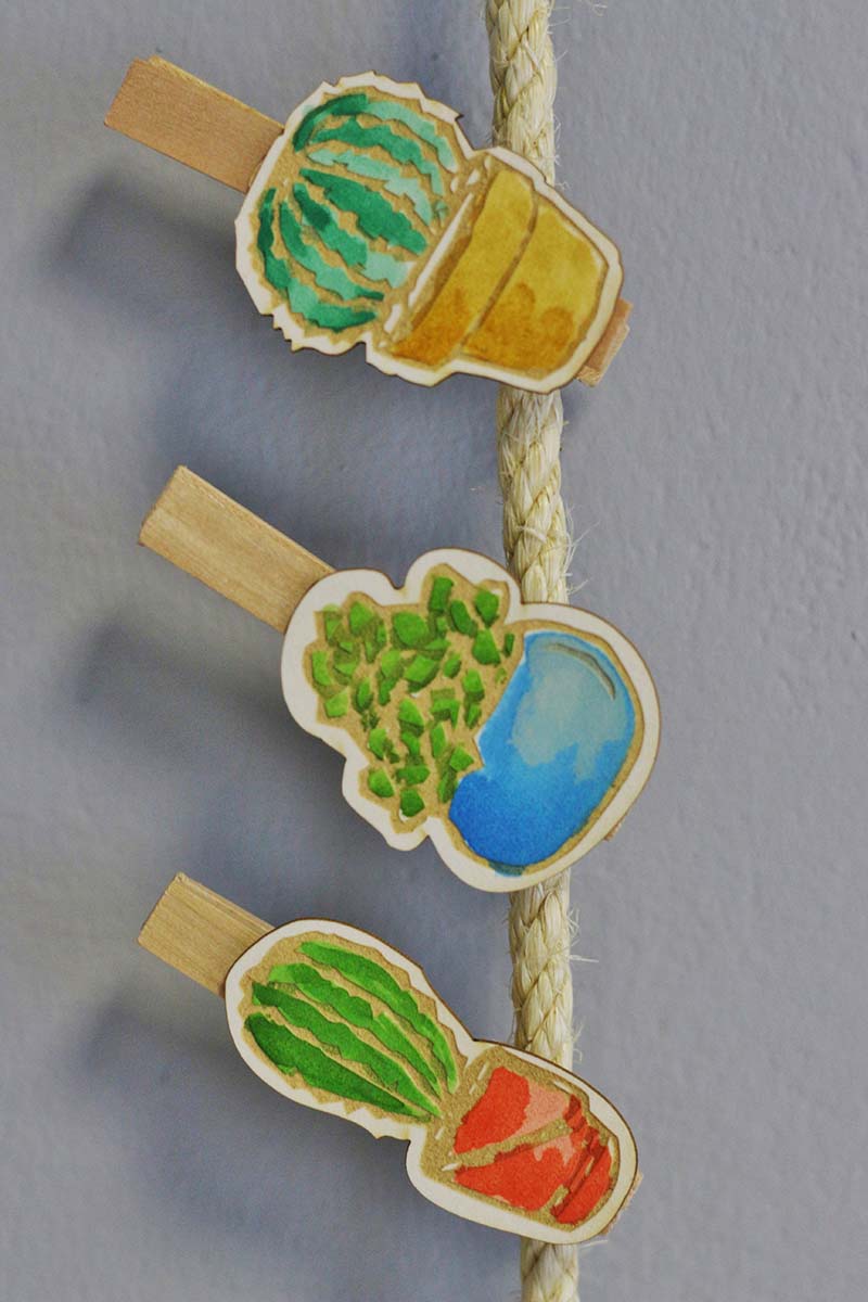 Ez a projekt sem igényel különösebb magyarázatot. A csipiket akvarell festékkel színeztem. Jó hír: szerintem nem lehet elrontani, még ha ki is mész a vonalból nem látványos. A pozsgás növények, különösen a kaktuszok most különösen divatosak a lakberendezés és a kreatív design világában. Szóval festésre fel, a felhasználási lehetőségek száma végtelen. Akár a hűtőre is alkalmazható kis üzenőként, egy vékony mágnes szalagot kell csak ragasztani a csipesz egyik szárára és már kész is!