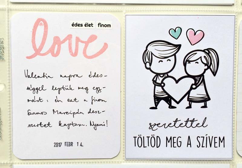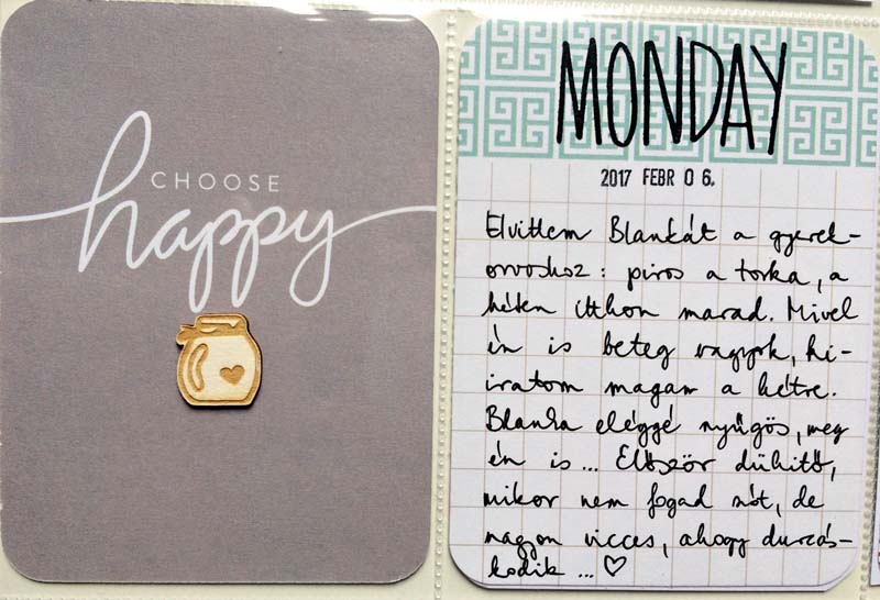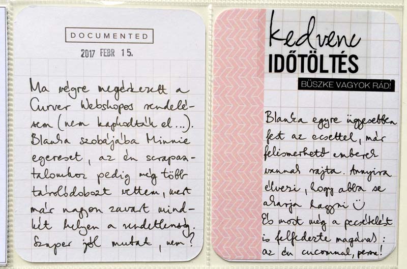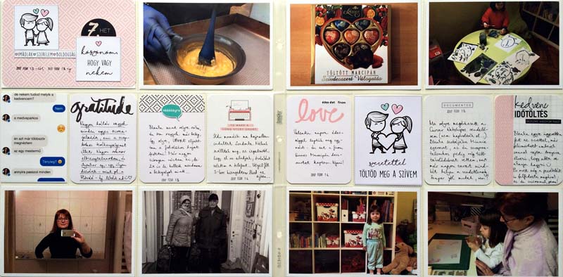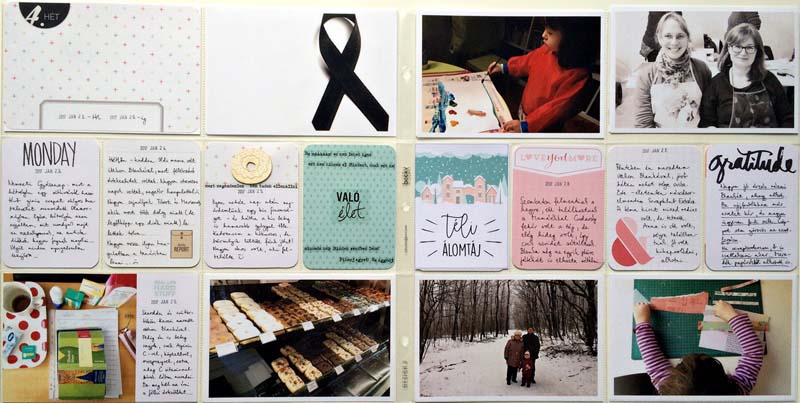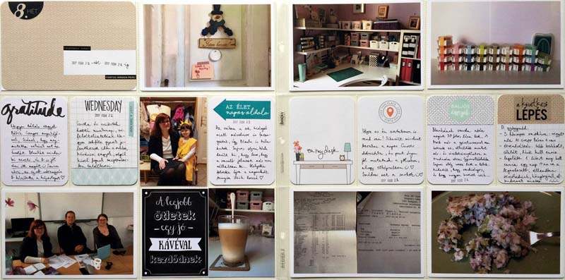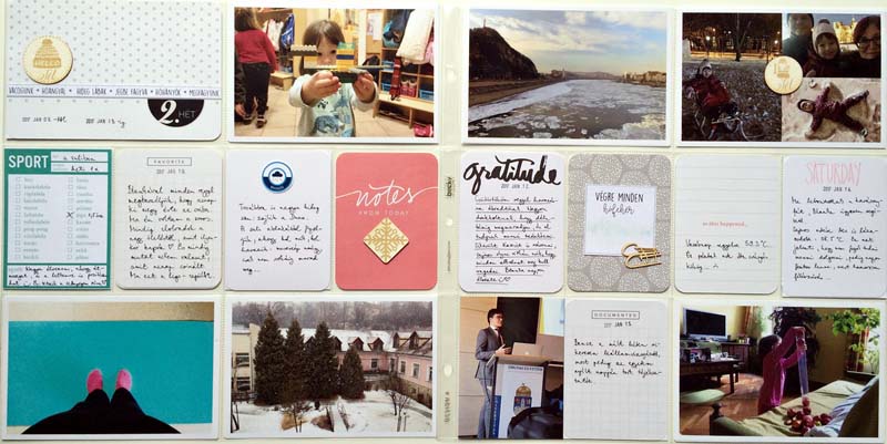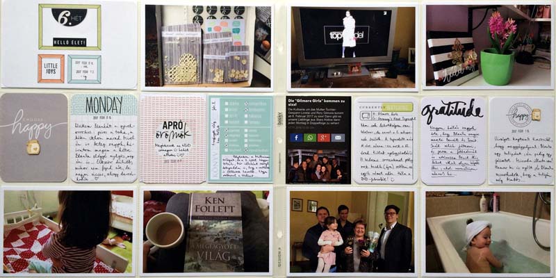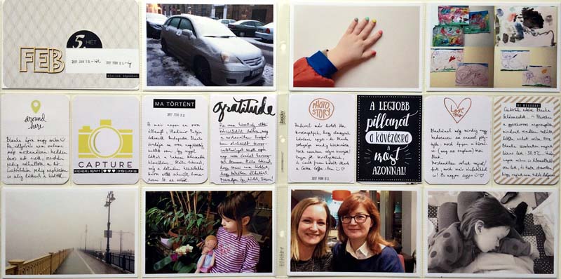 Egyszóval a Project Life az életem része maradt, többé-kevésbé rendületlenül fotózom a történéseket. A hetek dokumentálásához azonban csak később kezdtem hozzá, mert még mindig azon vacilláltam, hogy milyen legyen a stílusa. Közben gondolkodtam, nézegettem az eddigi oldalpárokat, és rájöttem, hogy szeretem, ha sok a fehér az oldalakon. A komment kártyákból is azokat választom inkább, illetve pecsételéssel, matricákkal szeretek saját kártyákat létrehozni.
