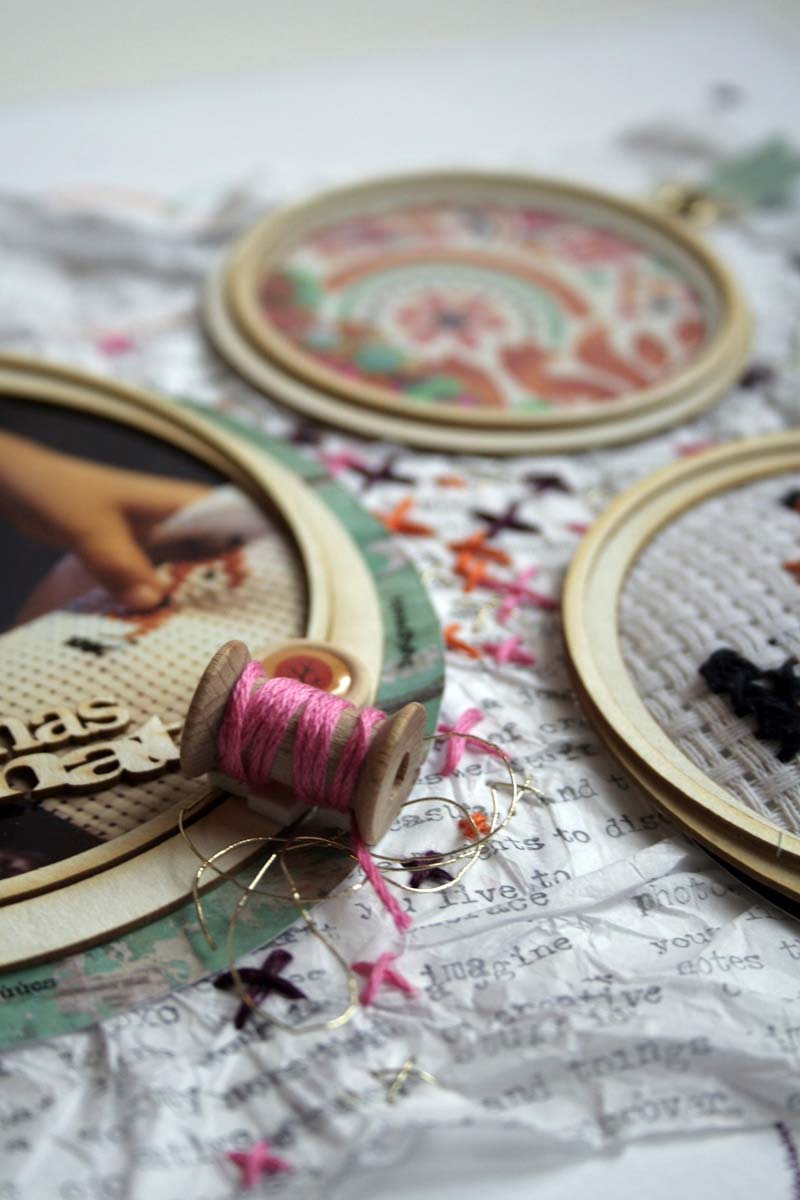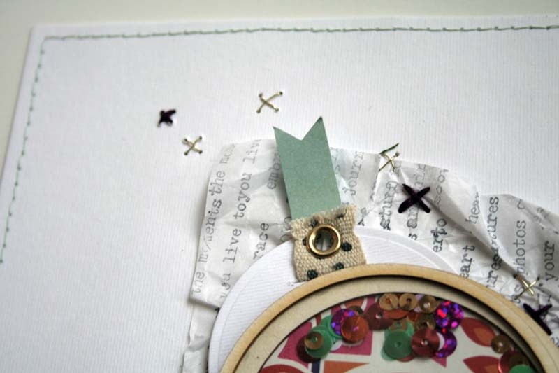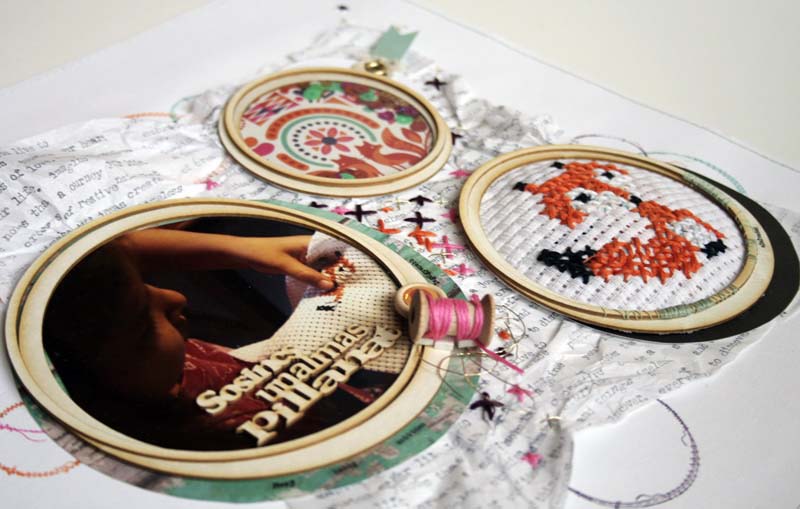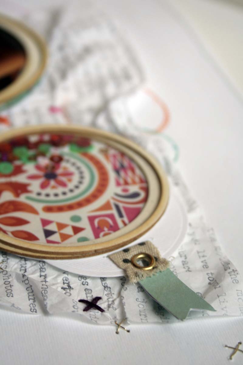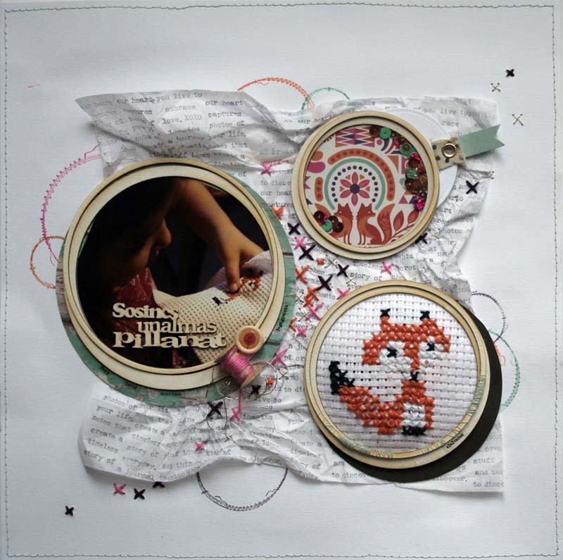 Mikor elkészültek a geometrikus chipboardok, jól betankoltam belőlük. Ehhez az oldalhoz pedig nem tudtam volna mást elképzelni, mint a köröket. Az egyikbe a fotó, a másikba egy shaker box, a harmadikba a róka került, ami Emi kis alkotásával olyan, mintha hímzőrámába lenne foglalva. Ez utóbbit mikor felragasztottam, tettem alá egy kis vatelint, hogy kidomborodjon. A shaker box alá egy kommentet rejtettem el kör alakú TAG-re. Az alapkartonnal kicsit kísérletezgettem, hogy mi illene a körök alá, végül egy előzőleg írásos bélyegzővel telepecsételt, összegyűrt selyepapírt tettem oda (most nem emlékszem, de mintha minden munkámon lenne valami írásos …) A körök közti részre én is hímeztem, mert nagyon üresnek találtam.