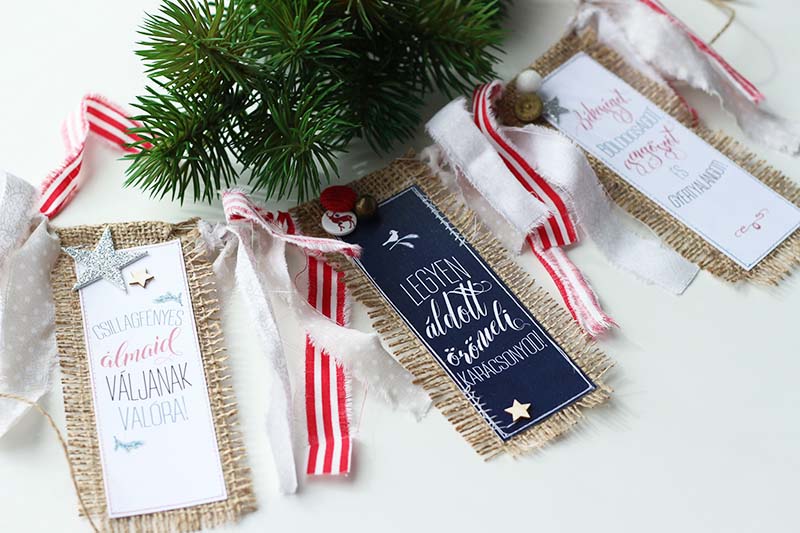 Készítettem még egy stílusban hasonlóan rusztikus zászlófüzért is. Zsákvászon alapra felvarrtam varrógéppel a Csillagfényes álmaid kártyákat, majd a közöket a gömbökből megmaradt csíkokat töltöttem ki, egyszerűen csak rákötöttem. Díszítésként még mini csillagokat, és régi gombokat is ragasztottam a papír alapokra. Egy igazán klasszikus színekben pompázó füzér született, amelyet már alig várom, hogy a minél előbb a lakásunkban is elhelyezzek. J