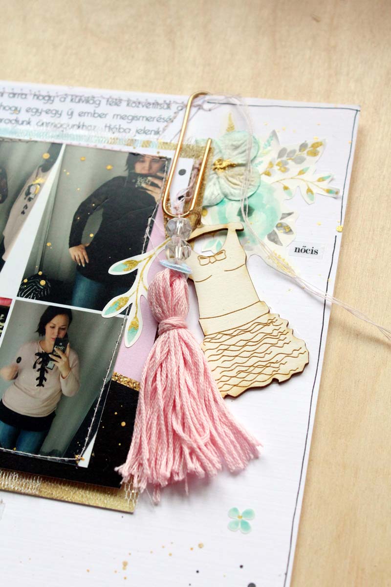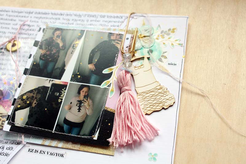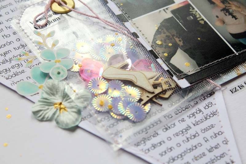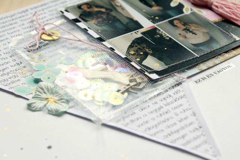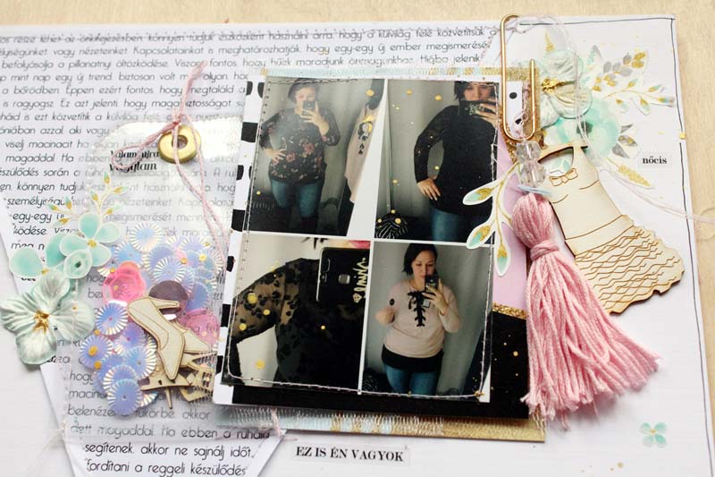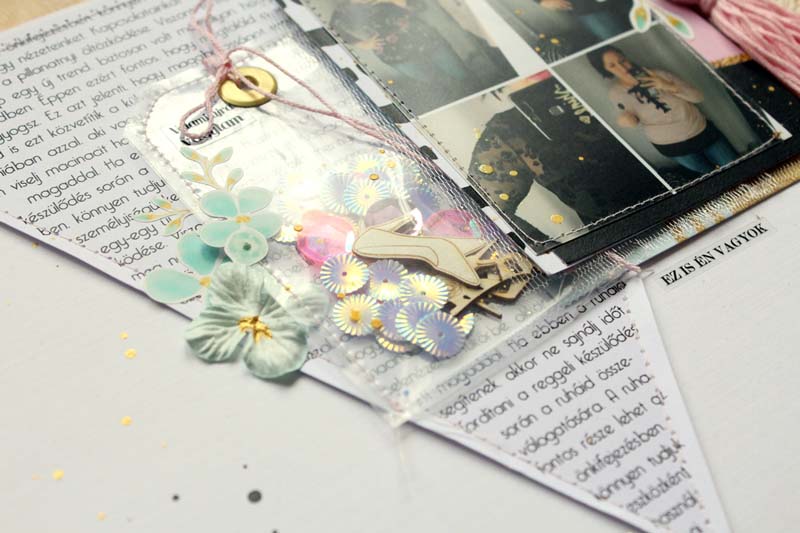 Alapnak egy 12”-es fehér kartonra vartam fel a szöveges papírból kivágott háromszöget, alulra pedig egy csík selyempapírt „raffoltam”. A készlet többi papírját rétegzéshez használtam a fotóm alá. Átlátszó fóliából a flitterekkel és a cipő csipikkel egy tag alakú shaker boxot varrtam, ezt használtam a fotóm mellett fő díszítőelemnek. Ezen kívül rengeteg matricát is elhasználtam a készletből, illetve egy nagy bojt is született a hímzőfonalból. Fekete pacák és az icipici virág matricák teszik az oldalt teljessé.