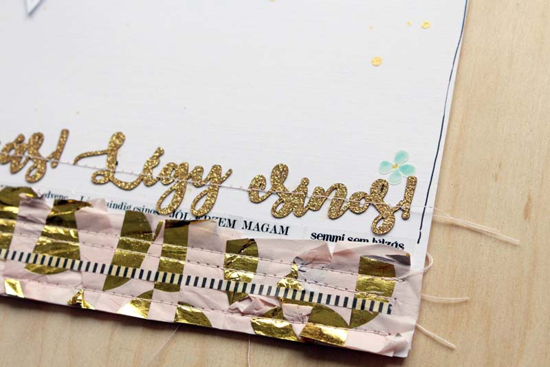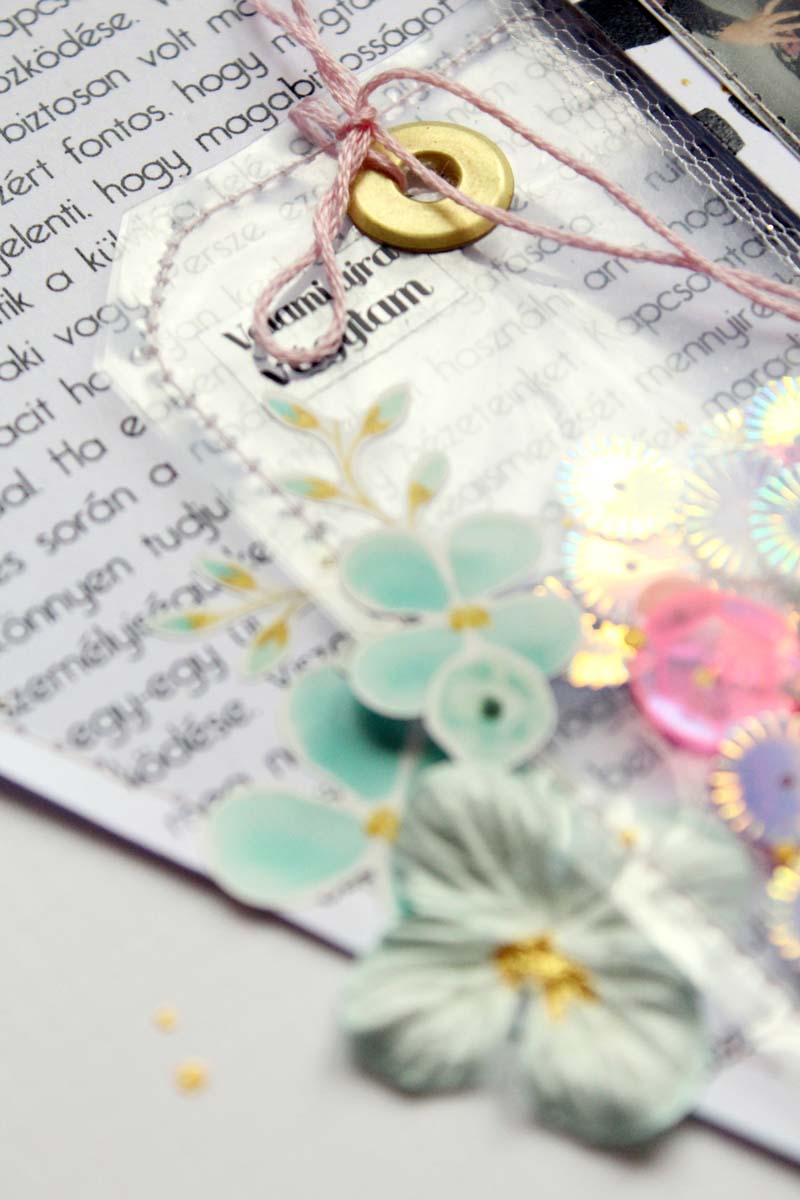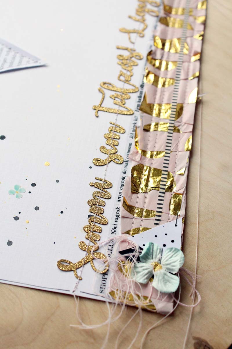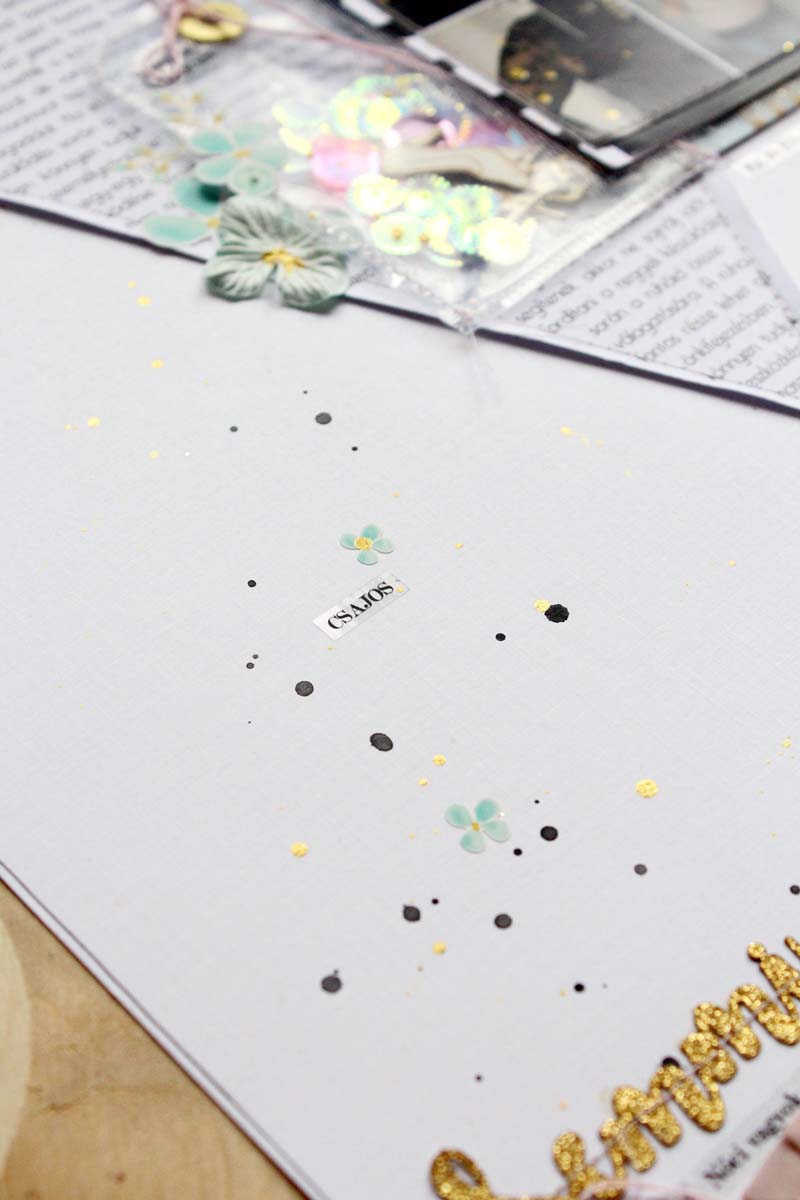 Alapnak egy 12”-es fehér kartonra vartam fel a szöveges papírból kivágott háromszöget, alulra pedig egy csík selyempapírt „raffoltam”. A készlet többi papírját rétegzéshez használtam a fotóm alá. Átlátszó fóliából a flitterekkel és a cipő csipikkel egy tag alakú shaker boxot varrtam, ezt használtam a fotóm mellett fő díszítőelemnek. Ezen kívül rengeteg matricát is elhasználtam a készletből, illetve egy nagy bojt is született a hímzőfonalból. Fekete pacák és az icipici virág matricák teszik az oldalt teljessé.