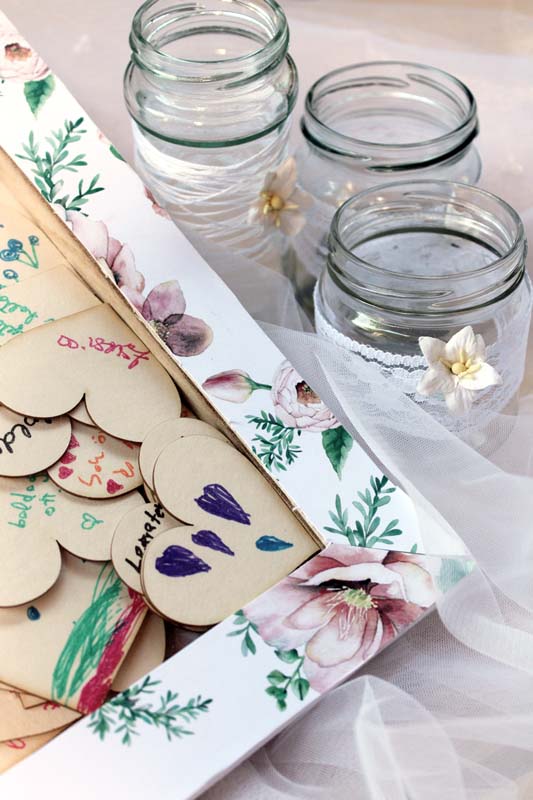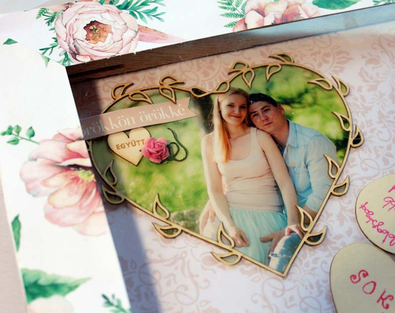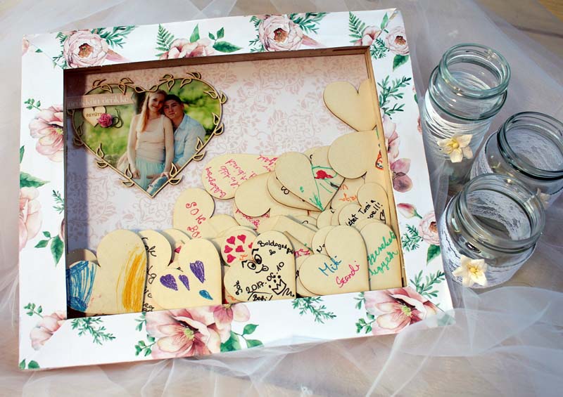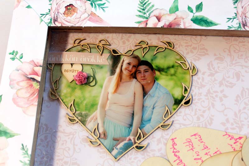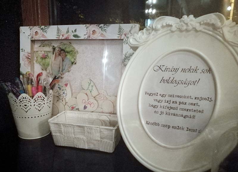 Hát pont így voltam én az unokahúgom esküvőjével! Két meglepetéssel is készültem nekik a nagy napra, olyan meglepetéssel, amivel ők is csak a helyszínen szembesültek. 🙂 Ebből az egyik ez a rendhagyó "vendégkönyv volt". Egy feszített vásznat megfordítottam, és a mély részbe beleragasztottam egy papírt, erre ráragasztottam a szerelmesek fotóját egy szívben, majd picit dekoráltam. Körbe, a keretre sörkartont rögzítettem, úgy, hogy felül középen kihagytam egy kb tíz centis helyet. Erre ragasztottam az átlátszó fóliát, majd rá a virágos papír keretet. Így egy "perselyt" kaptam, amibe a násznép bedobálhatta a szivecskéket, amikre felírta jókivánságait, illetve a kisebbek rajzolhattak, színezhettek is az este folyamán.