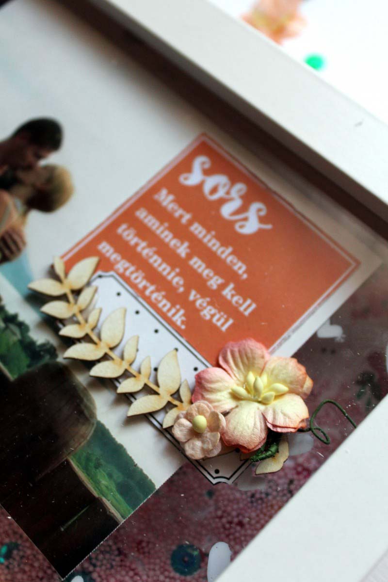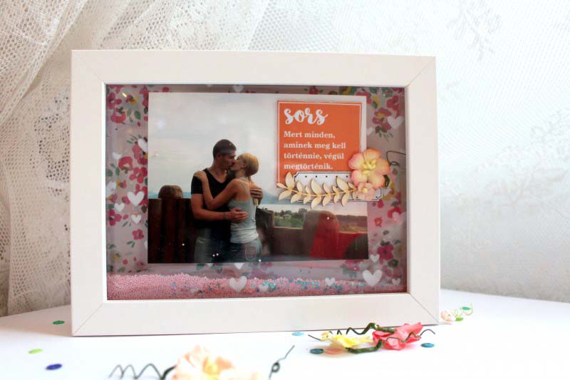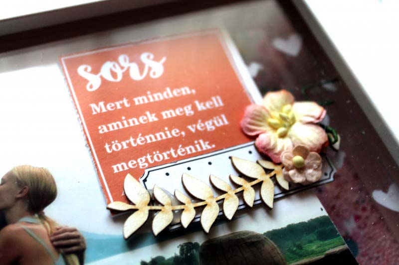 Arra gondoltam, hogy egy fotót kap, képkeretben, de nem én lennék, ha itt le is álltam volna. Neeem, én mindig variálok. Úgy gondoltam kihasználom a képkeretem mélységét, és egy amolyan shaker box szerűségnek használom majd. Ezért mértere vágtam egy átlátszó fóliát, a szíves stencillel gessot vittem fel rá, majd megvártam míg megszárad. Azt szerettem volna, ha a fotó középen lebeg, a semmiben, és körülötte szivecskék vannak, ezért a fotót kisebbre vágtam, és felragasztottam a fóliára. A fénykép jobb felső, üres részére címkét ragasztottam a sorsszerűségről, egy pici virágot, és ágacskát.