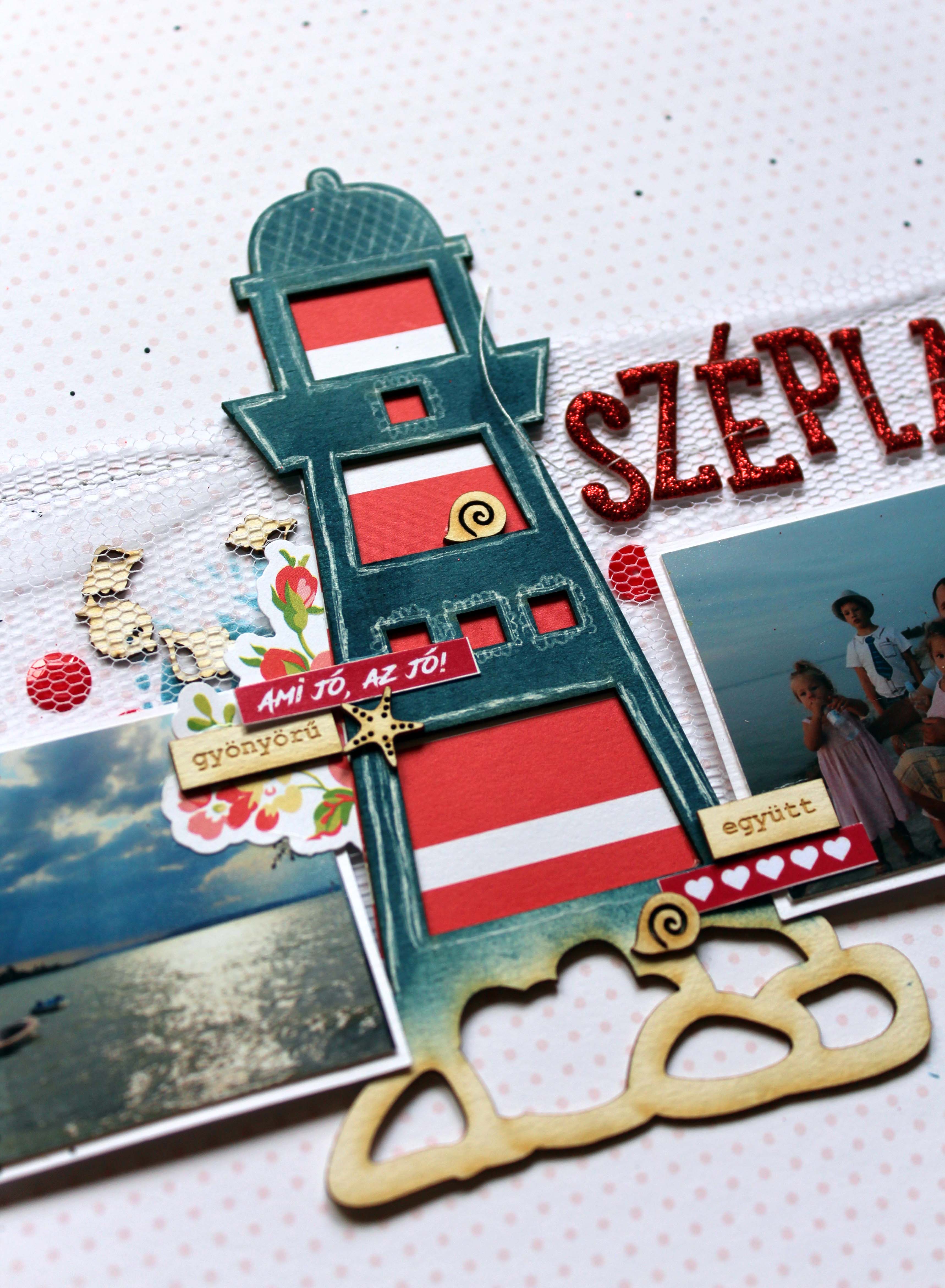 A kis cuki tengeriherkentyűktől és a "shaker boxtól" nem bírtam elszakadni a múltkori oldalam óta, ezért tüllből felvarrtam egy csíkot, és ebbe rejtettem a kis kagylókat és néhány piros flittert. Az oldalam középpontjába a nagy világítótornyok egyikét tettem, a fotóimat pedig eköré rendeztem el.