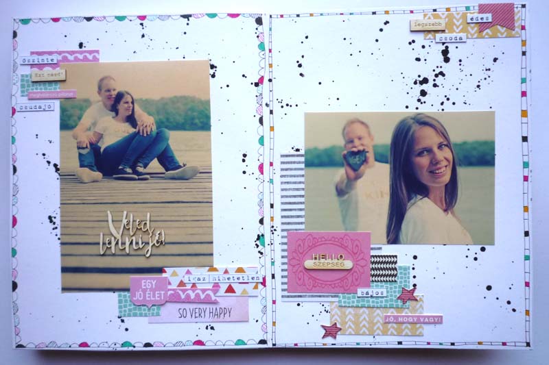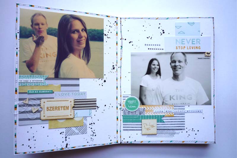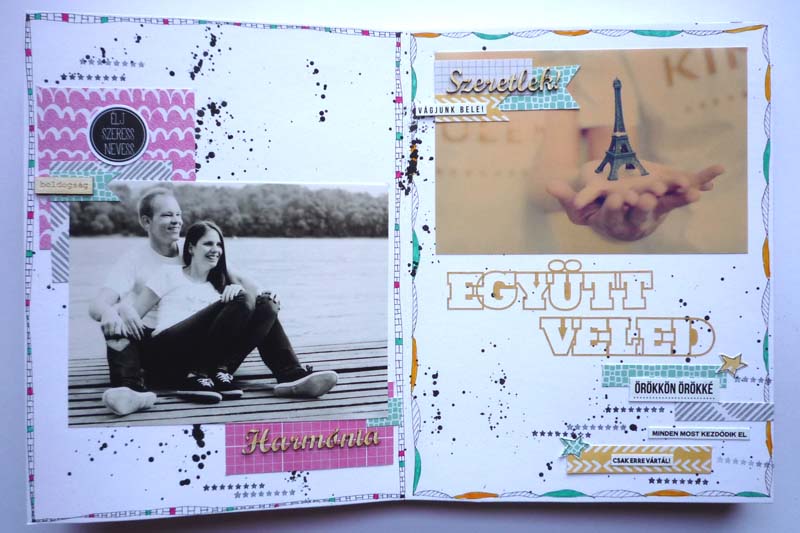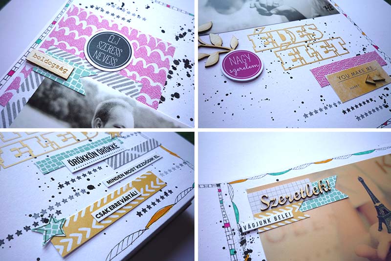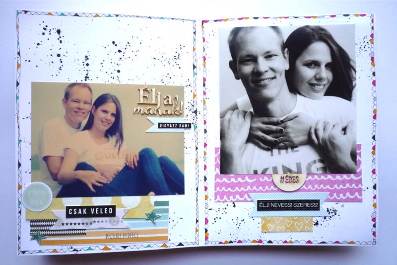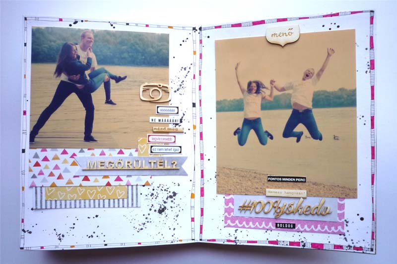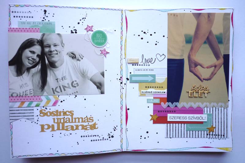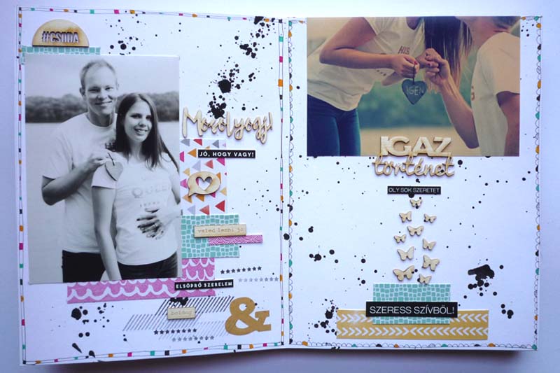 Néhány képet színesben, néhányat fekete fehérben hívattam elő. Színes doodlekat használtam a fröcskölés mellett, és sok- sok címfeliratot. A kedvenceim az arany pauszosak voltak. A matricás feliratokat legtöbbször külön papírra felragasztottam előbb és úgy rögzítettem az oldalakon, hogy vastagságuk legyen.