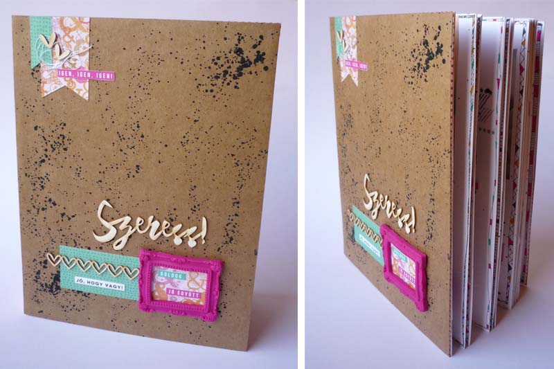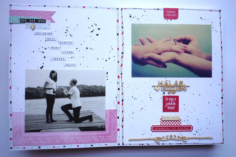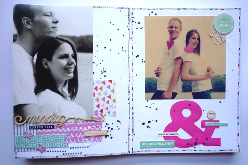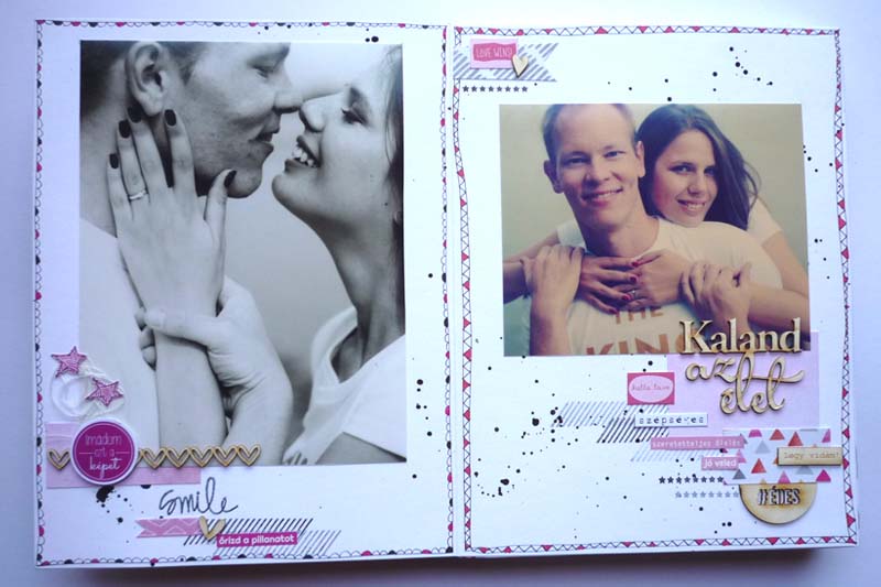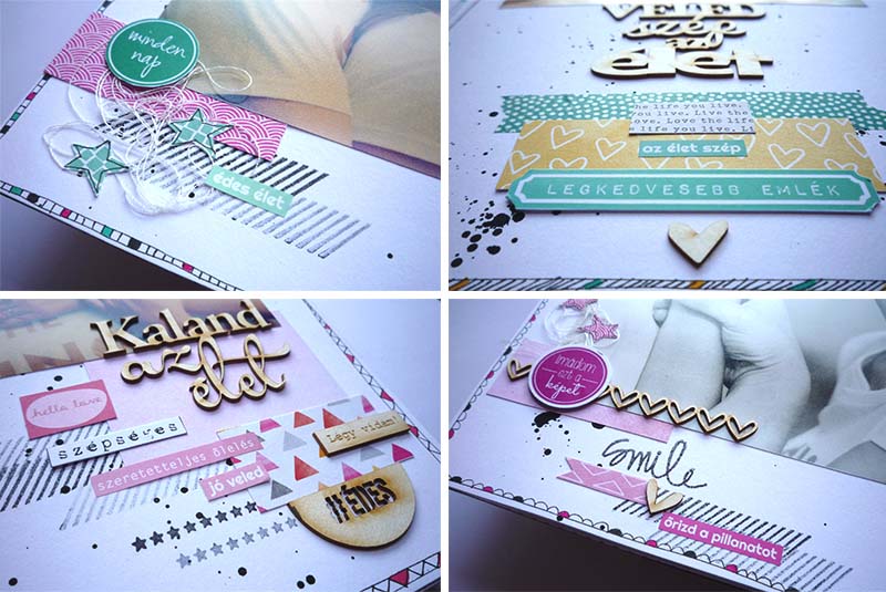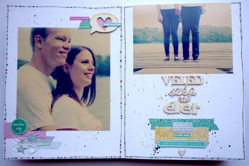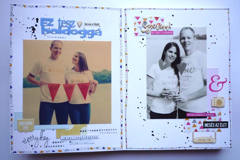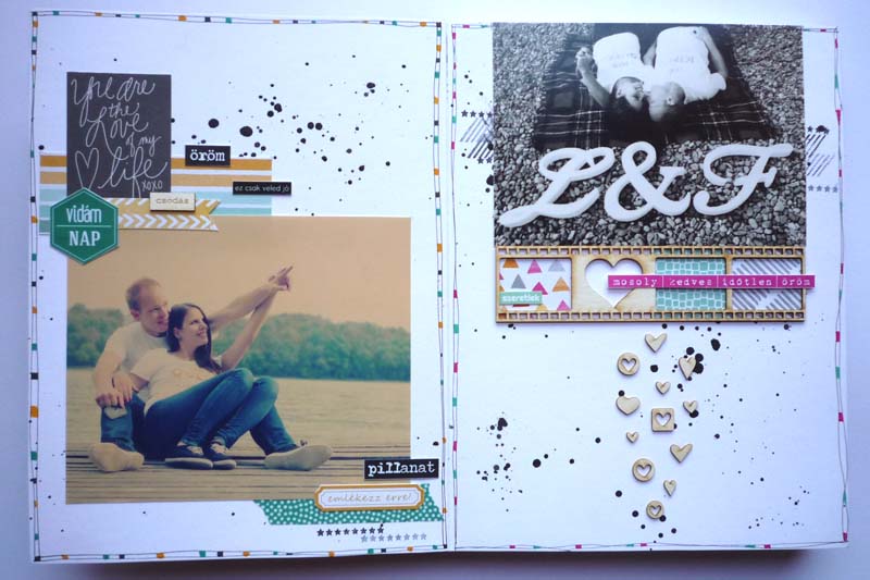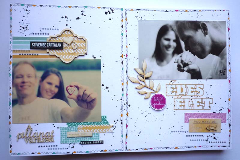 Néhány képet színesben, néhányat fekete fehérben hívattam elő. Színes doodlekat használtam a fröcskölés mellett, és sok- sok címfeliratot. A kedvenceim az arany pauszosak voltak. A matricás feliratokat legtöbbször külön papírra felragasztottam előbb és úgy rögzítettem az oldalakon, hogy vastagságuk legyen.