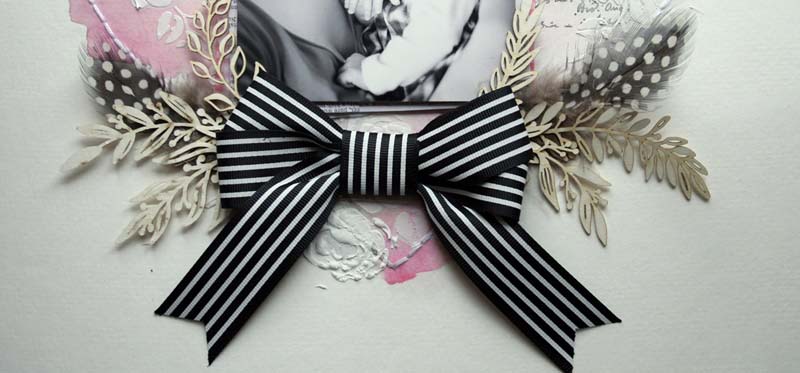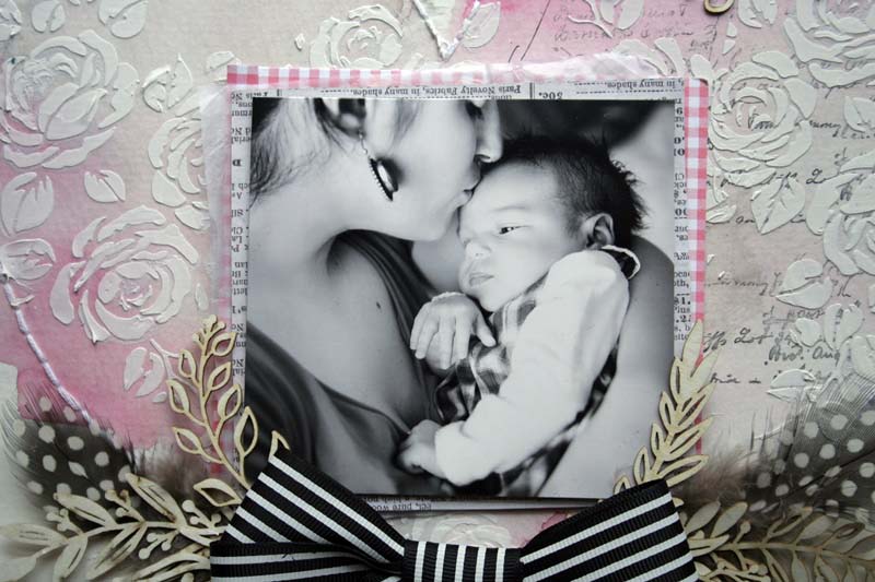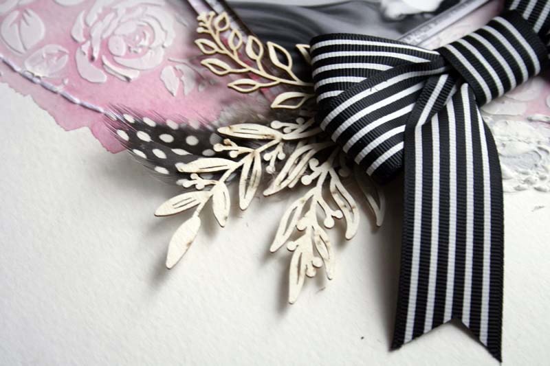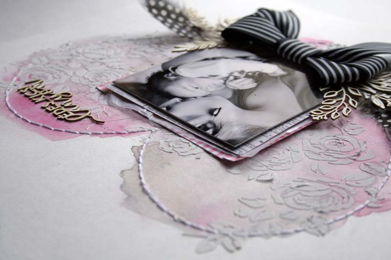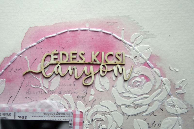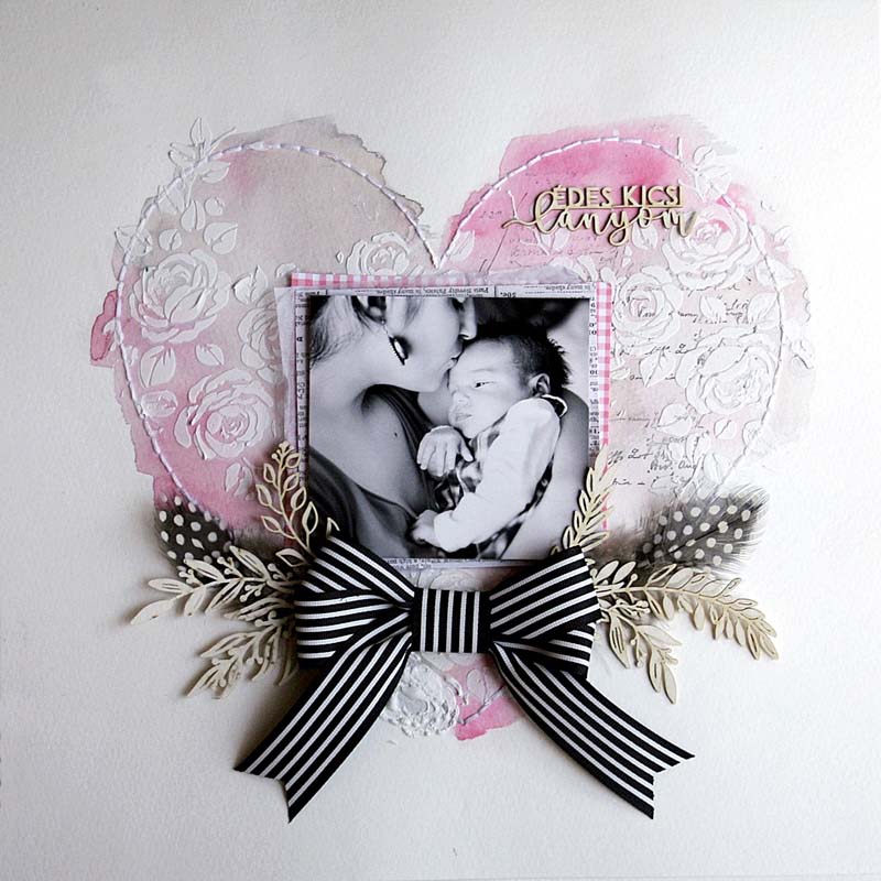 Akvarell papírra felrajzoltam egy óriási szívet, vastag tűvel kilyuggattam, majd ecoline festékkel maszatoltam egy alapot. Írásos bélyegzővel nyomdáztam, aztán fehér hímzőcérnával, kézzel körbe varrtam, majd ezzel a romantikus hangulatú Tim Holtz stencillel gessoztam. A fotó alá eltartással három különböző mintájú papírt rétegeztem. Bár fagyos ágak az elnevezése a leveles chipboardoknak, ezt ragasztottam a fotó alatti részre, az alá egy-egy gyöngytyúk tollat, középre pedig egy széles, csíkos masnit kötöttem.