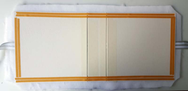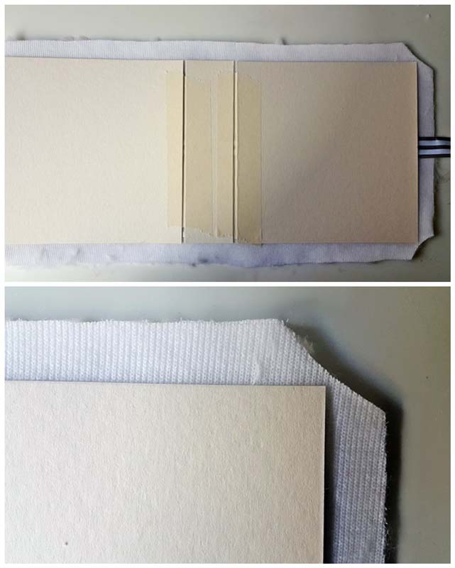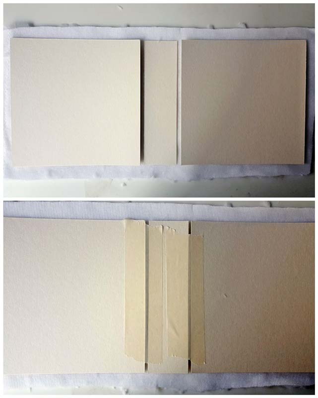 Első lépésként vágtam egy 5 cm-es gerincet és összerögzítettem a kartonokat maszkolószalaggal, hagyva 3-4 mm rést közöttük.