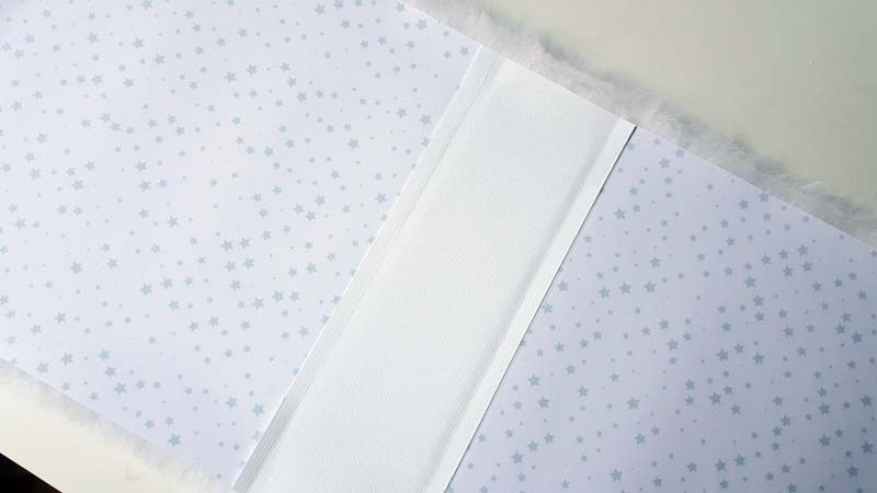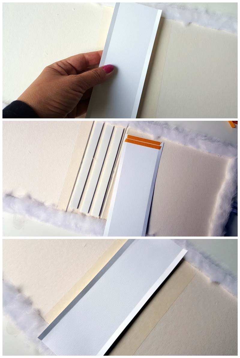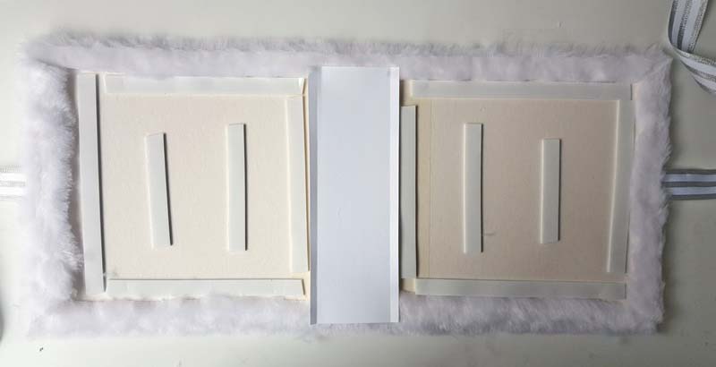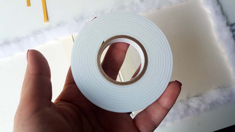 Egy 7 cm széles, 19 cm hosszú papírcsíkot bebigeltem a szélétől 1-1 cm-re (tehát a borító hajtásvonalát előre megcsináltam a papírcsíkomon is), a karton gerincre sűrű csíkokban 3D ragasztócsíkot húztam, a fehér papír két rövidebb végére kétoldalast tettem, mert ott rögzül majd a szőrökhöz, utána rányomtam a papírcsíkomat.